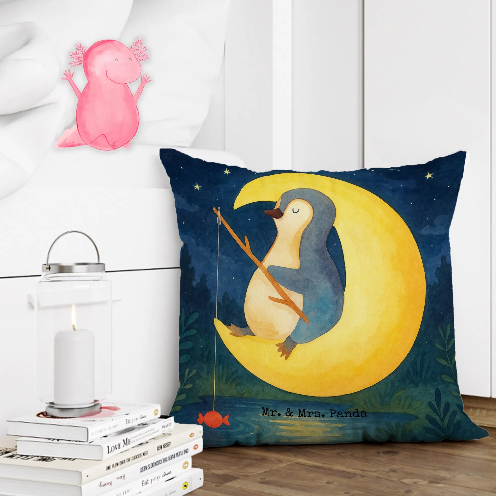 Stell dir vor, wie eine kleine Pinguinfamilie am Fenster des Gästezimmers lächelt – zumindest ein einzelner Pinguin hat es sich auf der Mondsichel bequem gemacht und angelt mit seiner kleinen Angel Sterne, an deren Ende ein Bonbon baumelt. Dieses Motiv bringt eine herzliche, beruhigende Stimmung in jeden Raum, besonders ins Gästezimmer, wo Besucher sofort spüren, dass sie willkommen und behütet sind. Mr. & Mrs. Panda haben bewusst eine sanfte, warme Bildsprache gewählt: Der Pinguin wirkt geborgen, die Szene ist voller ruhiger Details, die zum Verweilen einladen. Gäste, die abends nach Hause kommen, werden durch dieses Bild ein wenig leichter den Alltag abstreifen und sich wohlfühlen. Gleichzeitig ist das Motiv ideal, um Kindern oder Freunden eine angenehme Nachtruhe zu schenken – die Kombination aus Mondsichel, angelführenden Sternen und dem süßen Bonbon ist wie ein kleines Gute-Nacht-Geschenk. Es passt perfekt auf Poster, Kissen oder als Wandtattoo und macht aus dem Gästezimmer einen Ort, an dem man gern bleibt und sanft einschläft.