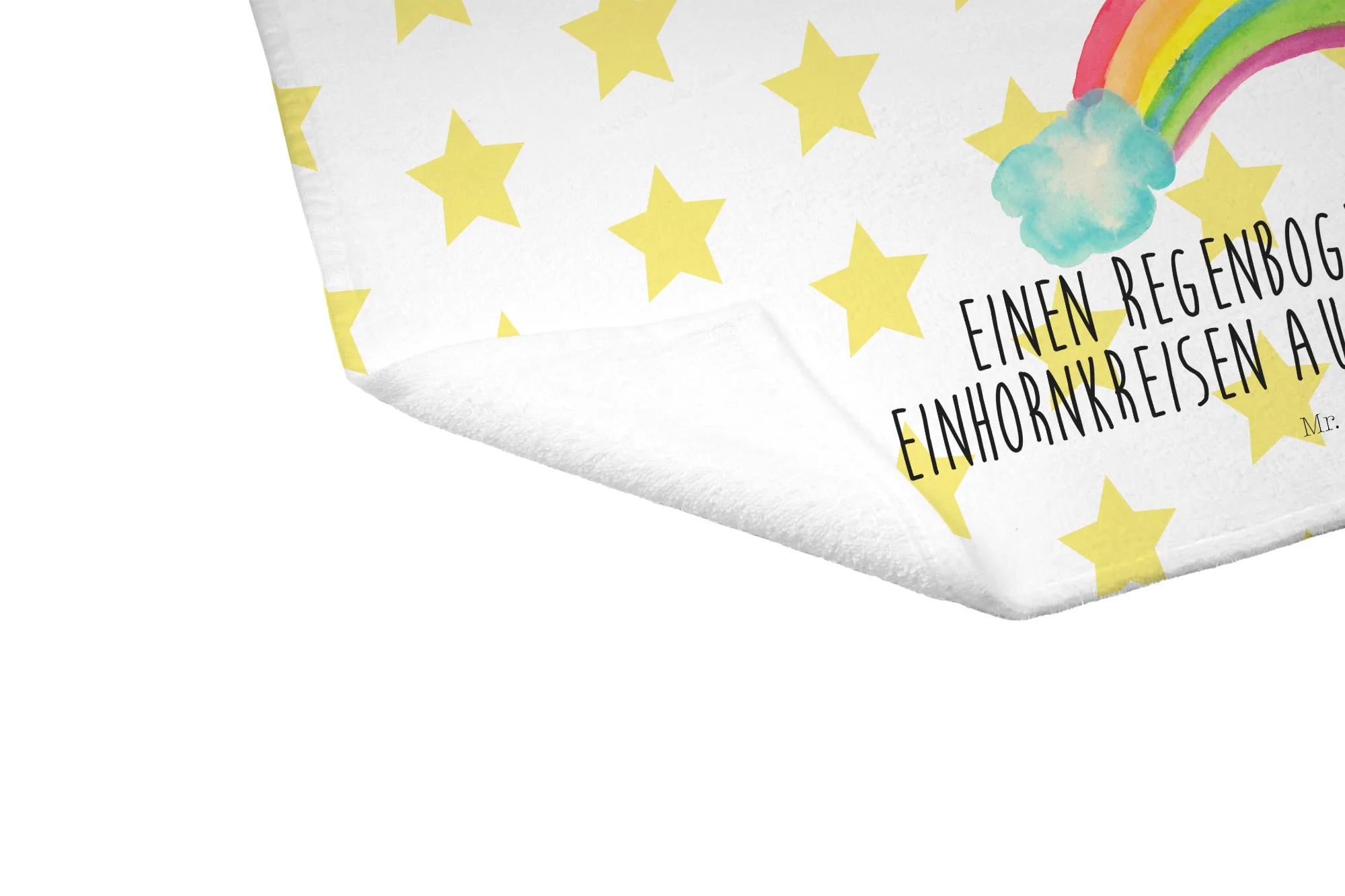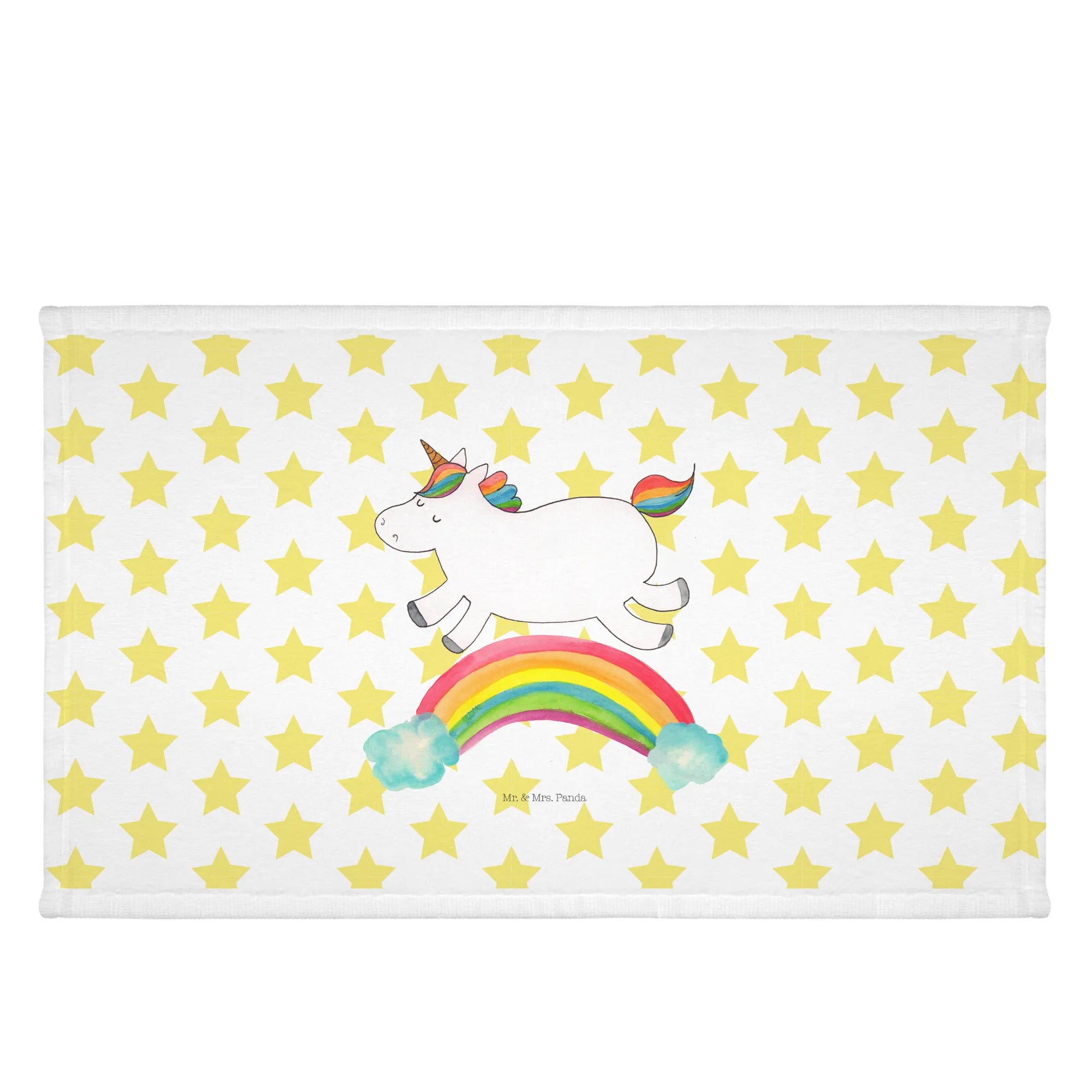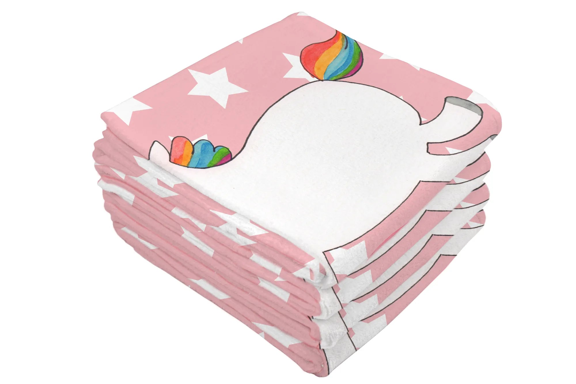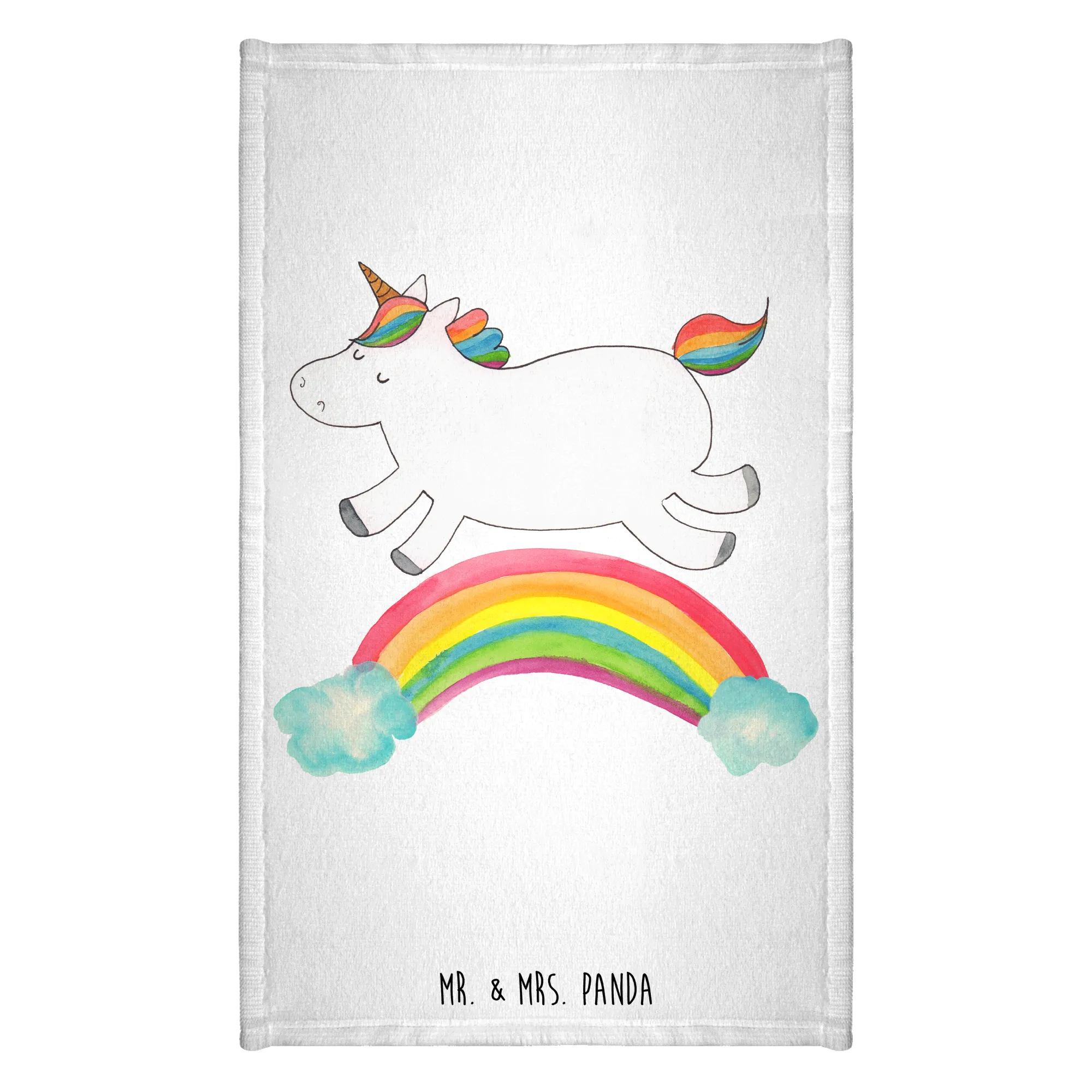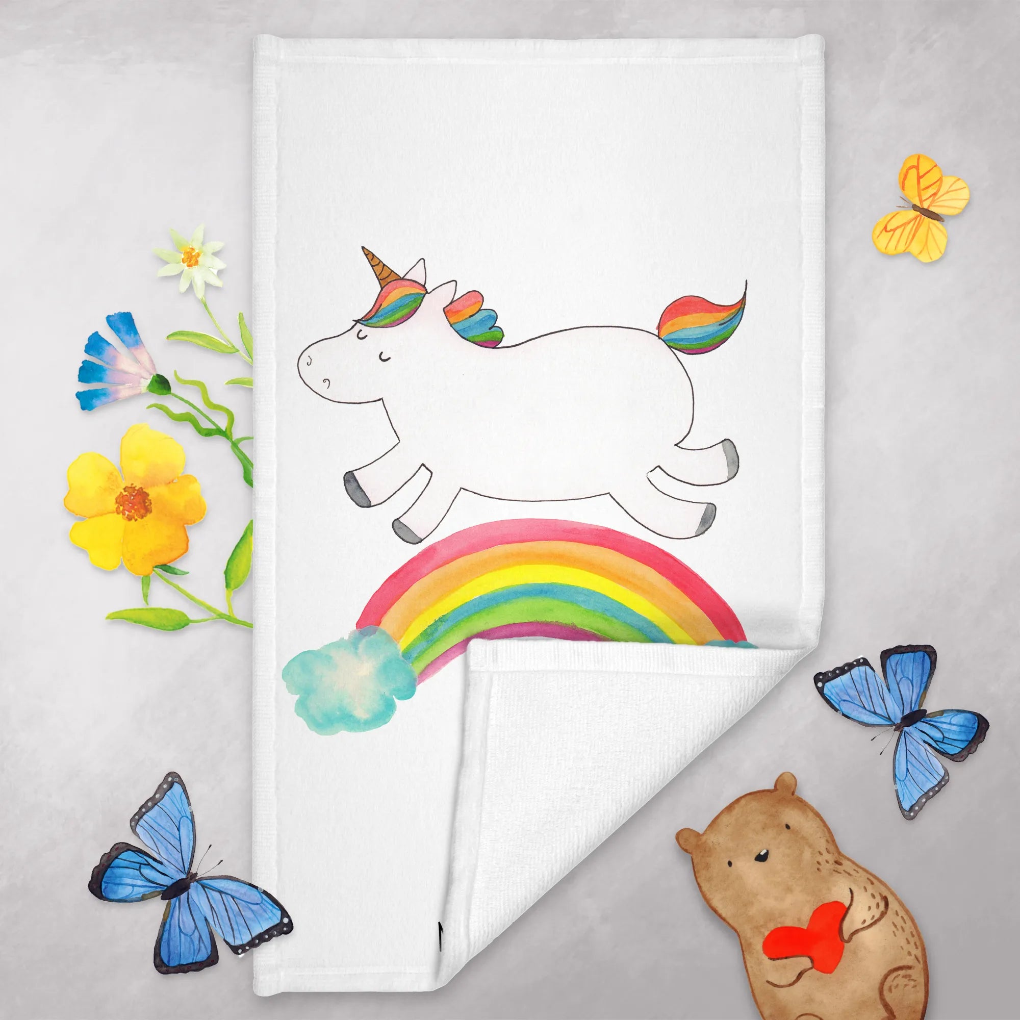 Entdecke das wunderschöne Gästehandtuch mit dem zauberhaften Einhorn-Motiv Regenbogen von Mr. & Mrs. Panda. Dieses Handtuch ist nicht nur ein Blickfang, sondern bringt auch Freude und Farbe in jedes Badezimmer. Die strahlenden Farben des Einhorns und des Regenbogens werden garantiert das Herz deiner Gäste höher schlagen lassen! Hergestellt aus einer flauschigen Baumwollmischung, ist dieses Gästehandtuch extra weich und sanft zur Haut.