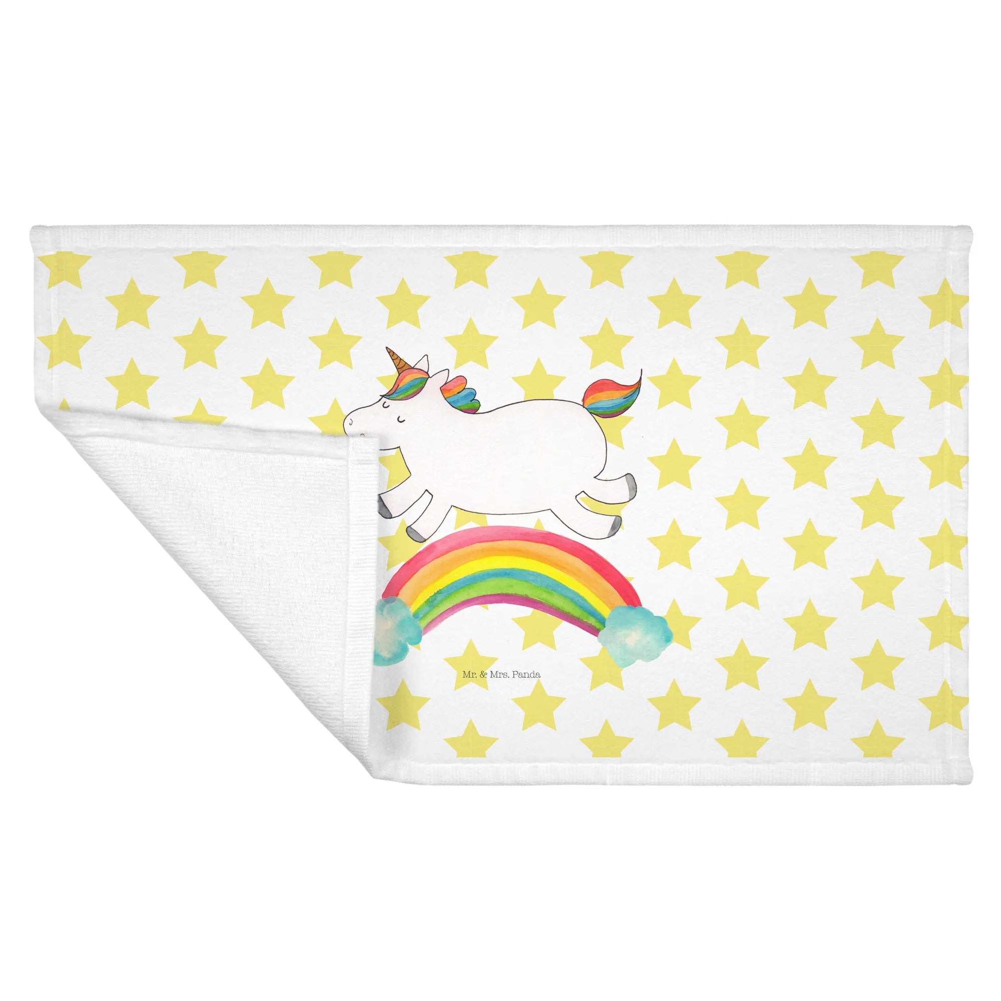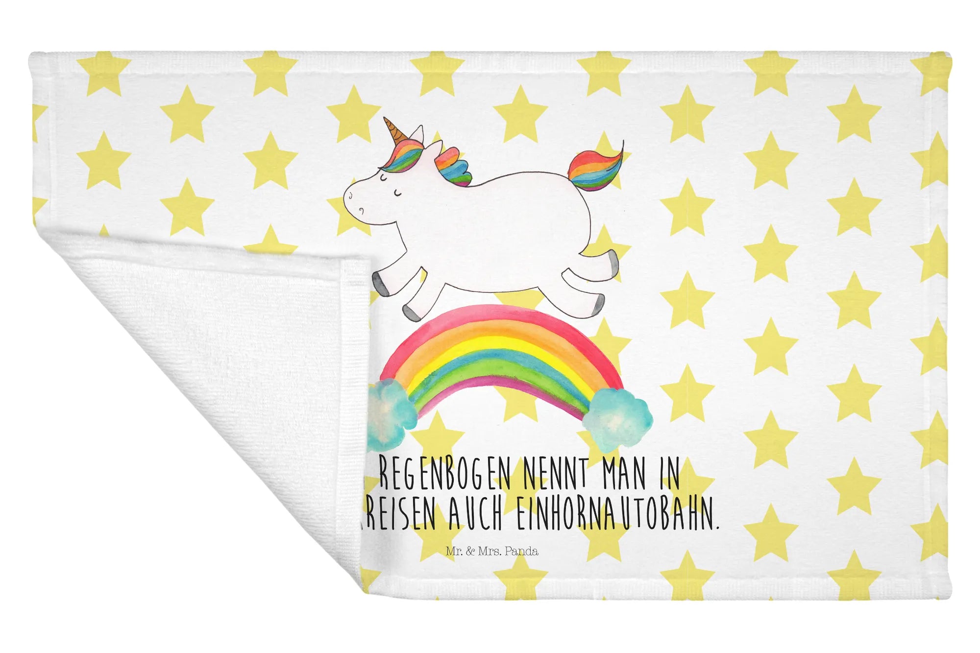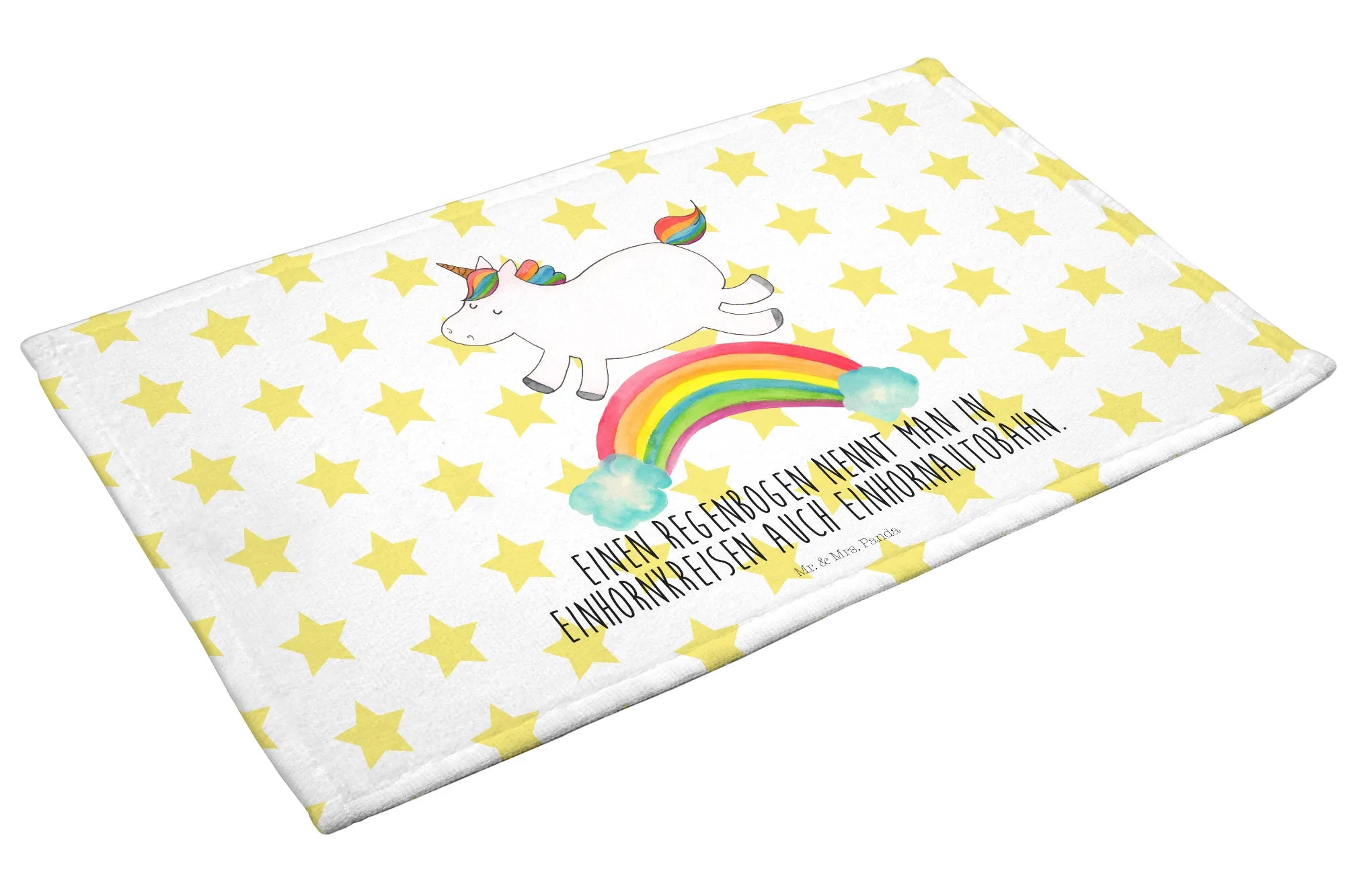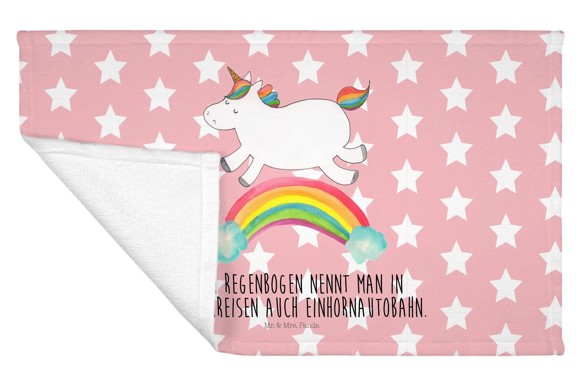 Suchst du das perfekte Geschenk für Freunde oder Familie, die die magische Welt der Einhörner lieben? Unser zauberhaftes Gästehandtuch mit dem aufmunternden Motiv "Einhorn Regenbogen" aus der Einhorn - Kollektion von Mr. & Mrs. Panda ist genau das Richtige!