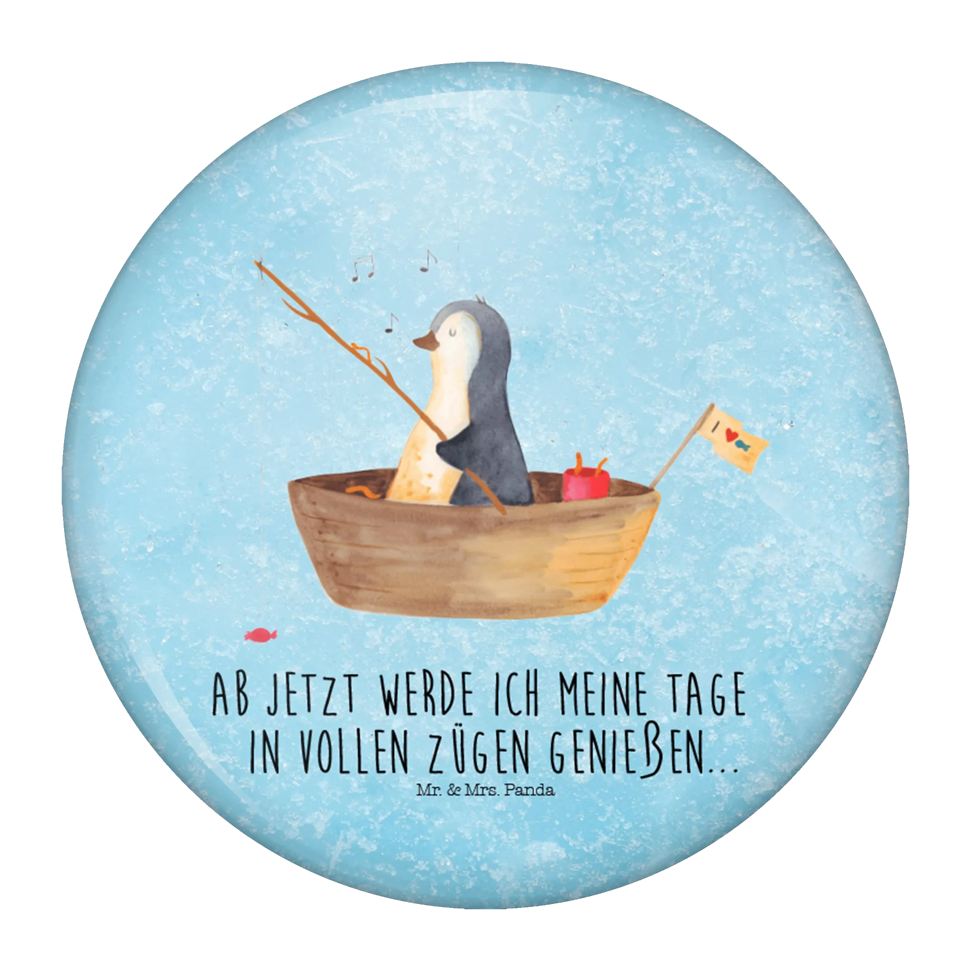 Dieses handgezeichnete Aquarellmotiv zeigt einen niedlichen Pinguin in einem kleinen Angelboot, der mit Bonbons an der Angel das Leben genießt. Der begleitende Spruch „Ab jetzt werde ich meine Tage in vollen Zügen genießen...“ macht den Button zu einer liebevollen Erinnerung an Neuanfänge, Lebenslust und kleine Freuden.