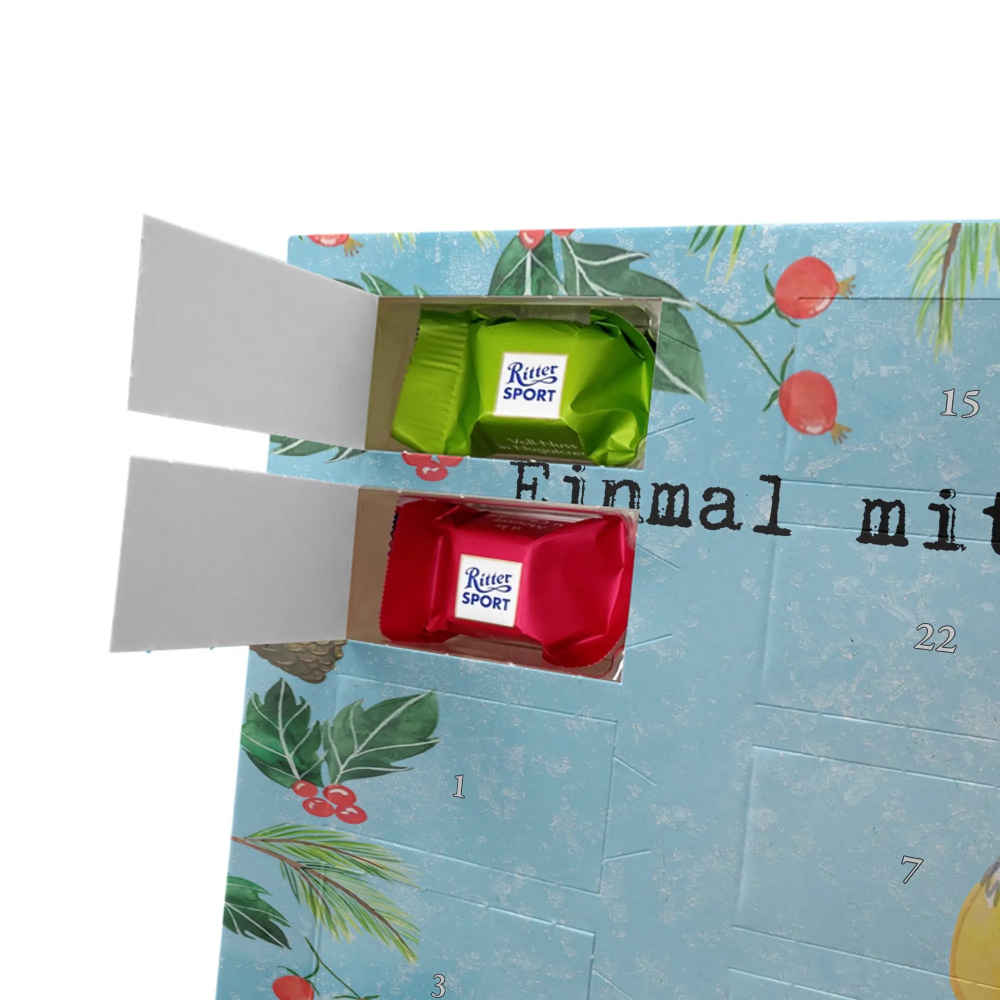 Unser zauberhafter Schoko Adventskalender von Mr. & Mrs. Panda bringt dir die Vorweihnachtszeit mit Liebe und Charme. Der Kalender ist bedruckt mit wunderschönen Motiven & Sprüchen von Mr. & Mrs. Panda und überrascht dich hinter jedem Türchen. Er ist nicht personalisierbar und kommt in brillanter Druckqualität mit seidenmatter Oberflächenveredelung – so sehen die Illustrationen einfach himmlisch aus. Die Seitenflächen sind ebenfalls bedruckt, sodass sich der Kalender von allen Seiten hübsch präsentiert. Maße: 325 mm x 225 mm x 27 mm. Eine besondere Eigenschaft: Du kannst ihn aufgehängt oder aufgestellt verwenden, je nachdem, wo er bei dir am besten zur Geltung kommt. Gefüllt ist der Kalender mit Ritter Sport Schokowürfeln in leckeren Geschmacksrichtungen: Mousse au Chocolat, Schoko Crisp, Voll-Nuss in Nougatcreme, Karamell Duo, Joghurt und Erdbeer-Joghurt. Bitte beachte: Es handelt sich um einen Kalender gefüllt mit Ritter Sport Schokolade, nicht um einen Kalender der Marke Ritter Sport. Perfekt als Geschenk für Freunde, Familie oder einfach als süße Belohnung für dich selbst – dieser Schoko Adventskalender macht die Adventszeit jeden Tag ein bisschen süßer.