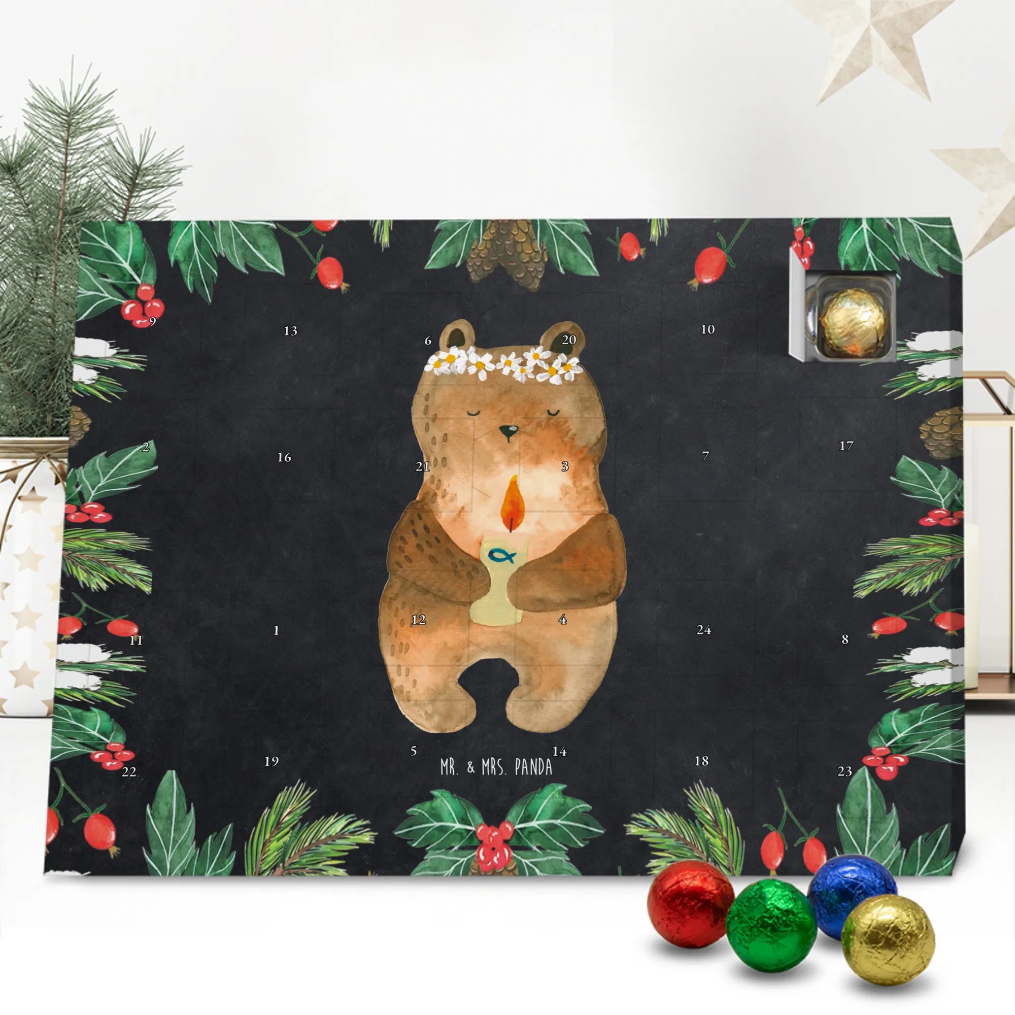 Wunderschöner Adventskalender mit Schokolade von Mr. & Mrs. Panda – für alle, die Advent und Design lieben. Dieser Adventskalender mit Schokolade ist liebevoll bedruckt mit wunderschönen Motiven & Sprüchen von Mr. & Mrs. Panda und ist nicht personalisierbar, aber mit viel Liebe zum Detail gefertigt. Brillante Druckqualität mit seidenmatter Oberflächenveredelung sorgt für einen edlen Look, und die bedruckten Seitenflächen geben dem Kalender eine besondere Optik. Maße: 233 mm x 178 mm x 24 mm. Dank seiner stabilen Verarbeitung kannst du ihn aufstellen oder ganz einfach aufhängen – Besonderheit: kann aufgehängt oder aufgestellt werden. Gefüllt mit MARKENNAMEN Schokolade und leckeren Schokoladenkugeln, bringt er jeden Tag ein kleines Glückserlebnis. Wichtige Hinweise: (Kann Spuren von Haselnüssen, Mandeln, Gluten und Soja enthalten!), bitte kühl und trocken lagern. Ob als Geschenk, Mitbringsel oder Adventsdeko – dieser Kalender zaubert ein Lächeln und sorgt für gemütliche Vorfreude. Viel Freude beim Entdecken der süßen Überraschungen wünscht dir Mr. & Mrs. Panda!