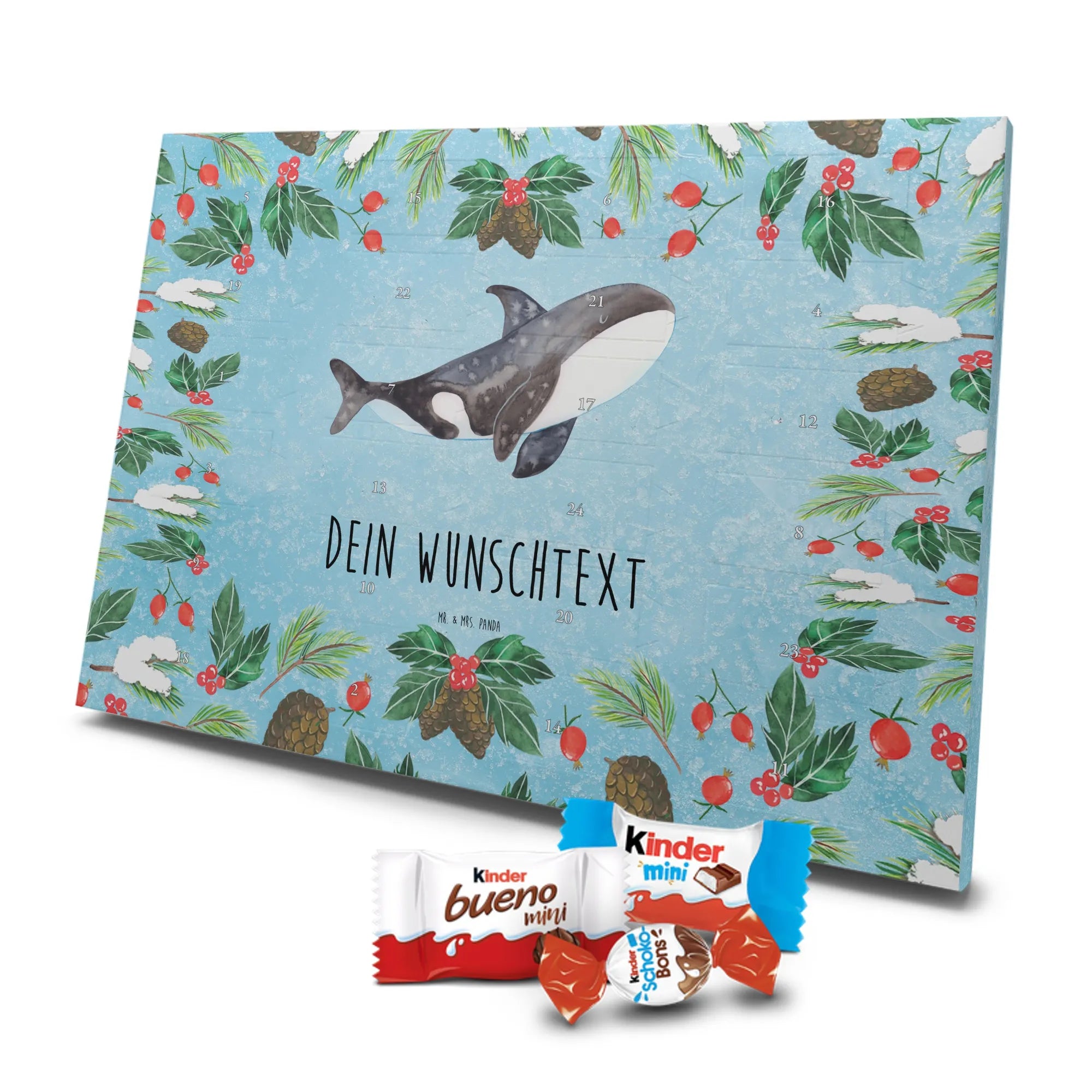 Adventskalender mit Namen von Mr. & Mrs. Panda – die süße und persönliche Art, die Adventszeit zu feiern! Dieser liebevoll gestaltete Adventskalender ist bedruckt mit zauberhaften Motiven & Sprüchen von Mr. & Mrs. Panda und lässt sich ganz nach deinem Geschmack personalisieren: Dein Name oder ein kurzer Wunschtext wird hochwertig aufgedruckt. Die brillante Druckqualität kombiniert mit einer seidenmatten Oberflächenveredelung sorgt für ein edles Finish, und auch die Seitenflächen sind hübsch bedruckt, sodass das Design aus jedem Blickwinkel wirkt. Besonders praktisch: Du kannst den Kalender aufhängen oder einfach aufstellen – perfekt für den Weihnachtsbaum, die Wand oder das Regal. Der Kalender ist gefüllt mit Celebrations und beinhaltet 24 leckere Füllungen in 8 verschiedenen Sorten wie Maltesers, Mars, Snickers, Twix, Milky Way, Bounty, Galaxy und Galaxy Caramel – für jeden Tag bis Heiligabend eine kleine Freude. Maße: 325 mm x 225 mm x 27 mm – handlich und trotzdem großzügig genug für die Schoko-Überraschungen. Verschenke Vorfreude und Persönlichkeit in einem – ideal für Freunde, Familie oder als liebevolle Aufmerksamkeit für dich selbst.