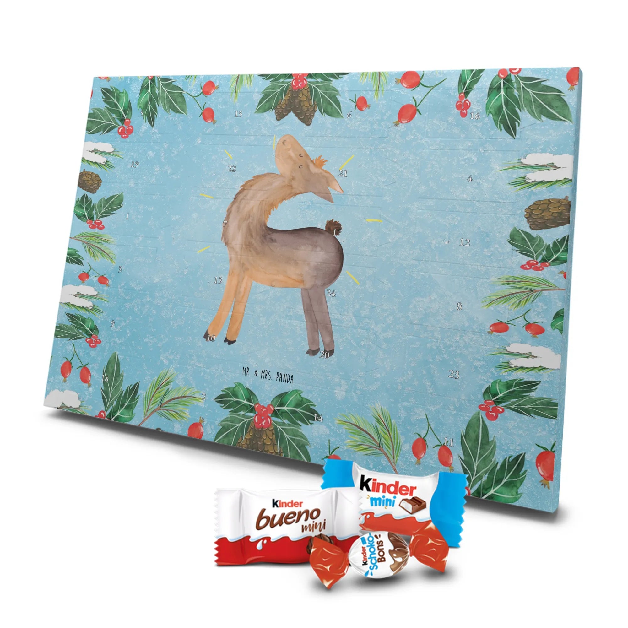Adventskalender mit Schokolade – liebevoll gestaltet von Mr. & Mrs. Panda. Dieser niedliche Kalender ist bedruckt mit wunderschönen Motiven & Sprüchen von Mr. & Mrs. Panda und trotzdem nicht personalisierbar. Du bekommst brillante Druckqualität mit seidenmatter Oberflächenveredelung sowie bedruckte Seitenflächen, die dem Kalender ein hochwertiges Finish verleihen. Maße: 355 mm x 245 mm x 11 mm. Ein tolles Extra: kann aufgehängt oder aufgestellt werden, sodass du ihn flexibel platzieren kannst. Gefüllt mit Markenname Schokolade: Adventskalender gefüllt mit kinder® Schokolade. Inhalt: kinder® Schoko-Bons, kinder® Bueno mini und kinder® Schokolade mini. Die 24 Türchen sind liebevoll befüllt und sorgen jeden Tag für ein Lächeln – ideal für Kinder, Paare oder als kleines Geschenk für Freunde. Robust und dekorativ zugleich, bringt dieser Adventskalender süße Vorfreude in dein Zuhause. Verschenke oder genieße eine adventliche Zeit voller kleiner, schokoladiger Überraschungen!