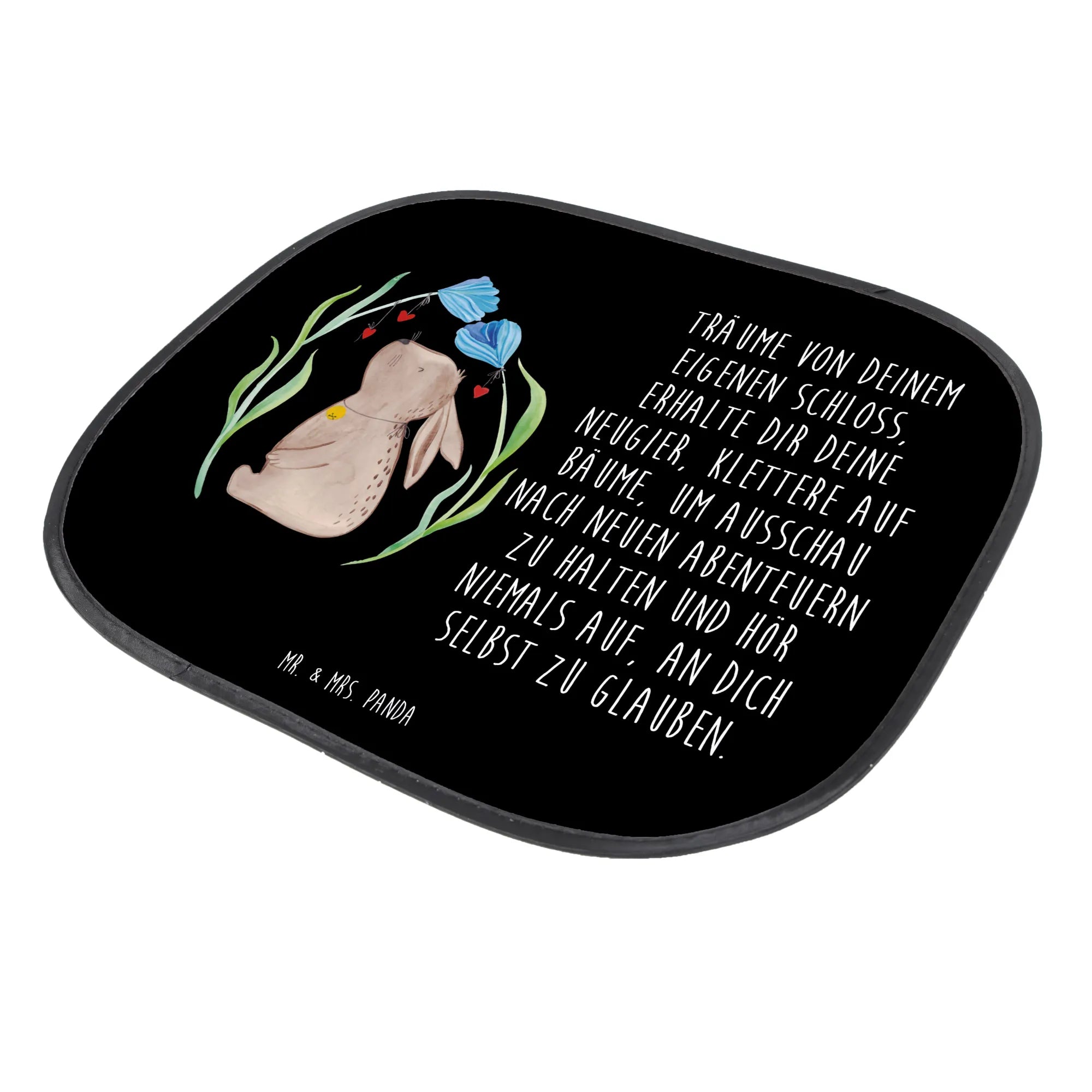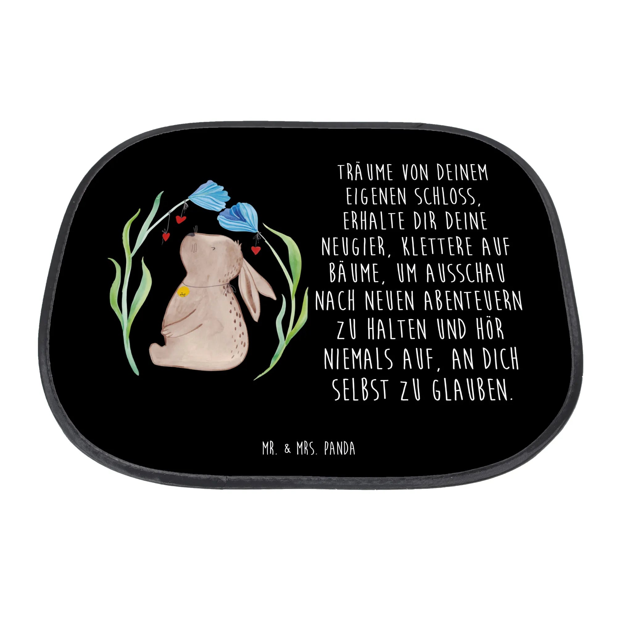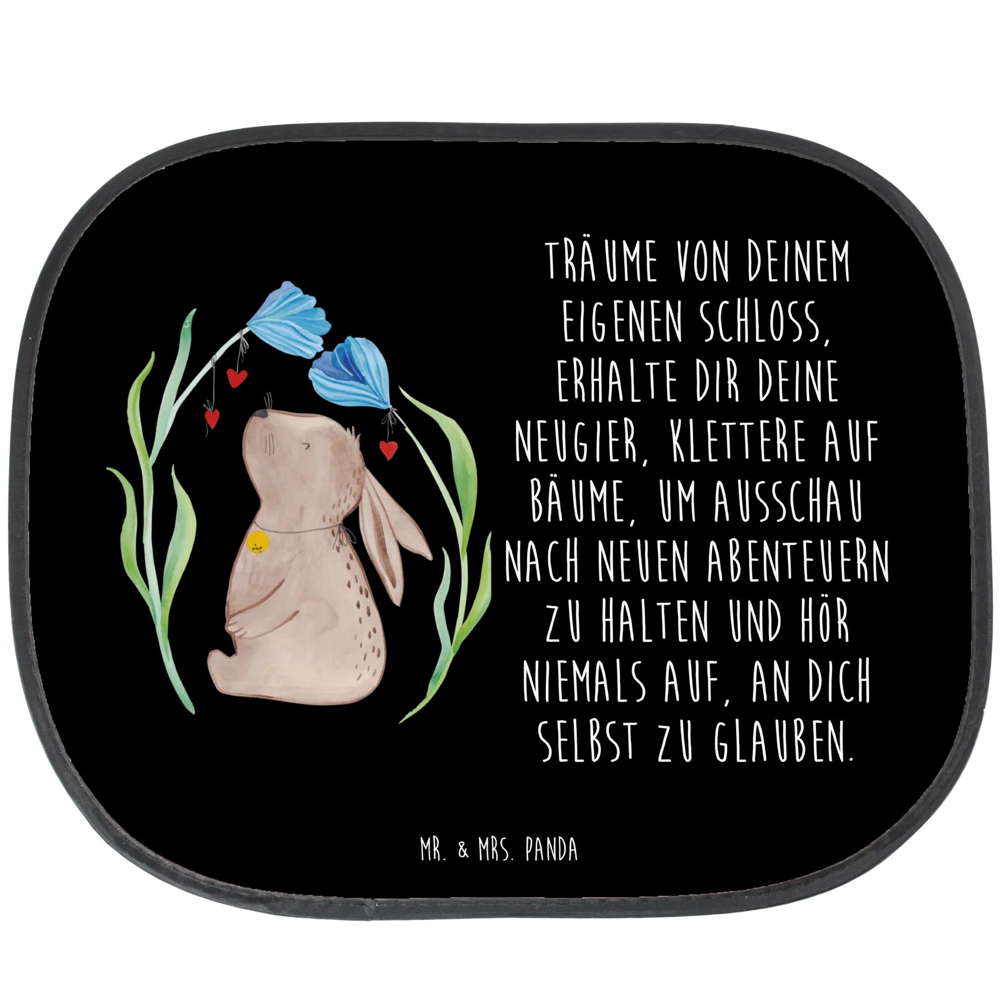 Unser Sonnenschutz Auto von Mr. & Mrs. Panda verbindet Funktion mit Fröhlichkeit: der süße Hase mit Glöckchen sitzt zwischen bunten Blumen auf einem schwarzen Hintergrund und bringt Osterstimmung in dein Auto. Ideal als Kindersonnenschutz Auto, Autofenster Sonnenschutz oder Seitlicher Sonnenschutz für die Seitenscheibe.