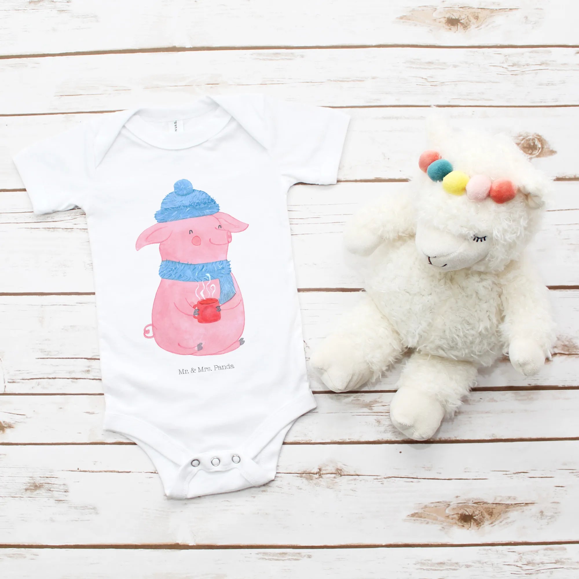 Dieser liebevoll gestaltete Babystrampler bringt nicht nur ein Lächeln auf dein Gesicht, sondern auch auf die Gesichter der Kleinen und ihrer Eltern. Das fröhliche, rosa Schweinchen, das eine warme Mütze mit Pompon und einen passenden Schal trägt, hält in den Händen eine dampfende Tasse - es symbolisiert die Gemütlichkeit der Wintermonate und die Vorfreude auf die Weihnachtszeit.
