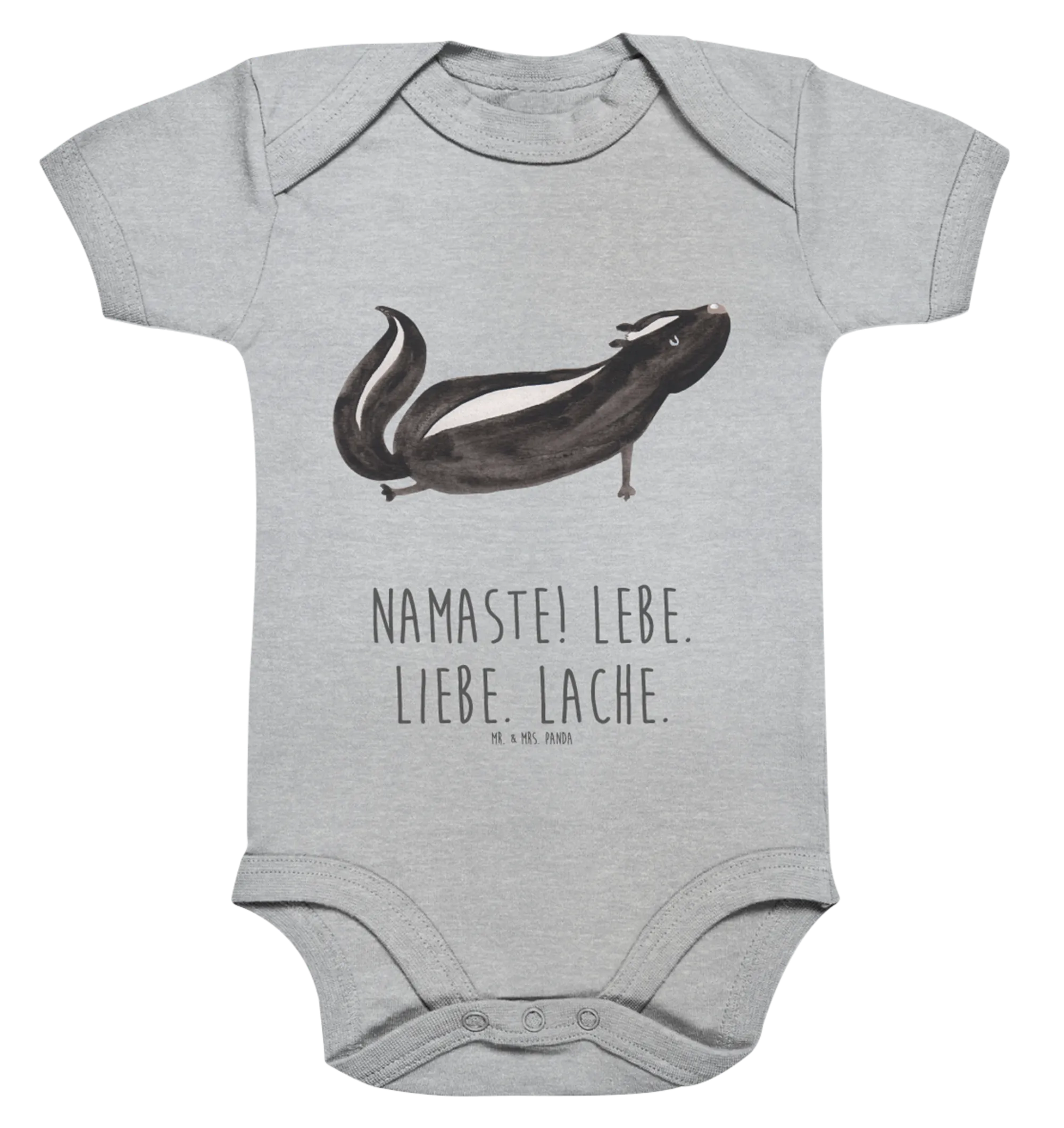 Der Body eignet sich hervorragend für die Baby-Erstausstattung und ist ein ideales Geschenk zur Geburt oder Taufe. Das süße Stinktier, das Yoga praktiziert, wird nicht nur Eltern, sondern auch andere Familienmitglieder zum Schmunzeln bringen. Der fröhliche Spruch „Namaste! Lebe. Liebe. Lache.“ illustriert die liebevolle Botschaft, die hinter jedem Mr. & Mrs. Panda Produkt steckt.