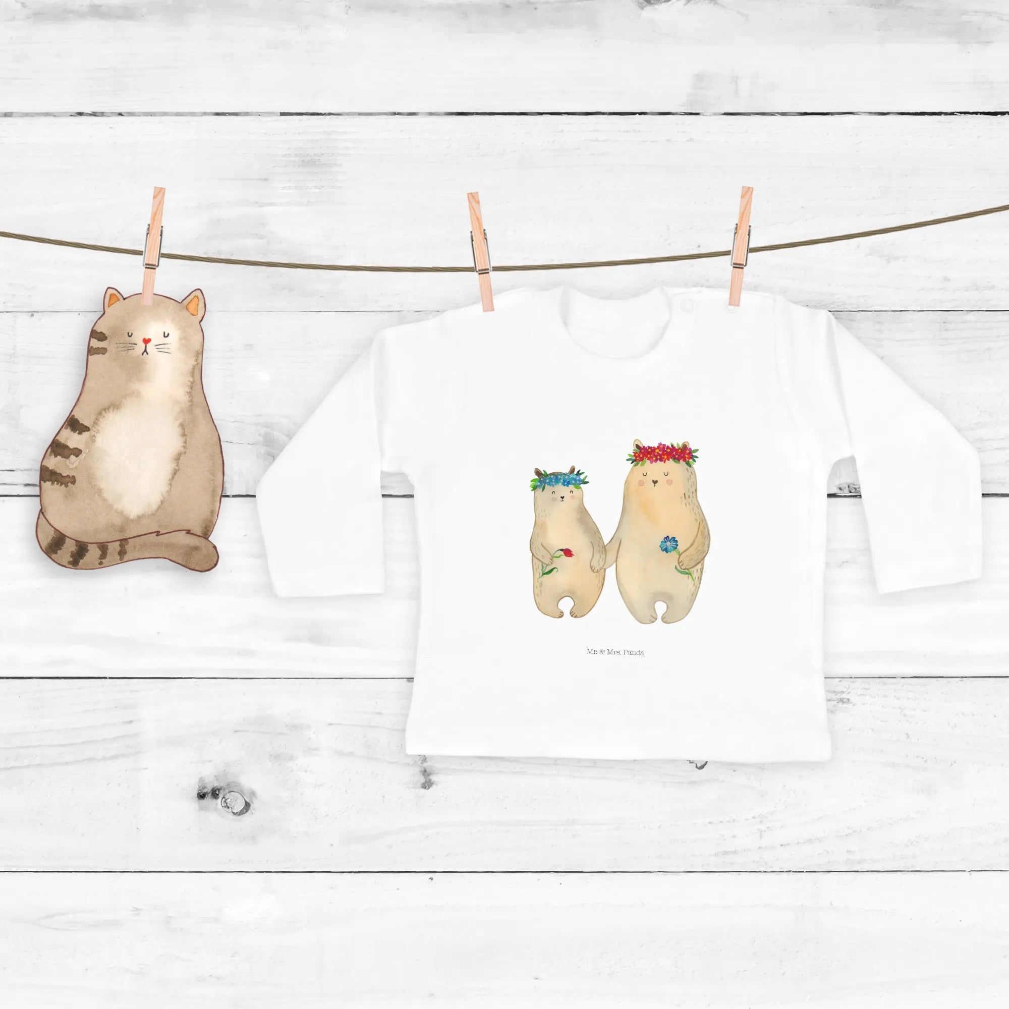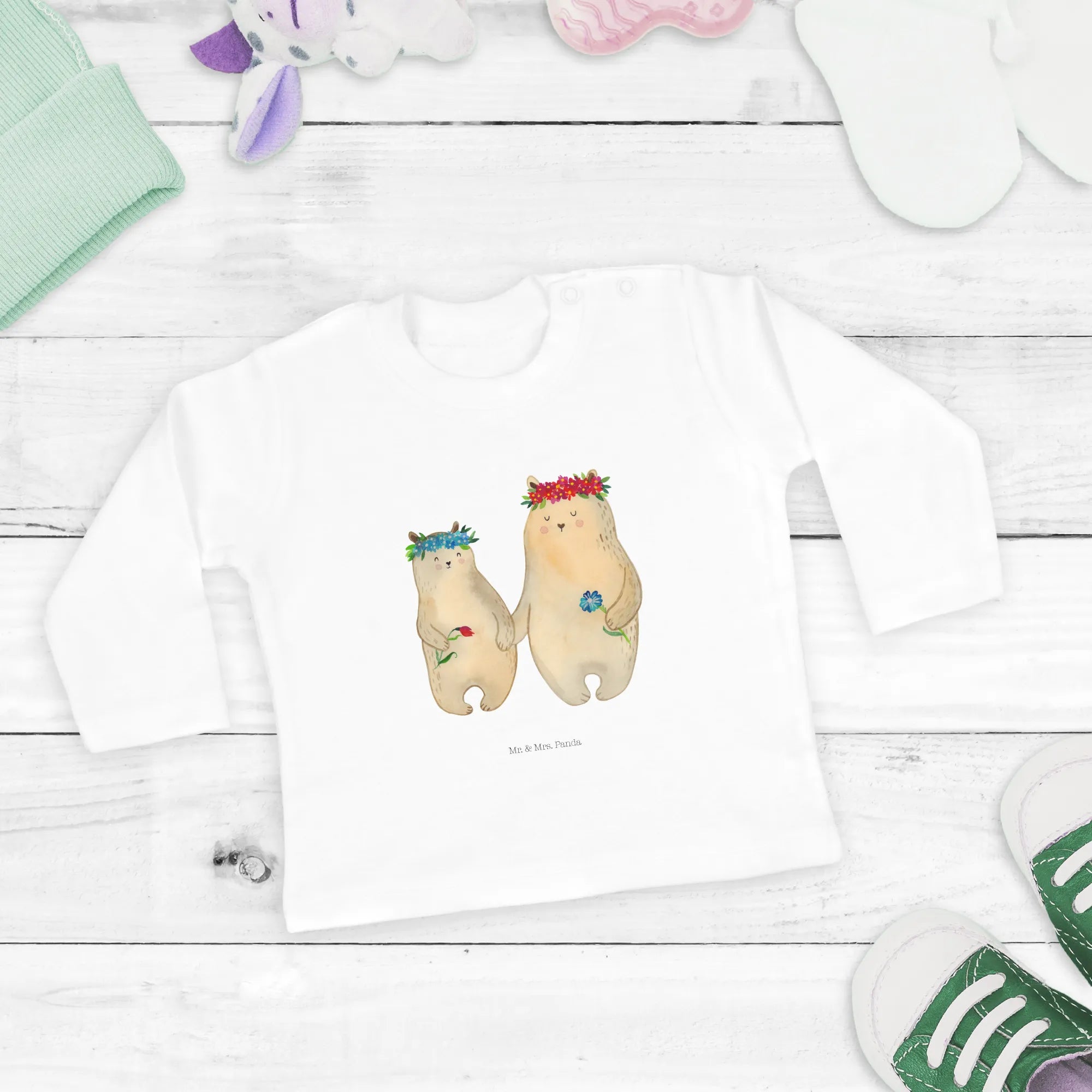 Schaffe unvergessliche Erinnerungen und zeige deinen Liebsten, wie wertvoll sie sind. Jedes Shirt wird mit Liebe und Sorgfalt von Mr. & Mrs. Panda designed und eignet sich bestens als Geschenk oder zum Selberbehalten. Überrasche deine Familie und hol dir dieses zauberhafte Baby Langarmshirt mit den Bären mit Blumenkranz nach Hause!