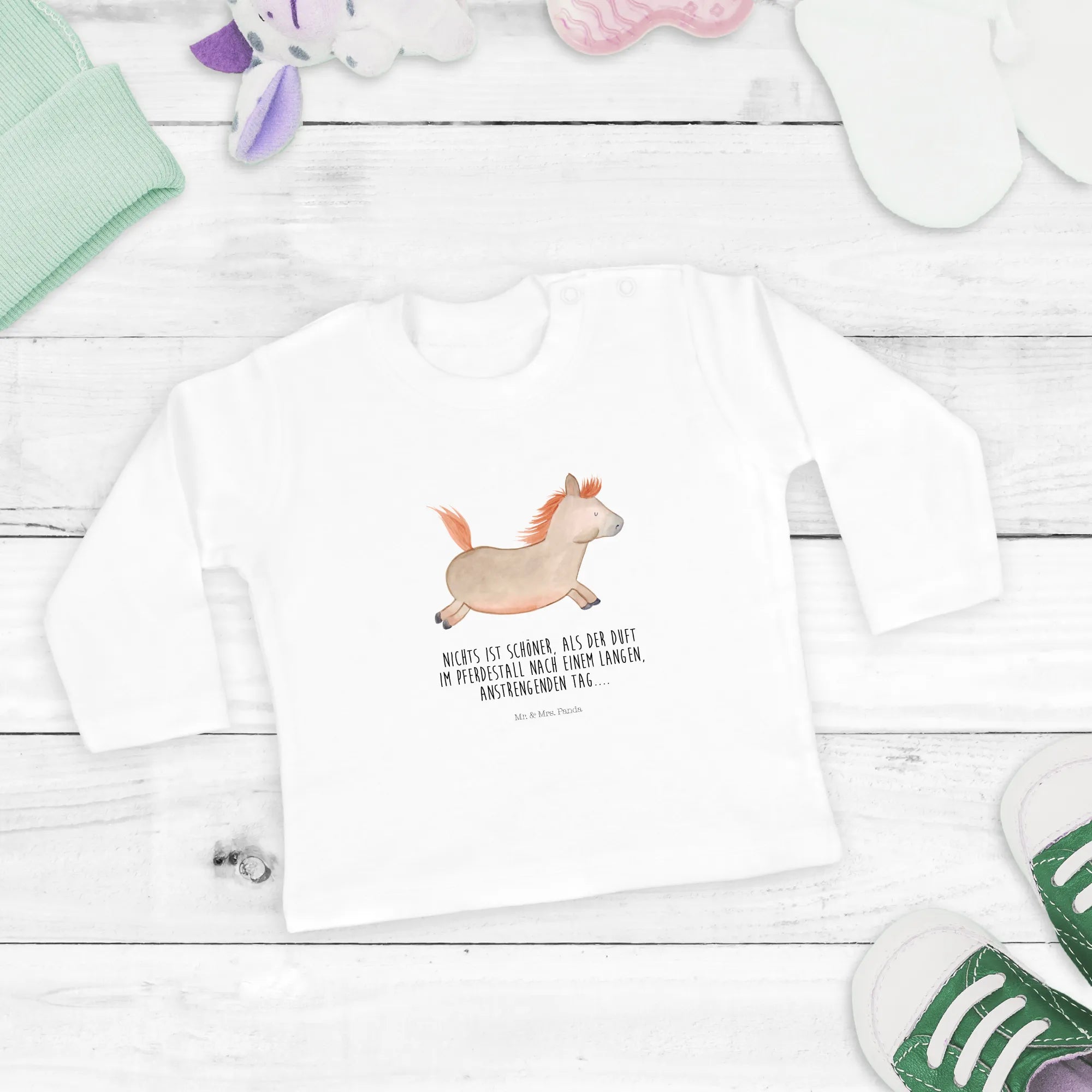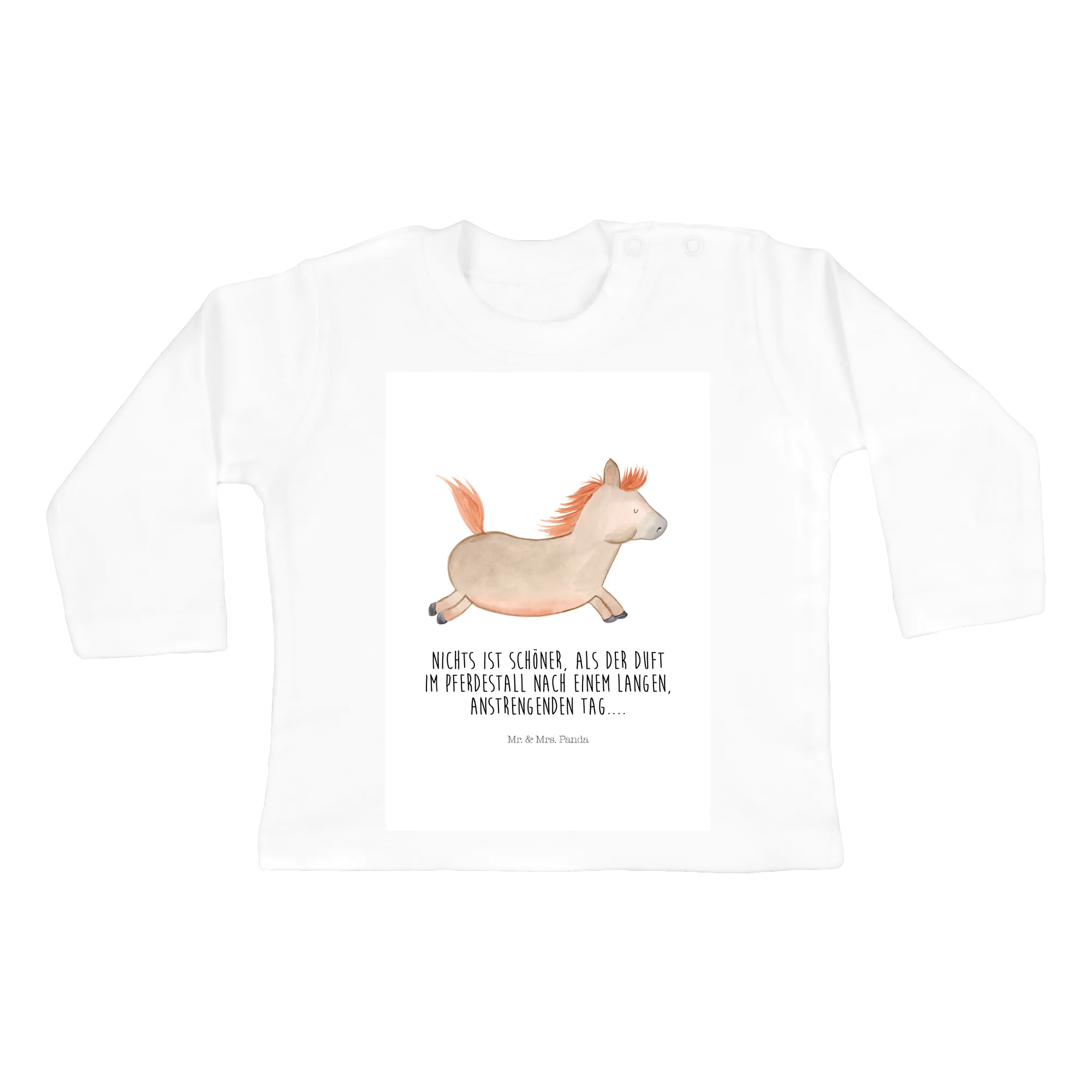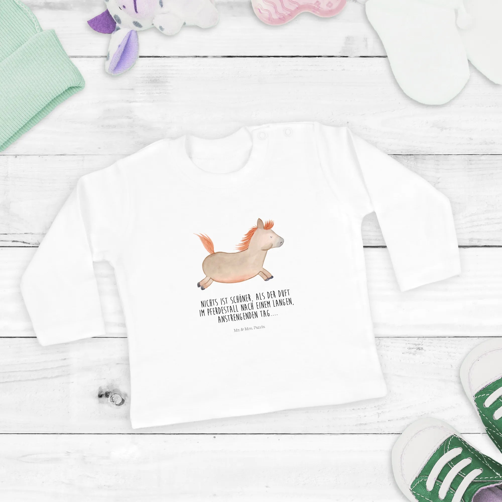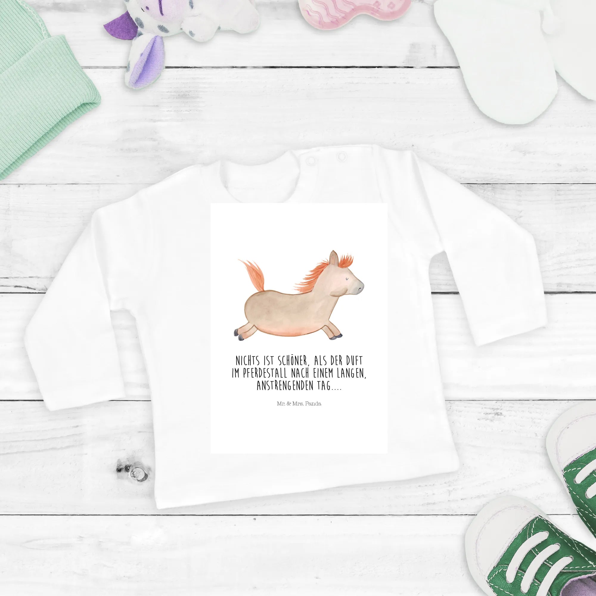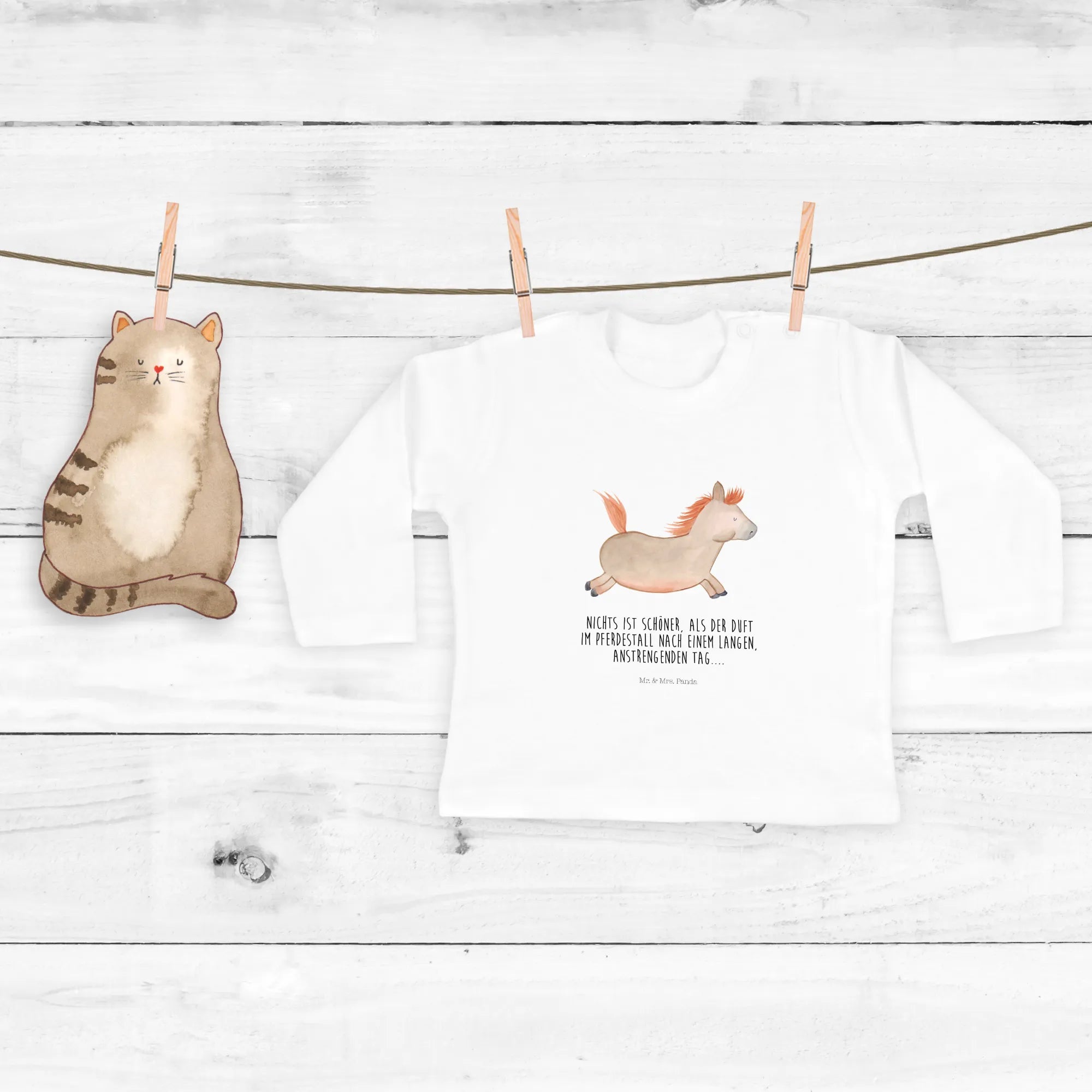 Das langärmelige Baby Longsleeve "Pferd springt" aus der speziellen Bauernhof Kollektion von Mr. & Mrs. Panda ist das perfekte Geschenk für kleine Pferdeliebhaber im Alter von 18 bis 24 Monaten. Es begeistert nicht nur durch ein zuckersüßes Design, sondern auch durch die hochwertige Verarbeitung aus 100% Bio-Baumwolle.