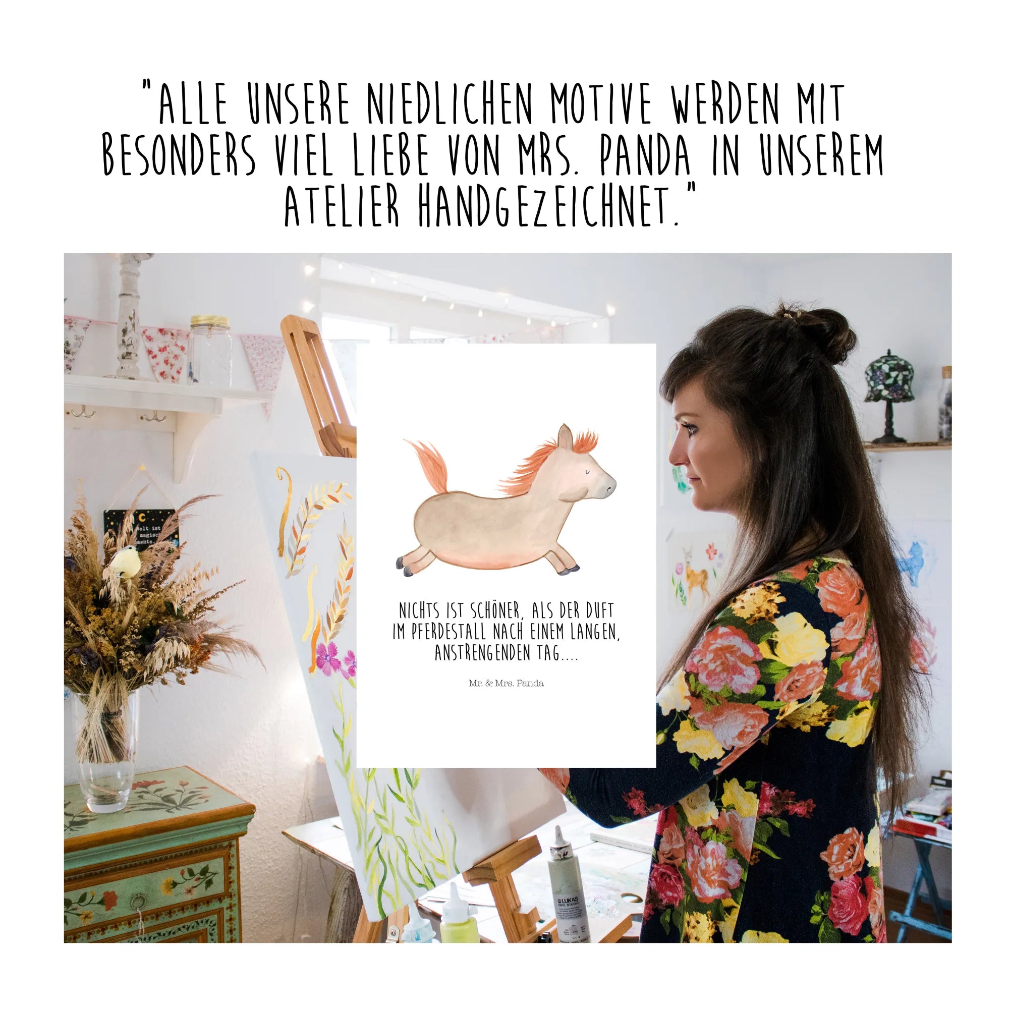 Ein lebendiges Bild eines Pferdes, das mit federnden Sprüngen über den Hof fliegt – pure Freude, eingefangen in einer zarten Illustration. Im Hintergrund sieht man die vertraute Silhouette eines Stalls und spürt die Nähe all der Momente, die man als Pferdebesitzer erlebt: das morgendliche Begrüßen der Tiere, das gemeinsame Kraulen, die kleinen Rituale, die das Band stärken. Dieses Motiv ist eine liebevolle Widmung an alle, die ihr Leben mit Pferden teilen. Es strahlt Wärme aus, ohne kitschig zu wirken, und erzählt von Verantwortung, Geduld und der großen Belohnung: dem unvergleichlichen Gefühl, wenn dein Pferd einfach glücklich ist. Ob als Geschenk für einen neuen Pferdebesitzer oder als Erinnerung an eigene Pferdetage – dieses Motiv bringt Herz und Humor in jede Umgebung und erinnert daran, wie schön es ist, ein Teil dieser Welt zu sein.