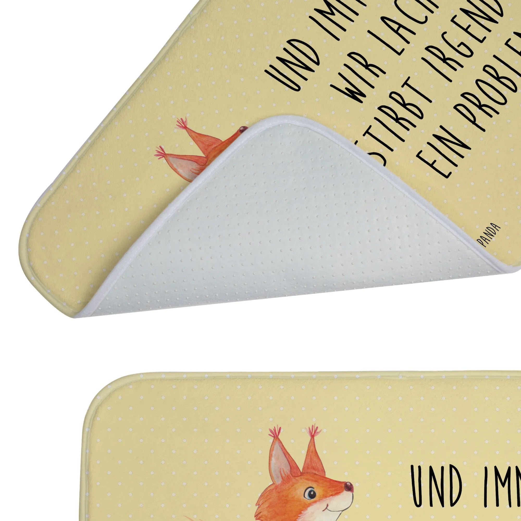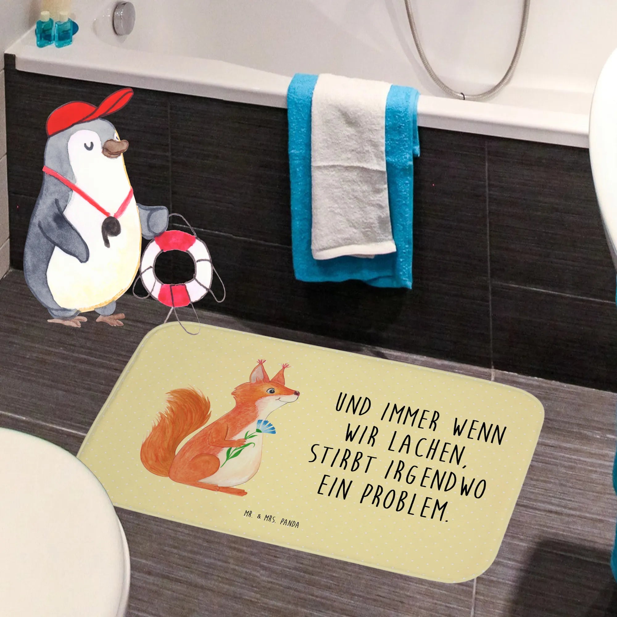 Dieser wunderschöne Badvorleger von Mr. & Mrs. Panda bringt nicht nur Farbe in dein Badezimmer, sondern sorgt auch für einen angenehmen Komfort unter den Füßen. Mit seinen Maßen von 590 mm x 400 mm passt er perfekt vor die Dusche oder Badewanne. Der Badvorleger ist aus flauschiger Premium Kunstfaser hergestellt und verfügt über eine rutschfeste Gummibeschichtung, die das Ausrutschen verhindert. Die liebevoll bedruckten Motive und Sprüche verleihen deinem Badezimmer eine tolle Optik und machen den Aufenthalt dort noch angenehmer. Der Badvorleger ist besonders saugstark und sorgt dafür, dass Wasser schnell aufgenommen wird, während die Vorderseite angenehm weich bleibt. Du kannst ihn ganz leicht bei 30°C in der Waschmaschine waschen, sodass er immer frisch und einladend aussieht.