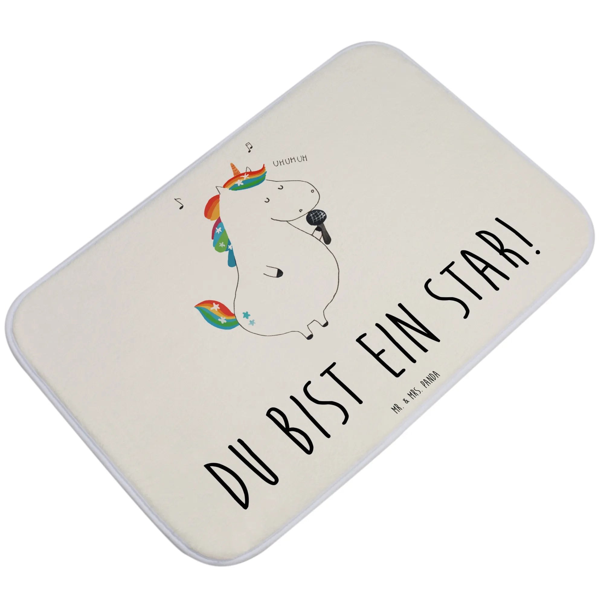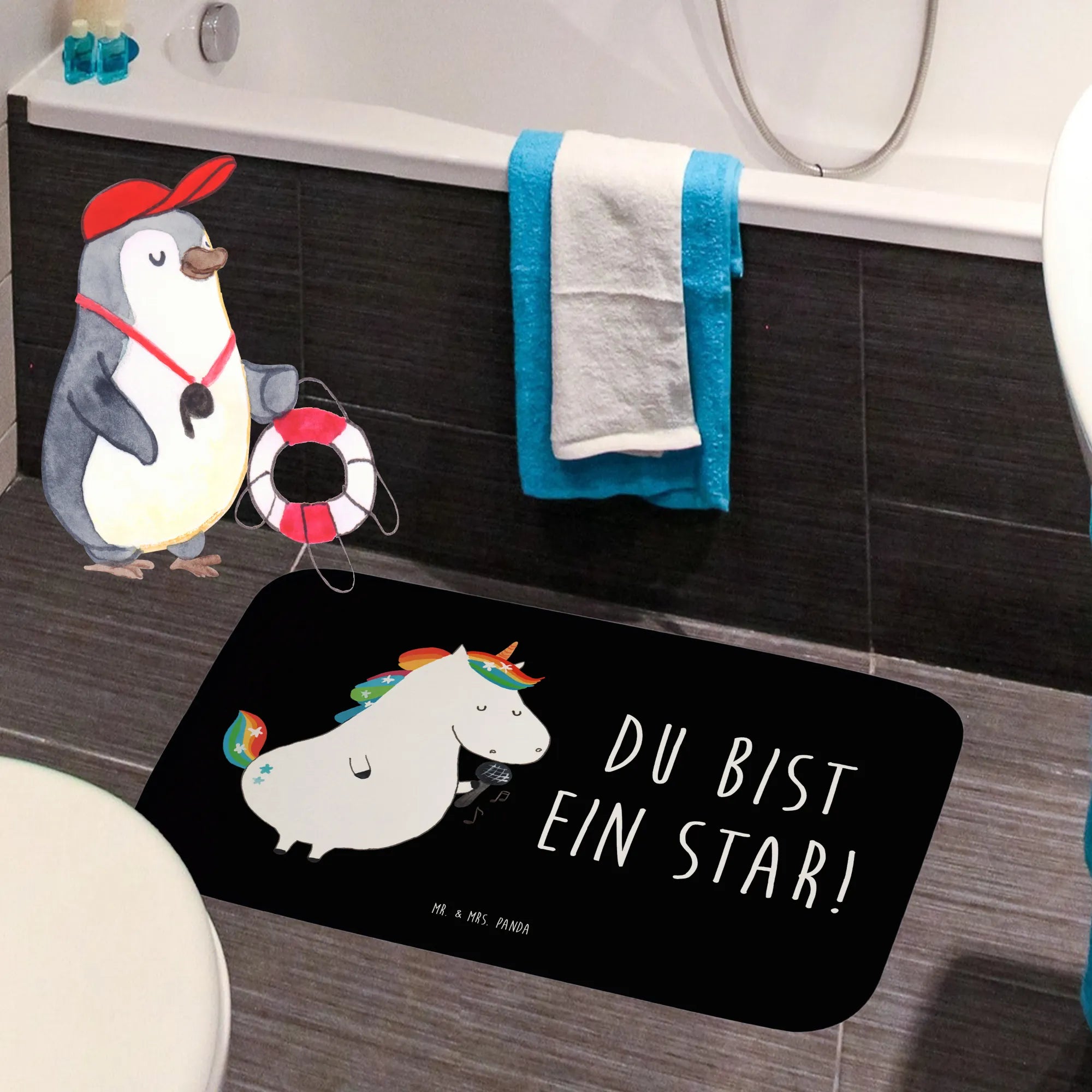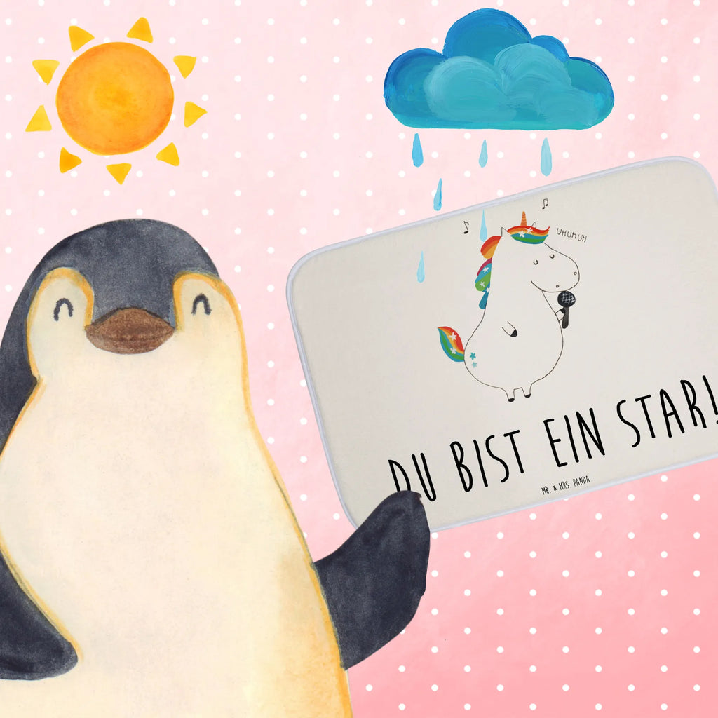 Entdecke den zauberhaften Badvorleger "Einhorn Sänger" aus der einzigartigen Einhorn-Kollektion von Mr. & Mrs. Panda! Dieser flauschige Badvorleger zaubert ein Lächeln in jedes Badezimmer und sorgt für den perfekten Look. Mit dem niedlichen Einhorn, das in ein Mikrofon singt, und dem liebevollen Slogan "Du bist ein Star!" ist er nicht nur ein Blickfang, sondern auch eine stimmungsvolle Ergänzung zu deiner Badgestaltung.