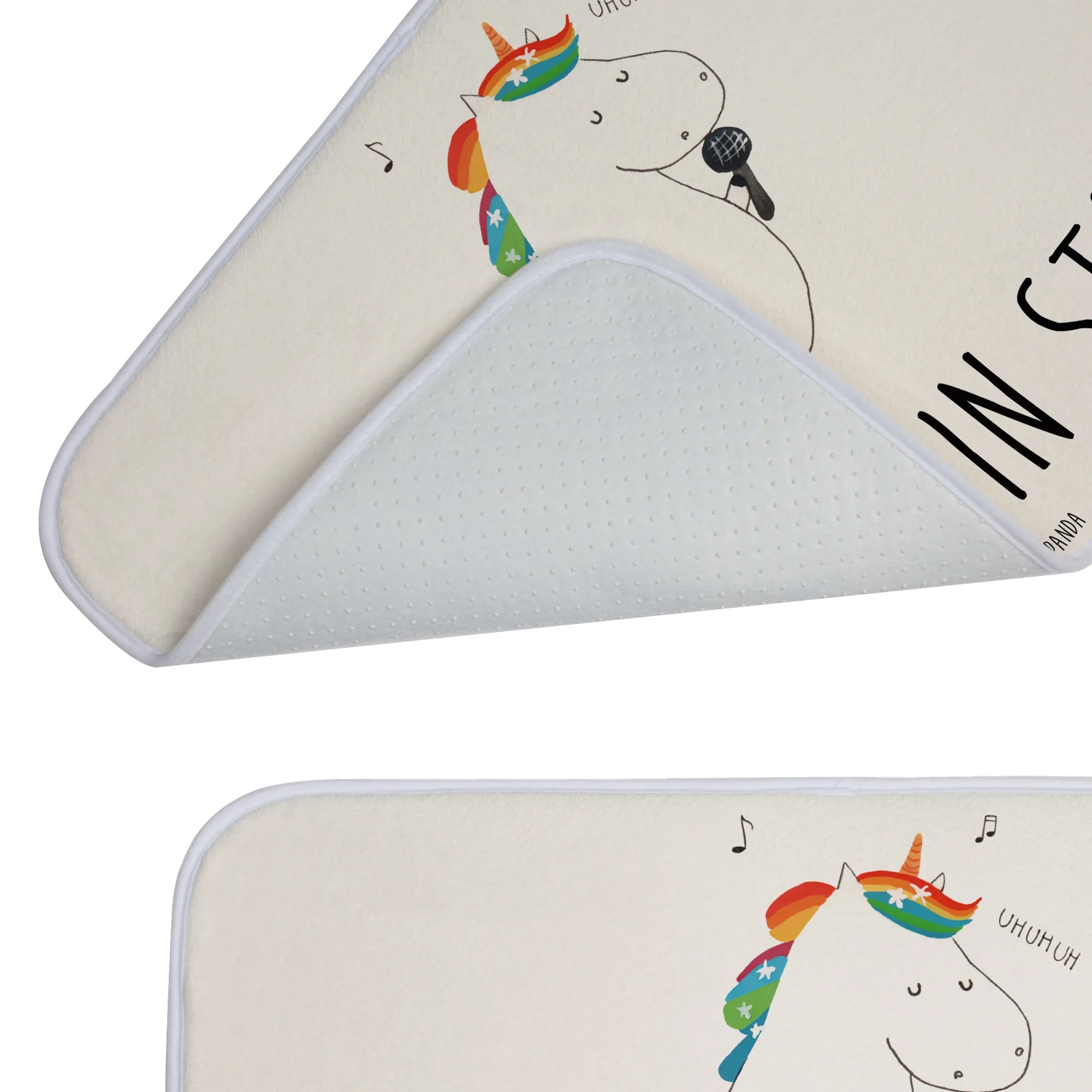 Der Badvorleger Einhorn Sänger von Mr. & Mrs. Panda ist das perfekte Geschenk für alle Einhornliebhaber und die, die es noch werden wollen! Mit einer flauschigen Oberfläche aus hochwertigem Premium Polyester sorgt er nicht nur für eine tolle Optik im Badezimmer, sondern auch für eine einladende Atmosphäre. Das süße Motiv zeigt ein einhörniges Wesen, das begeistert in ein Mikrofon singt, und bringt damit den Glamour einer Disco direkt in dein Badezimmer.