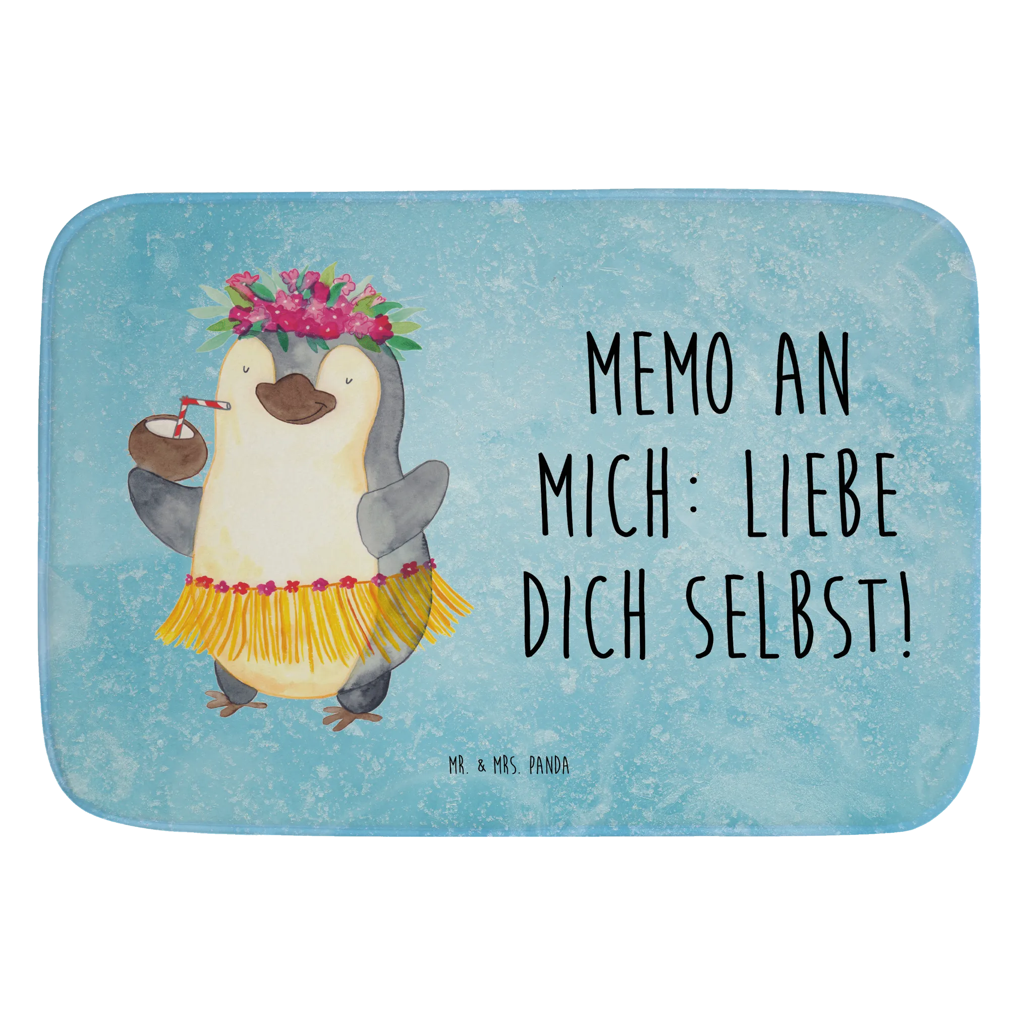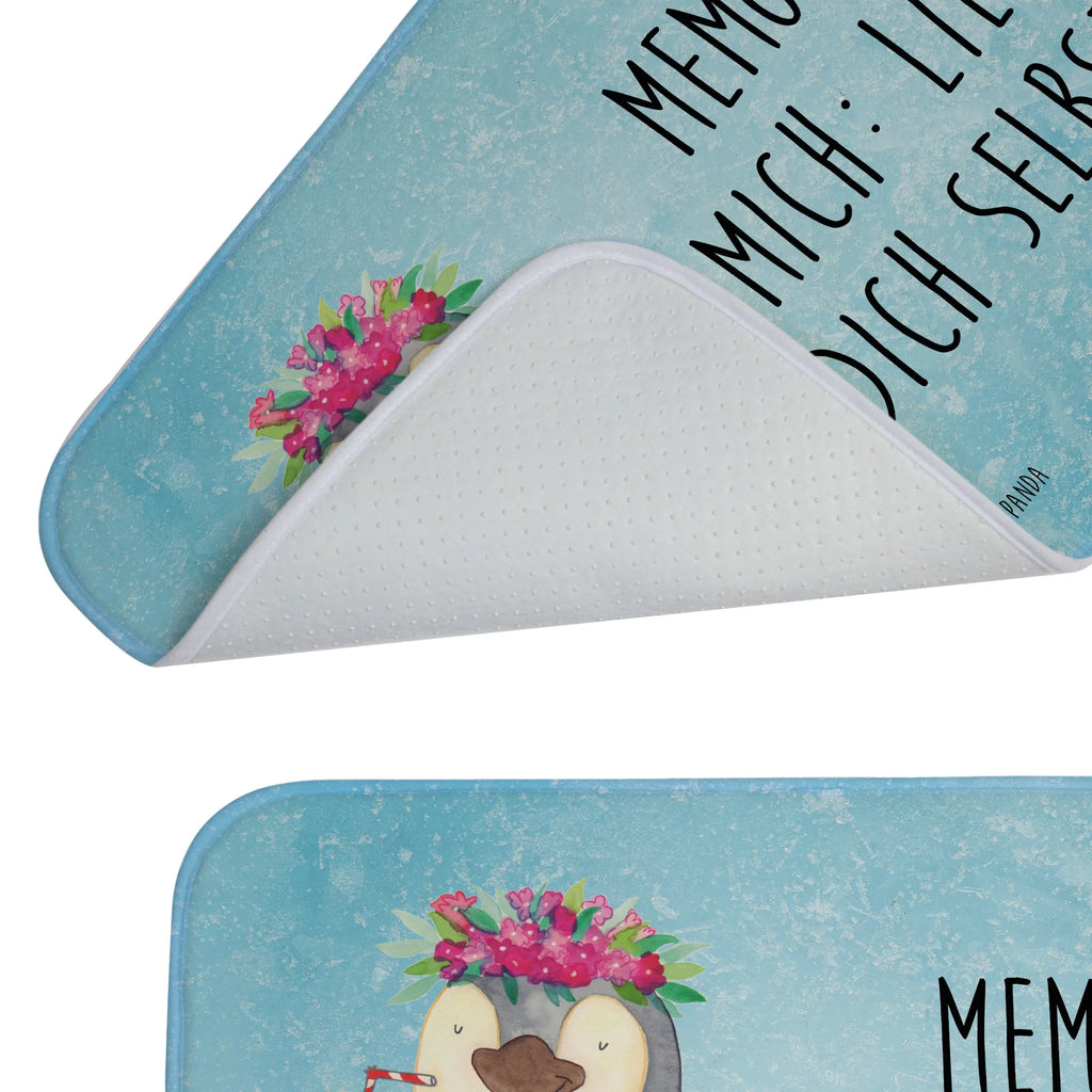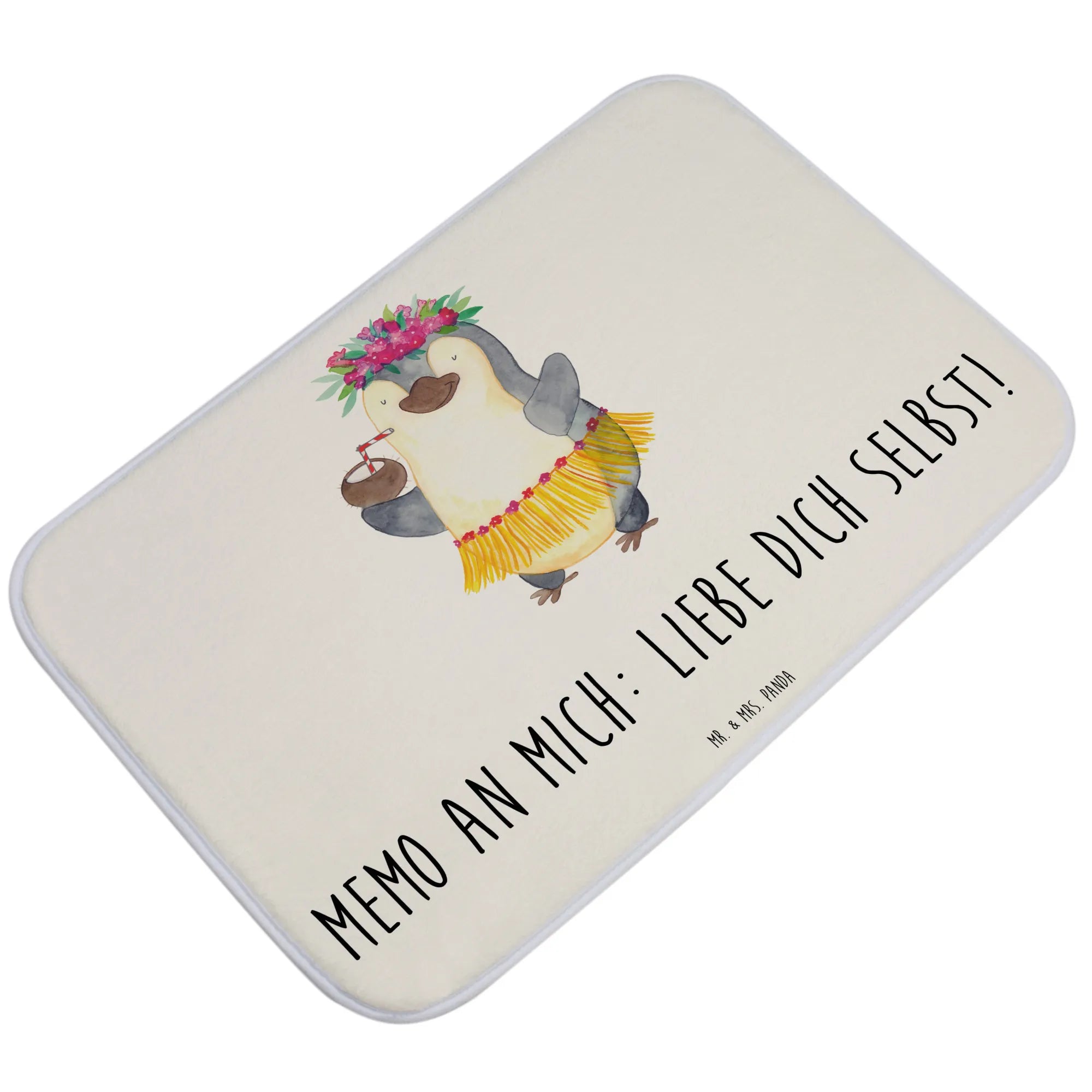 Nimm einen Hauch von Urlaub und gute Laune mit in dein Badezimmer! Der Badvorleger mit dem fröhlichen Pinguin Kokosnuss-Motiv aus der Pinguin-Kollektion von Mr. & Mrs. Panda ist der perfekte Begleiter für entspannende Momente nach dem Duschen oder Baden.