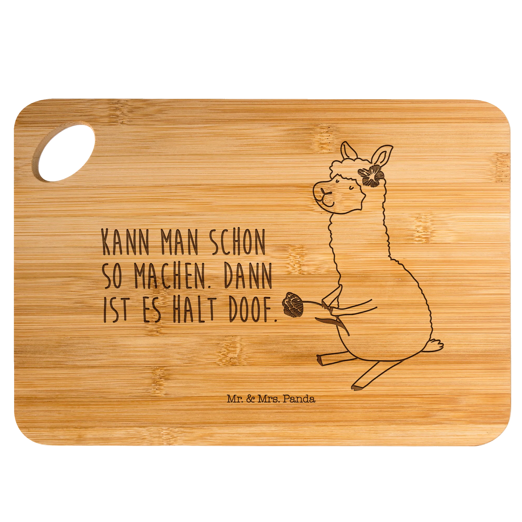 Unser kleines Holzbrettchen mit dem liebenswerten Alpaka Motiv bringt gute Laune in deine Küche. Das flauschige Alpaka trägt eine Blume im Haar und hält eine weitere Blume in der Hand – ein Motiv, das zum Verweilen einlädt. Der lustige Spruch „Kann man schon so machen. Dann ist es halt doof.“ ist quer auf dem Brett graviert und sorgt garantiert für ein Schmunzeln bei dir und deinen Gästen.