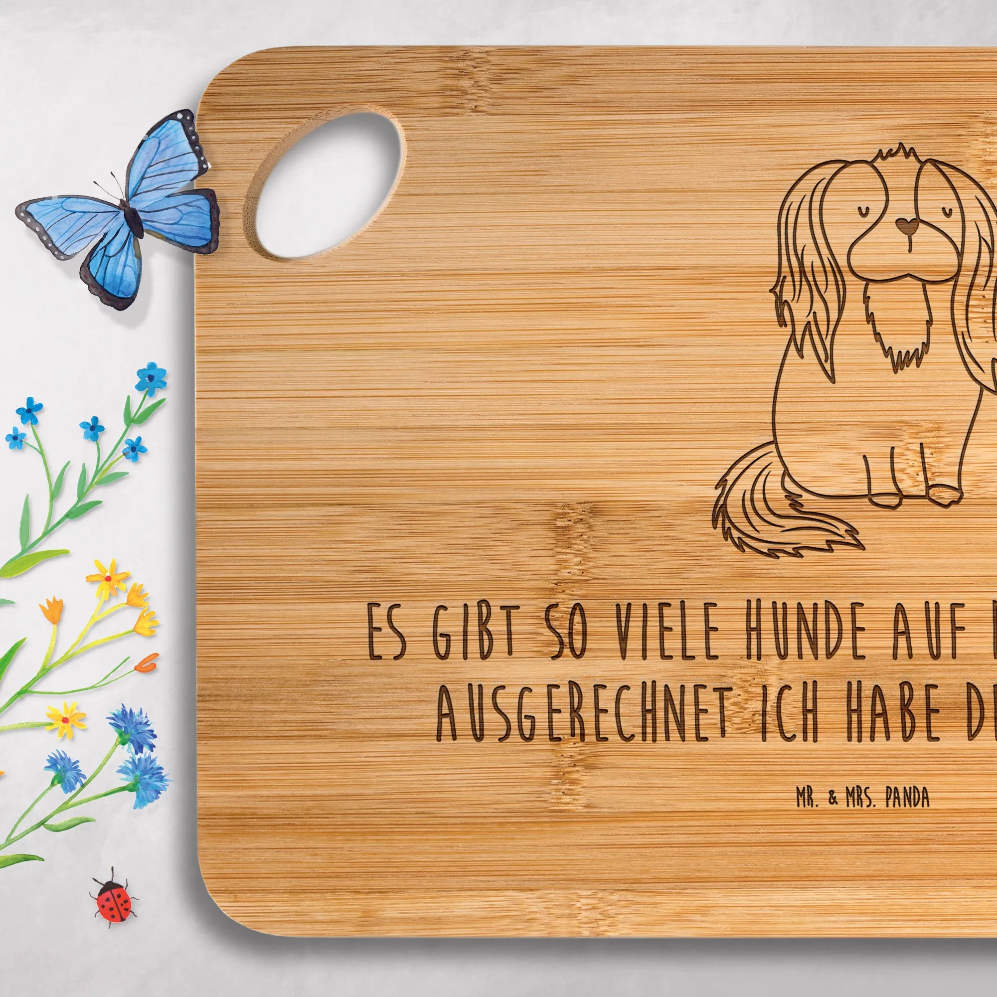Hol dir ein praktisches und zugleich verspieltes Holzbrett, das deinem Alltag Wärme verleiht. Mit dem Cavalier King Charles Spaniel Motiv aus der Hunde Kollektion von Mr. & Mrs. Panda schenkst du Freude, Stil und Funktionalität in einem.