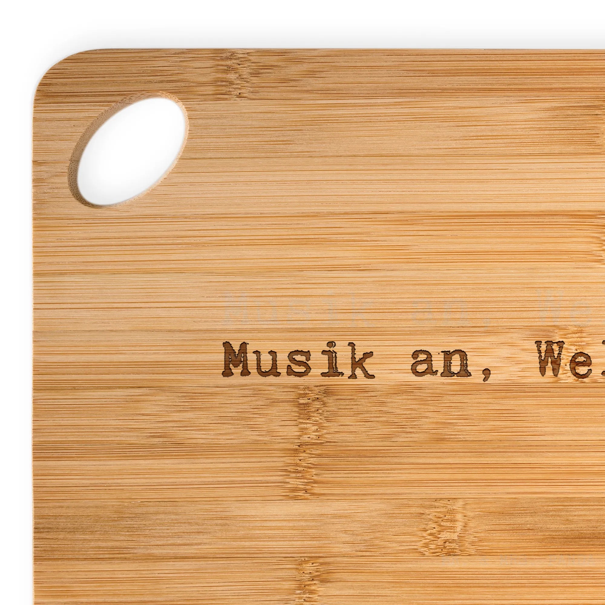 Musik an, Welt aus! – Das perfekte Schneidebrett für alle, die sich gern eine kleine Auszeit mit Lieblingssongs gönnen. Unser Herzstück aus der Spruchreif Kollektion von Mr. & Mrs. Panda vereint Funktion und Charme: Frühstücksbrett, Holzbrett und Servierbrett in einem, graviert mit dem frechen Spruch, der sofort gute Laune verbreitet.