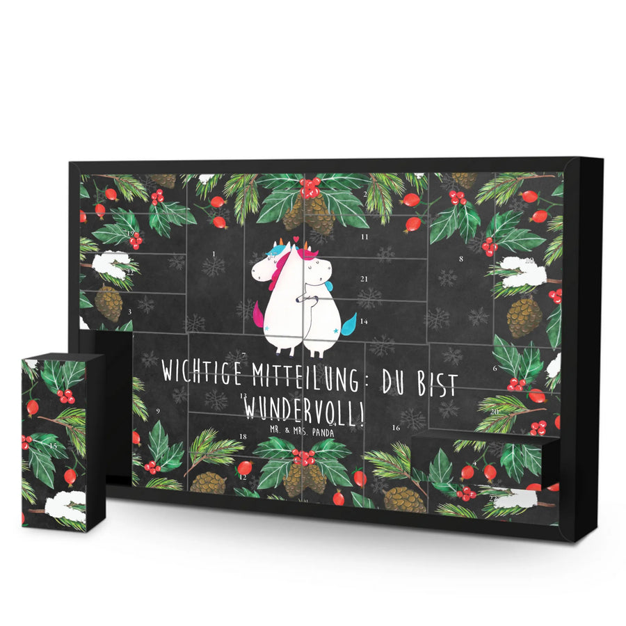 Der befüllbare Adventskalender Einhorn Mitteilung von Mr. & Mrs. Panda ist das perfekte Geschenk für alle, die Einhörner lieben und die Vorweihnachtszeit auf eine besonders zauberhafte Weise genießen möchten. Diese wunderschöne Kreation zeigt zwei niedliche Einhörner, die sich in einem liebevollen Moment umarmen, und vermittelt die wichtige Botschaft: 'Wichtige Mitteilung: du bist wundervoll!'. Ideal für Paare oder beste Freunde, die sich gegenseitig eine Freude machen wollen!