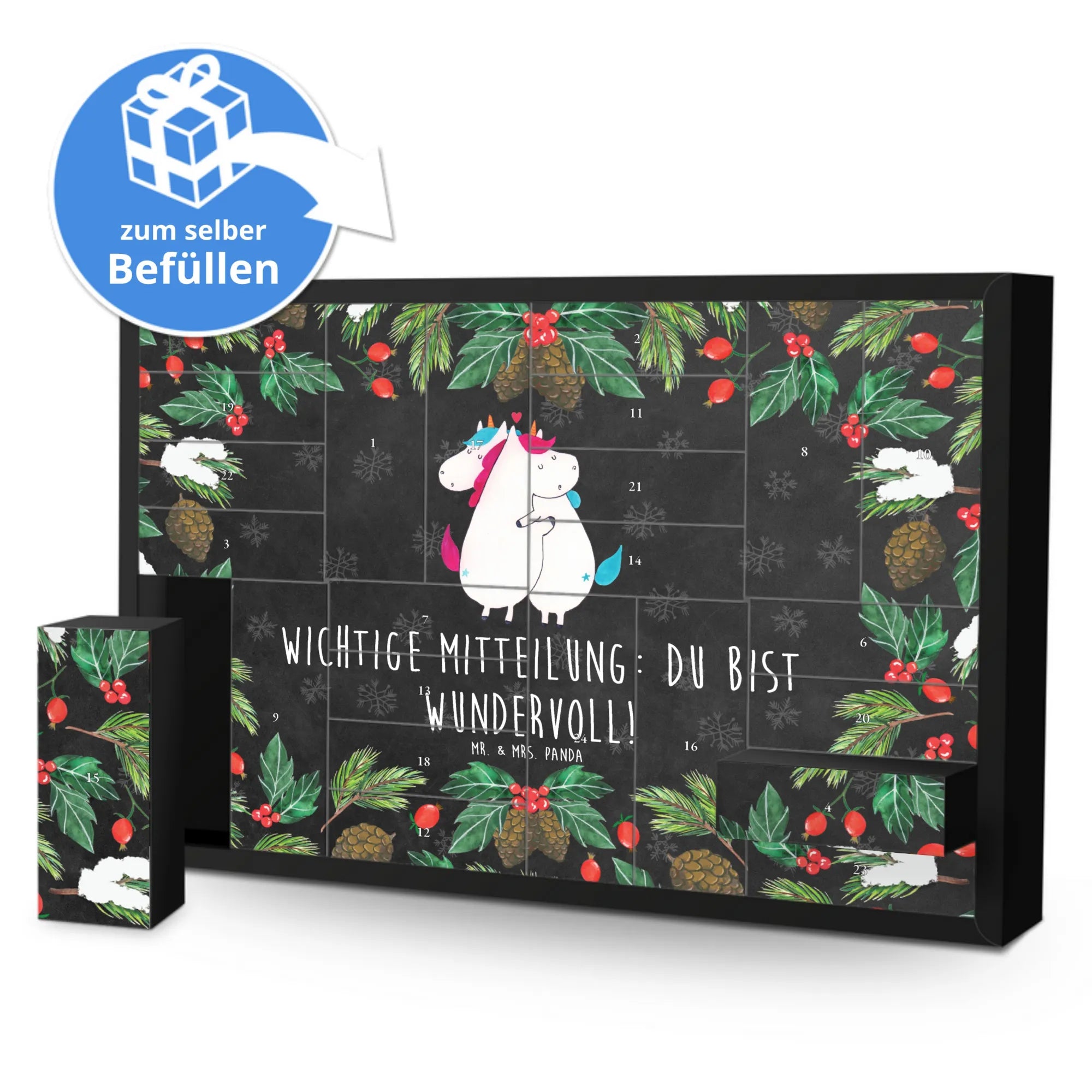 Der wunderschöne befüllbare Adventskalender von Mr. & Mrs. Panda mit dem zauberhaften Einhorn-Motiv ist das perfekte Geschenk für jeden Einhornliebhaber! Ob für Deinen Partner, Deine beste Freundin oder als liebevolle Überraschung für Dich selbst - dieser Adventskalender verbreitet Freude und Weihnachtsstimmung.