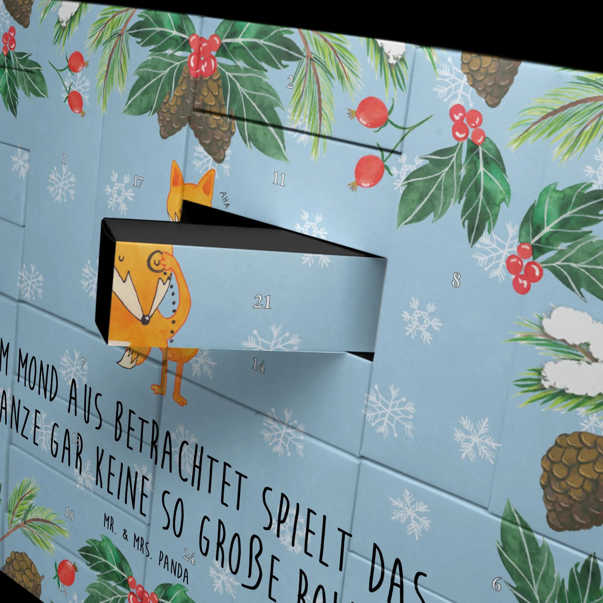 Die Fuchs-Kollektion von Mr. & Mrs. Panda steht für Geselligkeit und das Zusammensein mit den Liebsten. Jedes Motiv und jeder Spruch wurde mit viel Herz von Mrs. Panda entworfen und verleiht dem Adventskalender seinen einzigartigen Charakter. Also mach das Warten auf Weihnachten zu etwas ganz Besonderem und verschenke Freude mit diesem wundervollen Adventskalender Fuchs Lord. In der kalten Jahreszeit können wir alle ein wenig Liebe und Aufmunterung gebrauchen – und genau das ist es, was unser Fuchs Lord bietet. Wenn du dann einen Blick auf den Kalender wirfst, wirst du immer wieder an die schönen Momente erinnert, die in der Adventszeit auf dich warten.