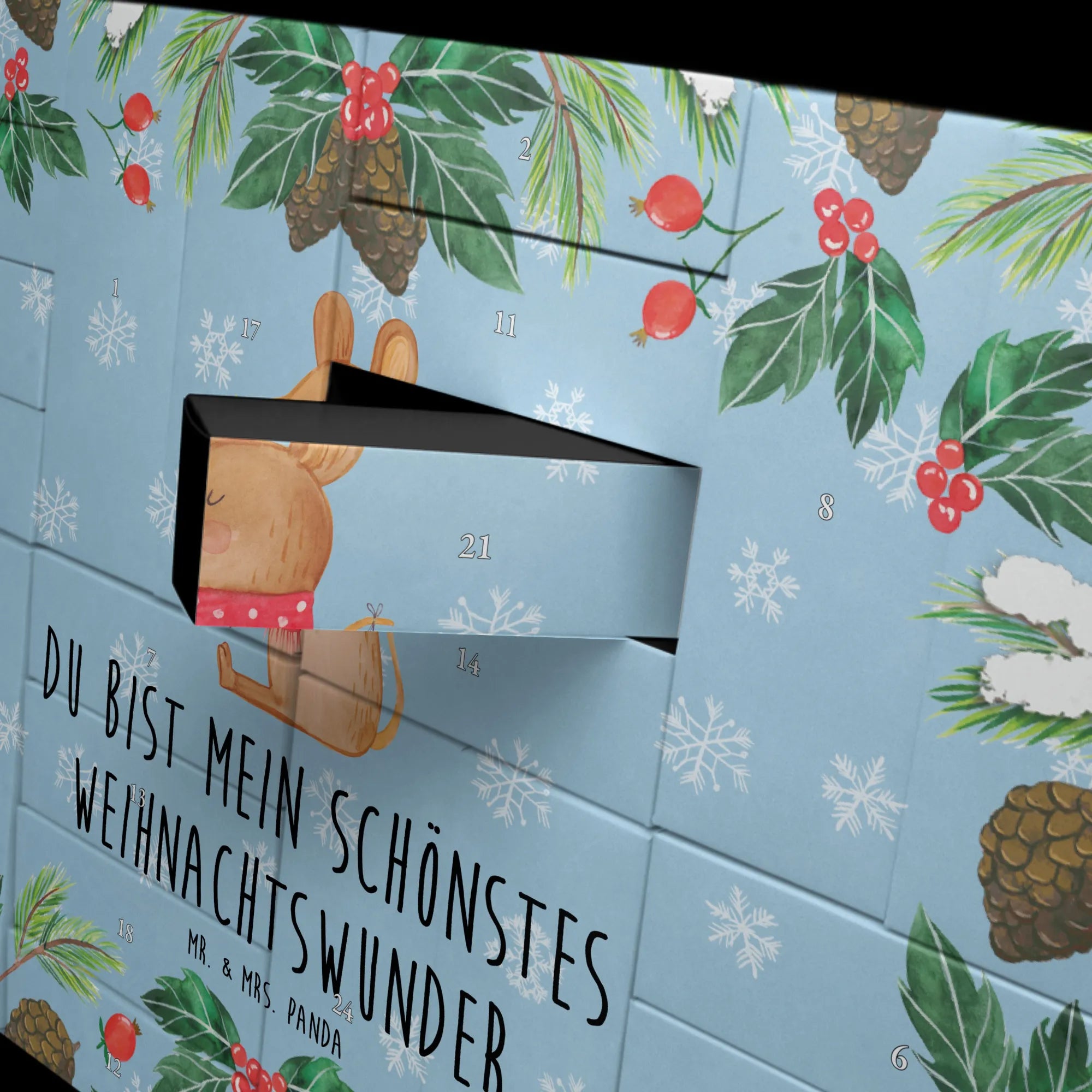 Juchu! Unser befüllbarer Adventskalender mit der zauberhaften Weihnachtsmaus aus der Winter Kollektion von Mr. & Mrs. Panda bringt gemütliche Vorfreude in dein Zuhause. Die liebevoll von Mrs. Panda handgezeichnete Maus, der herzliche Spruch „Du bist mein schönstes Weihnachtswunder.“ und der zarte Eisblau-Hintergrund machen diesen Adventskalender zu einer wundervollen Weihnachtsdeko.