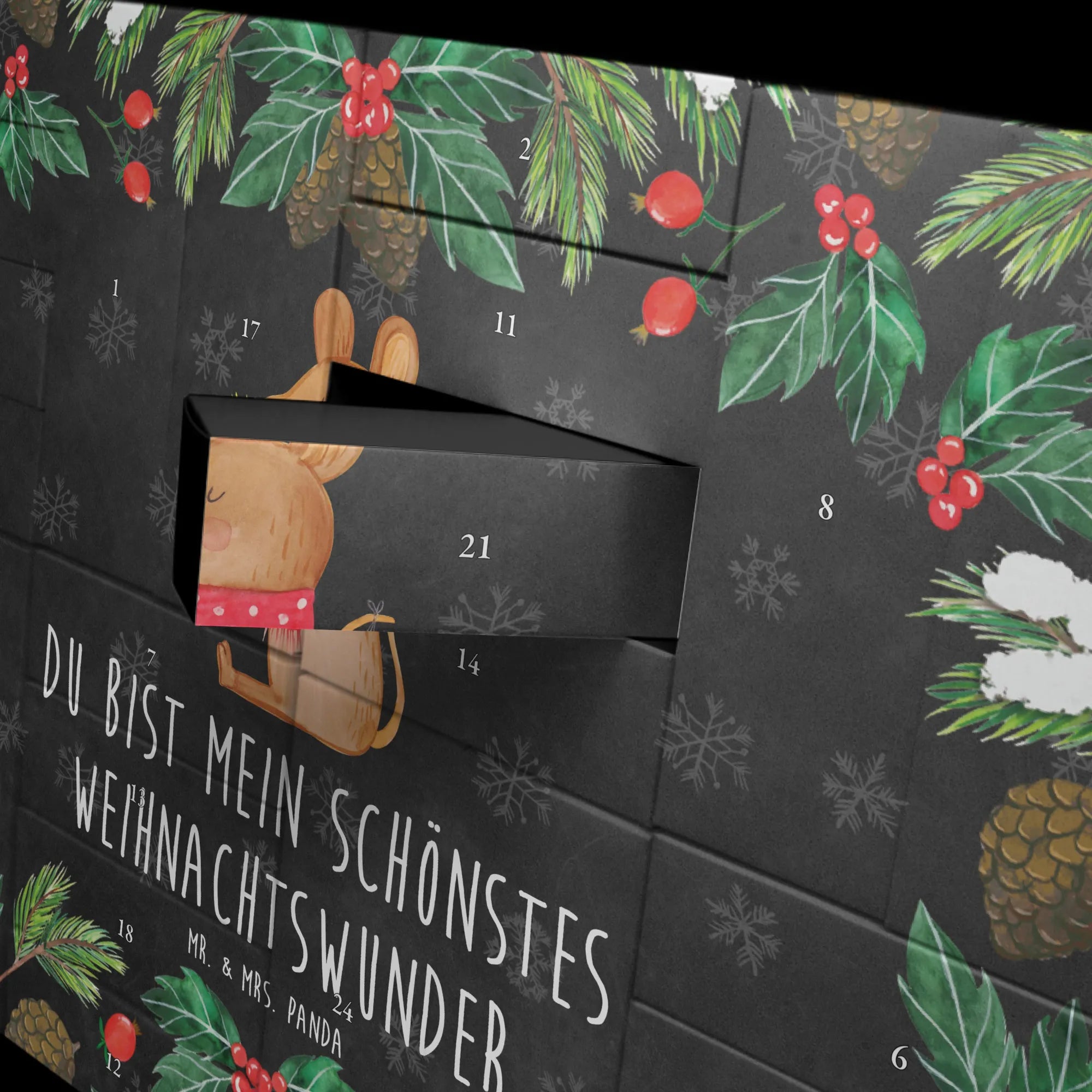 Ob als Adventskalender Weihnachten, Geschenk für Freundinnen, Adventskalender für Kollegen beim Secret Santa oder als liebevolle Geste für Deinen Lieblingsmenschen – die Weihnachtsmaus aus der Winter Kollektion ist vielseitig einsetzbar und zaubert jeden Morgen ein Lächeln. Bedruckt mit wunderschönen Sprüchen & Motiven von Mr. & Mrs. Panda, nicht personalisierbar, aber mit ganz viel Herz.
