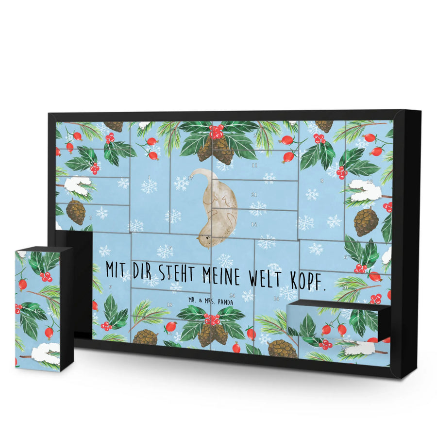 Das Motto "Mit Dir steht meine Welt Kopf." unterstreicht, dass mit der richtigen Person an deiner Seite alles viel schöner und lustiger ist. Die süße Zeichnung von Mrs. Panda zeigt einen fröhlichen Seeotter in seiner kopfüber Schwimmposition, die garantiert ein Lächeln aufs Gesicht zaubert und gleichzeitig ein Gefühl von Leichtigkeit und Frohsinn vermittelt. Die hochwertige Druckqualität mit seidenmatter Oberfläche wertet den Adventskalender auf und macht ihn zu einem echten Hingucker.
