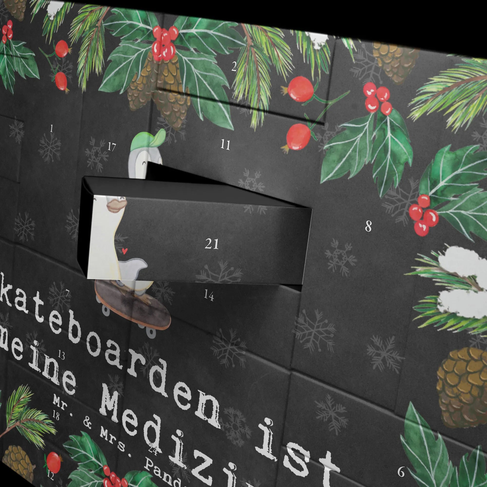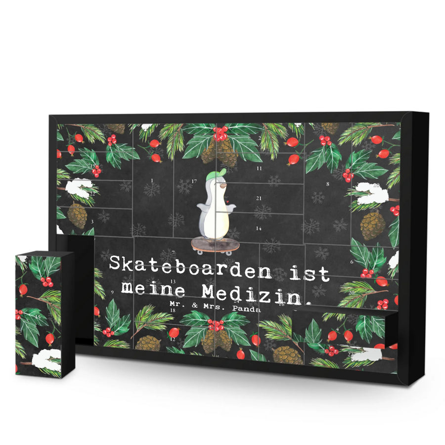 Mit 24 Schachteln zum Befüllen bietet dieser bezaubernde Kalender genug Platz, um die Vorfreude auf Weihnachten perfekt zu gestalten. Er wurde mit viel Liebe von Mrs. Panda designt und druckt ein süßes Motiv eines Pinguins, der mit seinem Skateboard durch die Welt rollt und das Motto "Skateboarden ist meine Medizin." trägt.