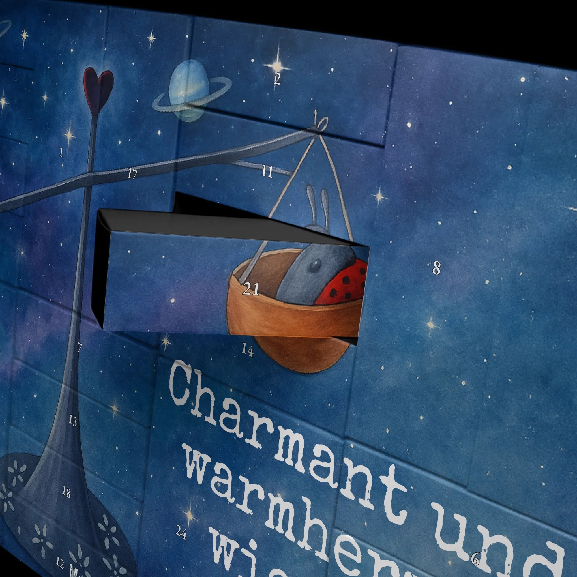 Adventskalender 24 Schachteln – der perfekte Begleiter für die Vorweihnachtszeit von Mr. & Mrs. Panda. Mit seinen 24 Schachteln zum Selbstbefüllen ist dieser Kalender ideal, um jeden Adventstag mit kleinen Überraschungen zu füllen. Die Front ziert eine liebevolle Zeichnung von Mrs. Panda sowie warmherzige Sprüche und Motive, die das Herz erwärmen. Gefertigt aus stabilem Adventskalender Karton besticht der Kalender durch brillante Druckqualität und eine edle, seidenmatte Oberfläche. Die integrierte Aufstellvorrichtung macht das Aufstellen kinderleicht und sorgt für eine sichere Präsentation. Bitte beachten: Der Kalender ist nicht personalisierbar und wird ohne Füllung geliefert, sodass du ihn ganz nach deinen Vorstellungen gestalten kannst. Maße: Breite: 619 mm, Höhe: 405 mm, Tiefe: 50 mm. Ob als Geschenk für die Liebsten oder als nette Familien-Tradition – dieser Adventskalender mit 24 Schachteln bringt jeden Morgen ein kleines Stück Weihnachtsfreude.