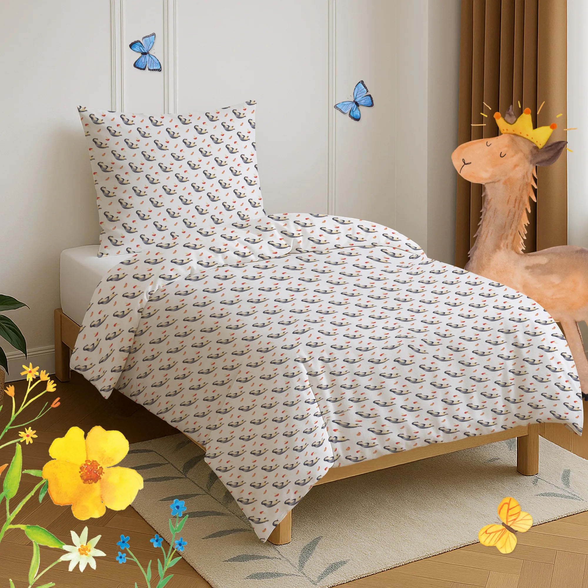 🐼 Edle Bettgarnitur aus Baumwollsatin, handgenäht, 135x200 cm mit bedruckten Motiven.