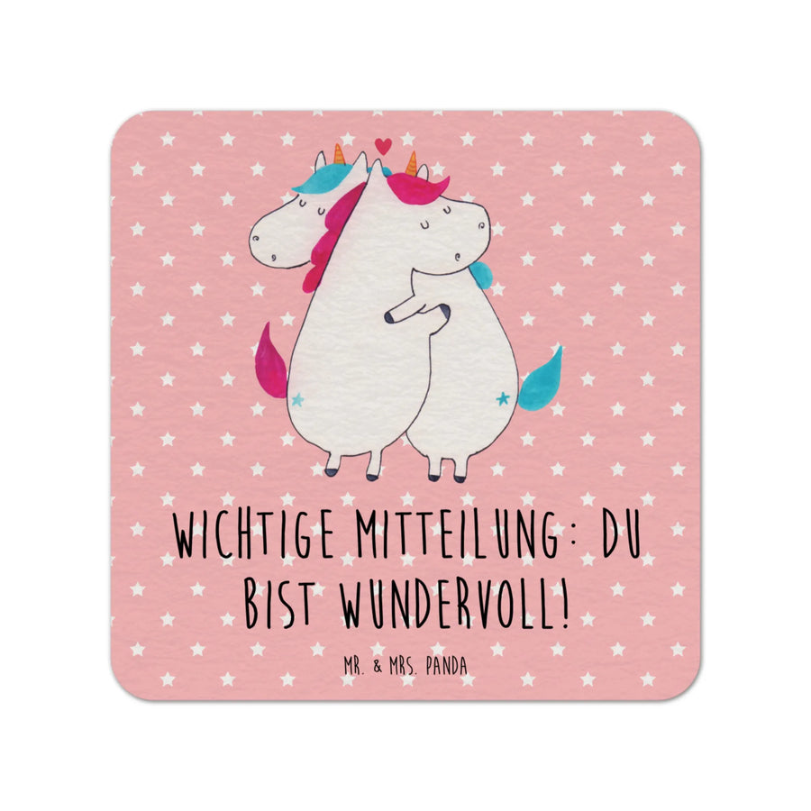 Jeder dieser quadratischen Bierdeckel schützt nicht nur deinen Tisch vor unschönen Abdrücken und Kratzern, sondern bringt auch zauberhafte Stimmung in deine Feierlichkeiten. Auf jedem Deckel prangt das niedliche Motiv von zwei kuschelnden Einhörnern, die ihre Zuneigung zueinander zeigen. Mit dem witzigen Spruch „Wichtige Mitteilung: du bist wundervoll!“ bringst du garantiert ein Lächeln auf die Gesichter deiner Gäste.
