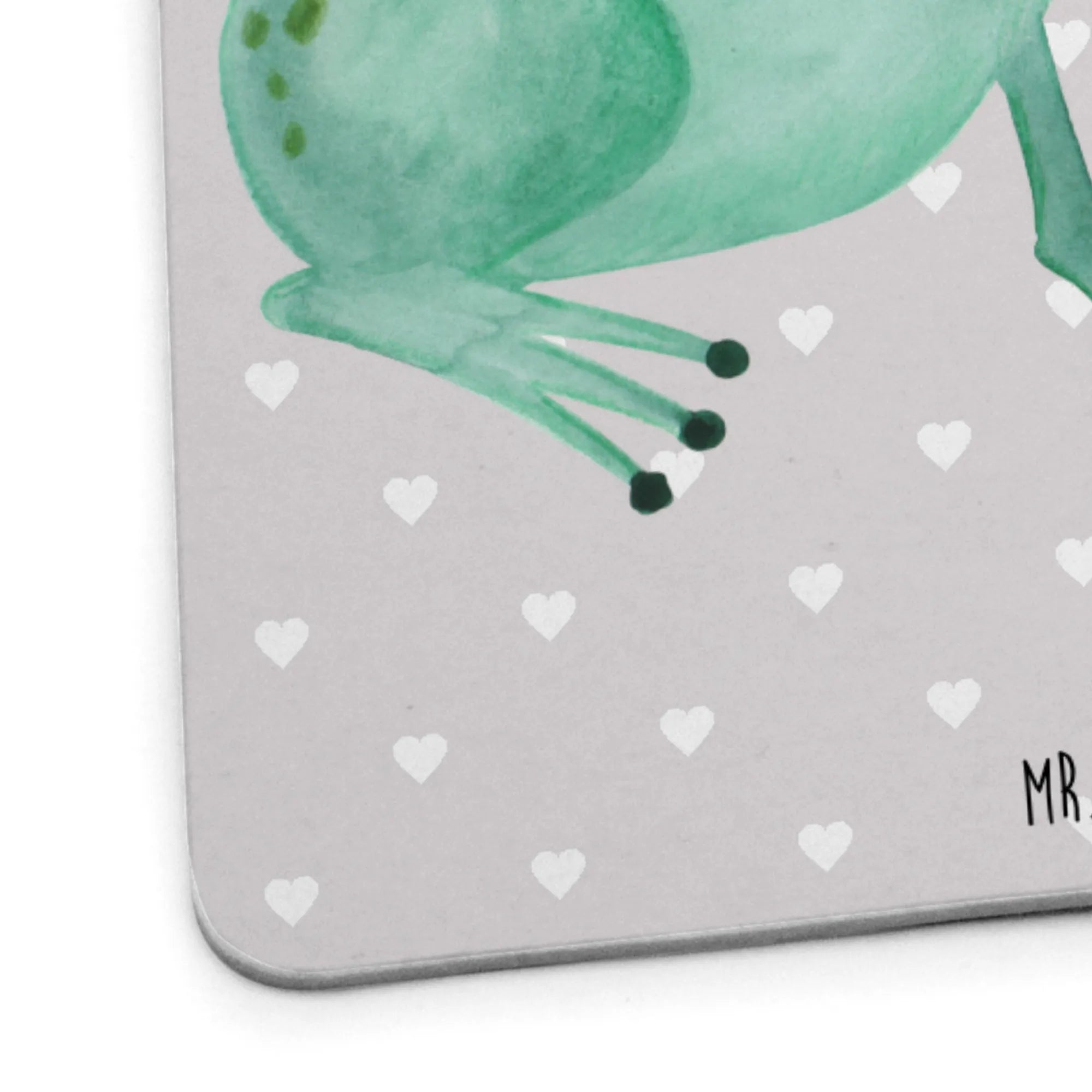 Die beiden niedlichen Frösche auf dem Deckel strahlen pure Freude und Verliebtheit aus. Sie stehen sich gegenüber, umgeben von einem zarten roten Herz, das ihre innige Verbindung perfekt symbolisiert. Die sanften Grüntöne und der freundliche Ausdruck der Frösche zaubern eine warme und liebevolle Atmosphäre, die es jedem Gast leicht macht, sich wohlzufühlen.