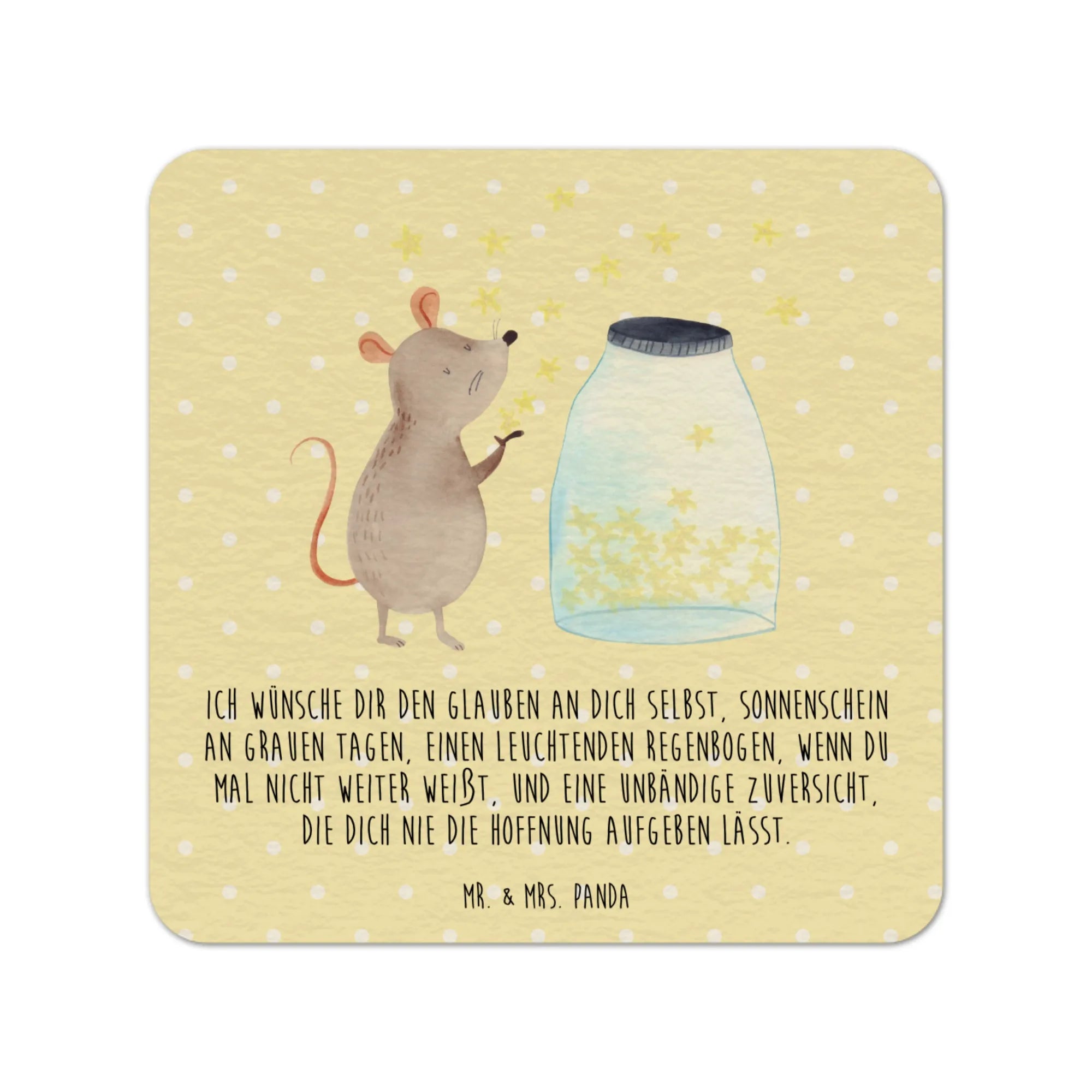 Der wunderschöne quadratische Bierdeckel "Maus Sterne" aus der Small World Kollektion von Mr. & Mrs. Panda ist das perfekte Geschenk für zahlreiche Anlässe und bringt fröhliche Stimmung auf jeden Tisch. Ob bei Hochzeiten, Geburtstagsfeiern oder als liebevolles Gastgeschenk – dieser Bierdeckel ist nicht nur praktisch, sondern auch ein echter Hingucker! Mit der süßen Maus, die vor einem Glas voller funkelnder Sterne sitzt, schafft er eine zauberhafte Atmosphäre. Diese kleine, niedliche Maus träumt von ihren Abenteuern im Universum und lädt Dich ein, mit ihr gemeinsam in eine Welt voller Hoffnung und Träume einzutauchen.