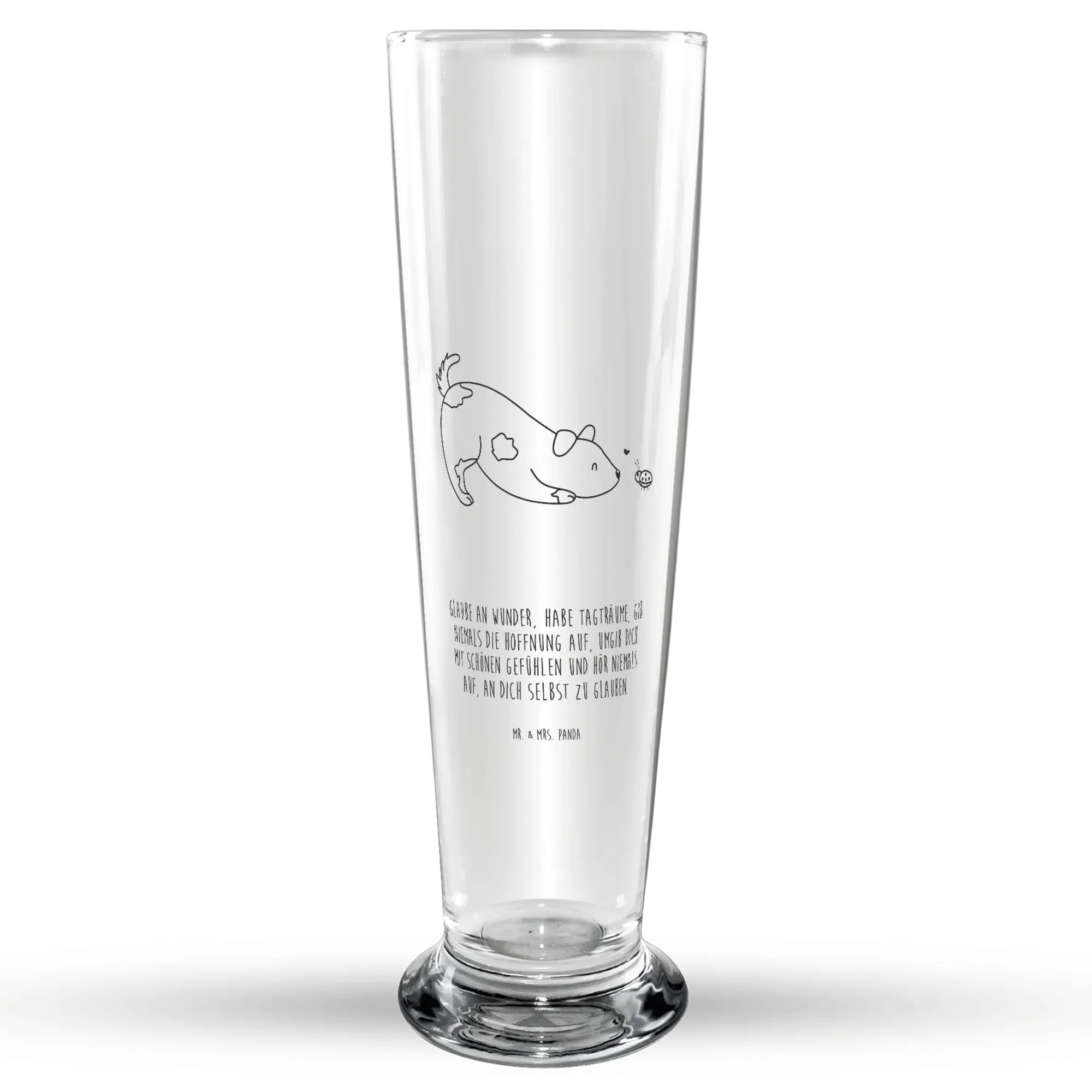 Der niedliche Hund, der begeistert vor einem kleinen Marienkäfer sitzt, sorgt dafür, dass jeder Schluck Bier noch mehr Freude bereitet. Jedes Mal, wenn man sein Bier in dieses Glas einschenkt, wird man an die schönen Momente mit dem treuen Vierbeiner erinnert. Und auch die Sprüche, wie "Glaube an Wunder, habe Tagträume, gib niemals die Hoffnung auf, umgib dich mit schönen Gefühlen und hör niemals auf, an dich selbst zu glauben", sind perfekt, um positive Gedanken zu fördern.