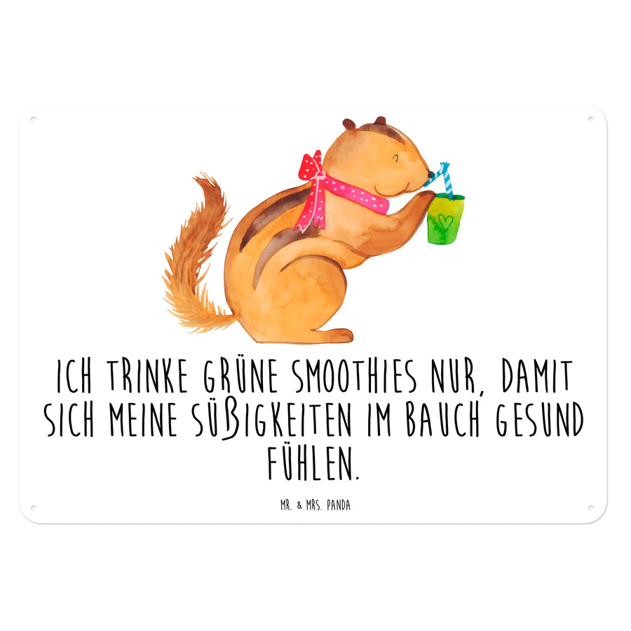 Das wunderschöne und edle Blechschild von Mr. & Mrs. Panda mit dem süßen Eichhörnchen-Motiv ist das perfekte Geschenk für all jene, die gute Laune und ein Lächeln lieben. Mit dem Slogan "Ich trinke grüne Smoothies nur, damit sich meine Süßigkeiten im Bauch gesund fühlen" verzaubert dieses Schild jeden, der es sieht. Perfekt für die eigene Wandgestaltung oder als liebevolles Geschenk zu jedem Anlass!