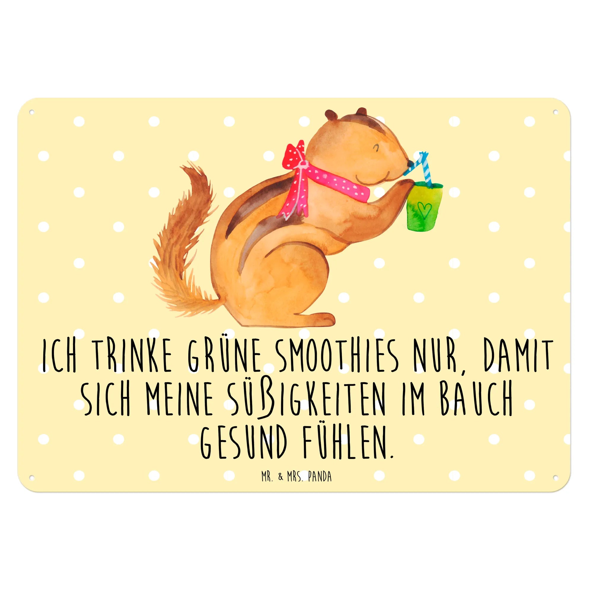 Ein wunderschönes und edles Blechschild von Mr. & Mrs. Panda, das nicht nur als dekoratives Element in deinem Zuhause strahlt, sondern auch mit einer charmanten Botschaft begeistert. Das Motiv mit dem süßen Eichhörnchen, das genüsslich an einem grünen Smoothie schlürft, bringt sofort gute Laune und ein Lächeln in jeden Raum.