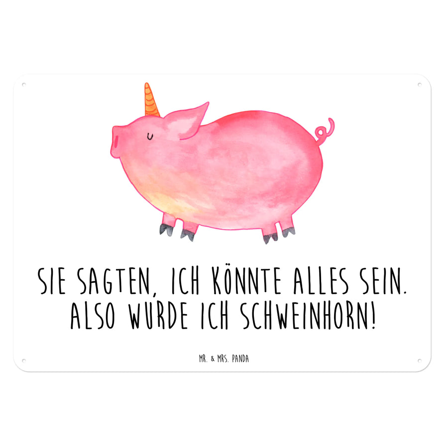 Einfach zum Verlieben: Du suchst ein Geschenk mit Herz und Humor? Unser Blechschild Einhorn Schweinhorn aus der Einhorn - Kollektion von Mr. & Mrs. Panda bringt zauberhafte Stimmung und ein Lächeln in jeden Raum. Das Motiv zeigt ein zuckersüßes Schwein mit Einhornhorn und den frechen Spruch: „Sie sagten, ich könnte alles sein. Also wurde ich Schweinhorn!“. Perfekt als lustiges Blechschild für Küche, Kinderzimmer, Flur oder Büro. 🐷🦄