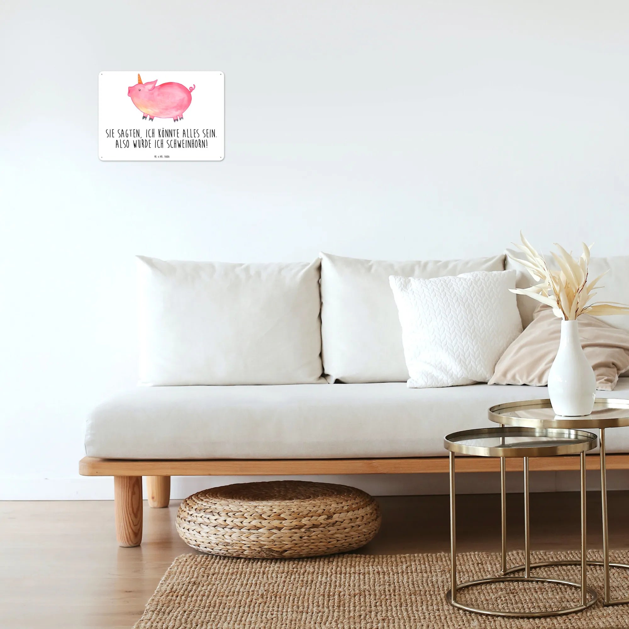 Dieses wunderschöne und edle Blechschild von Mr. & Mrs. Panda ist der perfekte Hingucker für dein Zuhause! Mit dem witzigen Motiv eines Einhorn Schweinhorns und dem liebevollen Spruch „Sie sagten, ich könnte alles sein. Also wurde ich Schweinhorn!“ erzählt es eine Geschichte von Träumen und Fantasie. Das Schild eignet sich hervorragend als Wanddeko oder für die Tür, um jedem Raum einen fröhlichen Akzent zu verleihen.