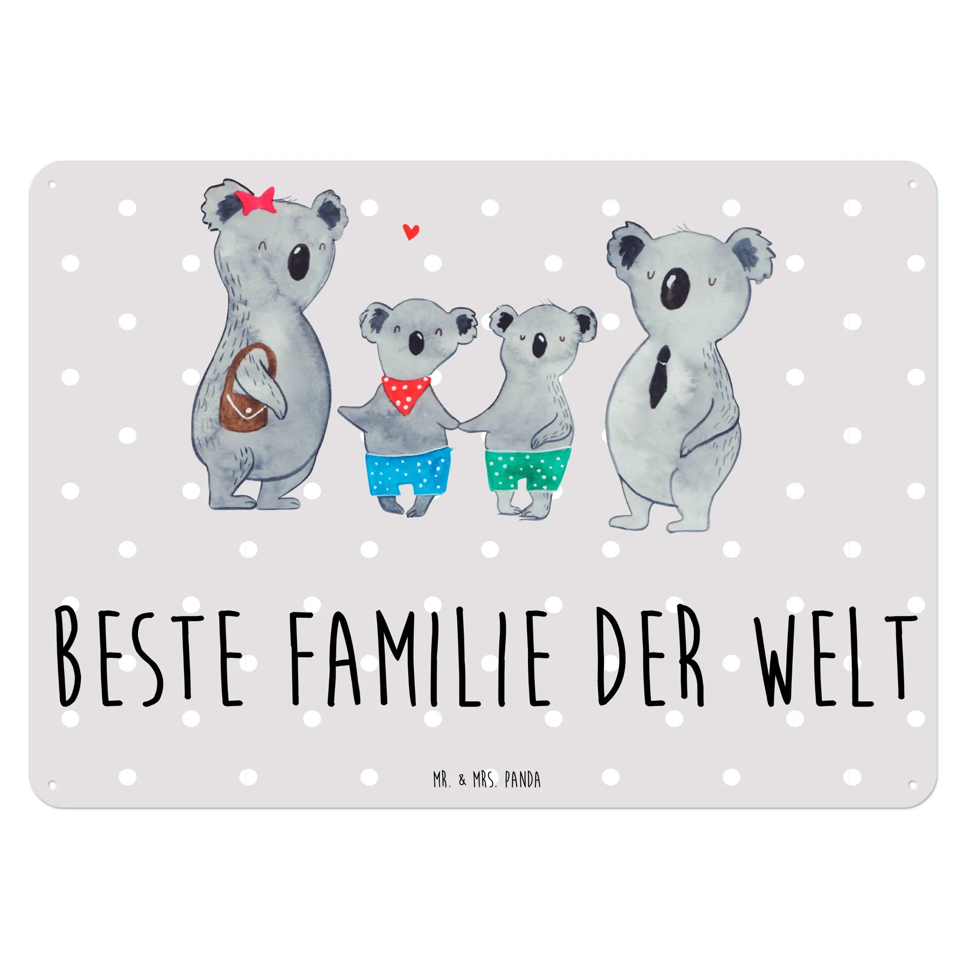 Das wunderschöne und edle Blechschild von Mr. & Mrs. Panda mit dem Motiv "Koala Familie zwei" ist das perfekte Geschenk für all jene, die die Familie über alles lieben. Darauf sind vier süße Koalabären in einer herzlichen und verspielten Szene abgebildet, die die bunte Vielfalt des Familienlebens widerspiegeln.