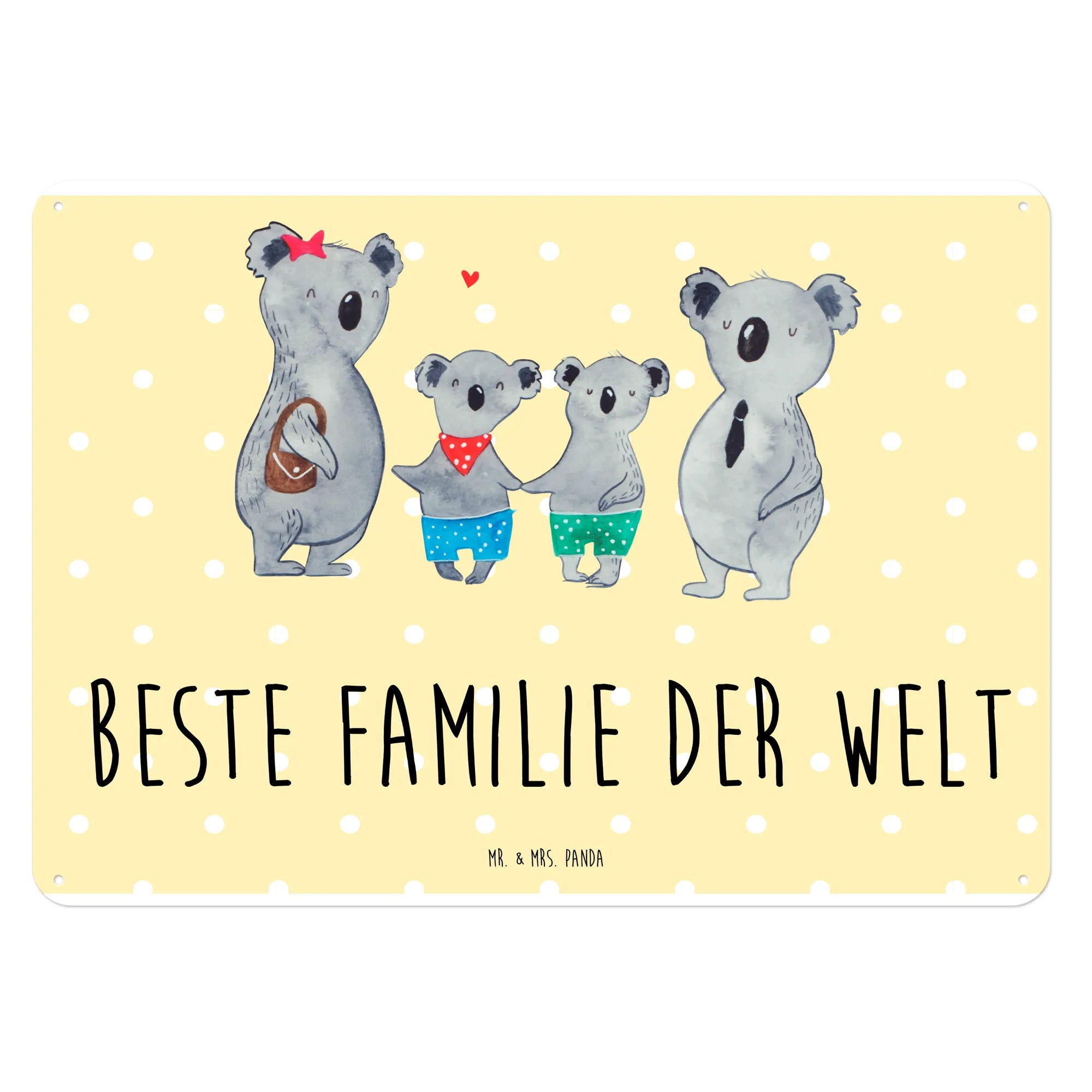 Das Blechschild 'Koala Familie zwei' von Mr. & Mrs. Panda ist die perfekte Dekoration für dein Zuhause! Dieses wunderschöne Schild zeigt eine herzliche Koalafamilie, die in liebevoller und verspielter Darstellung erstrahlt. Das größte Koala, das eine Mutterfigur repräsentiert, trägt ein rotes Sternchen im Haar und hält eine braune Tasche. Neben ihr steht der Koala mit dem roten Halstuch in fröhlicher Pose, während die zwei kleineren Koalas, die die Kinder darstellen, die Mitte einnehmen. Einer trägt blaue Shorts mit weißen Punkten, der andere grüne Shorts mit weißen Punkten. Der vierte Koala, offensichtlich der Vater, ist im Anzug mit einer Krawatte abgebildet und strahlt ein sanftes Lächeln aus.