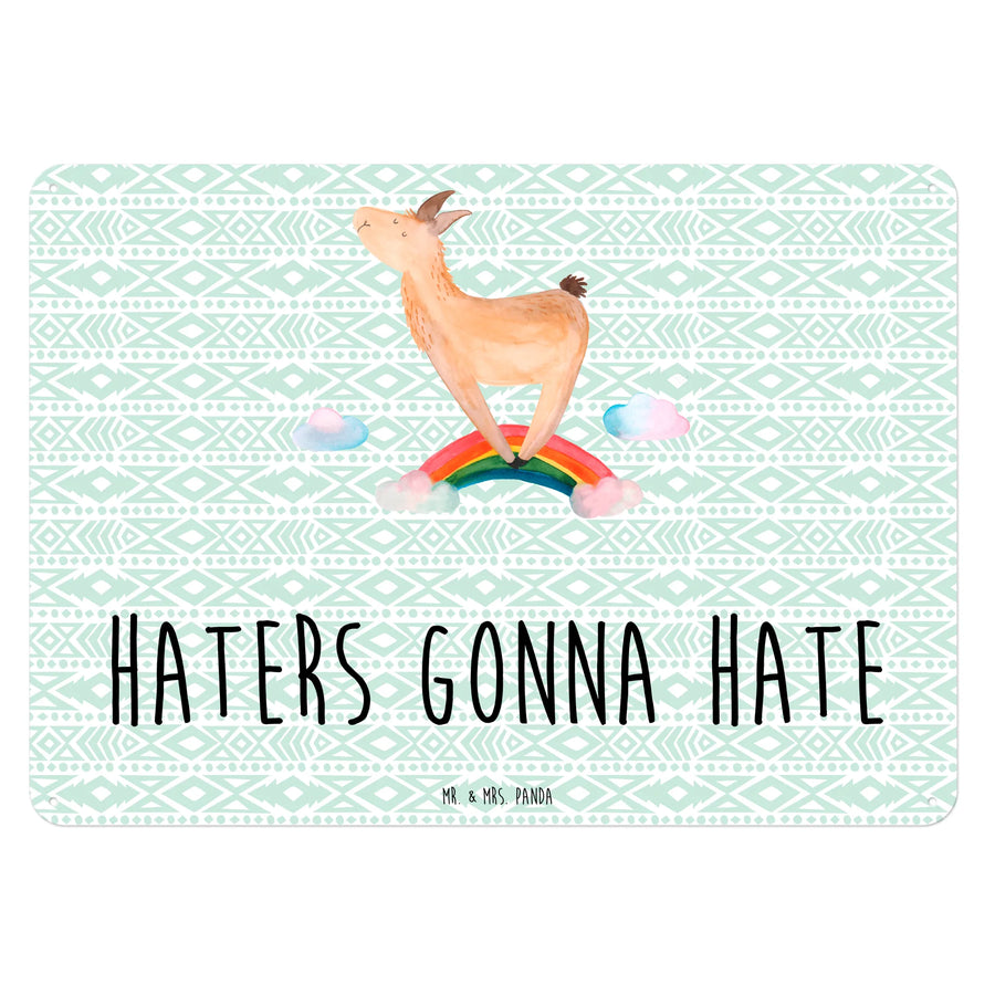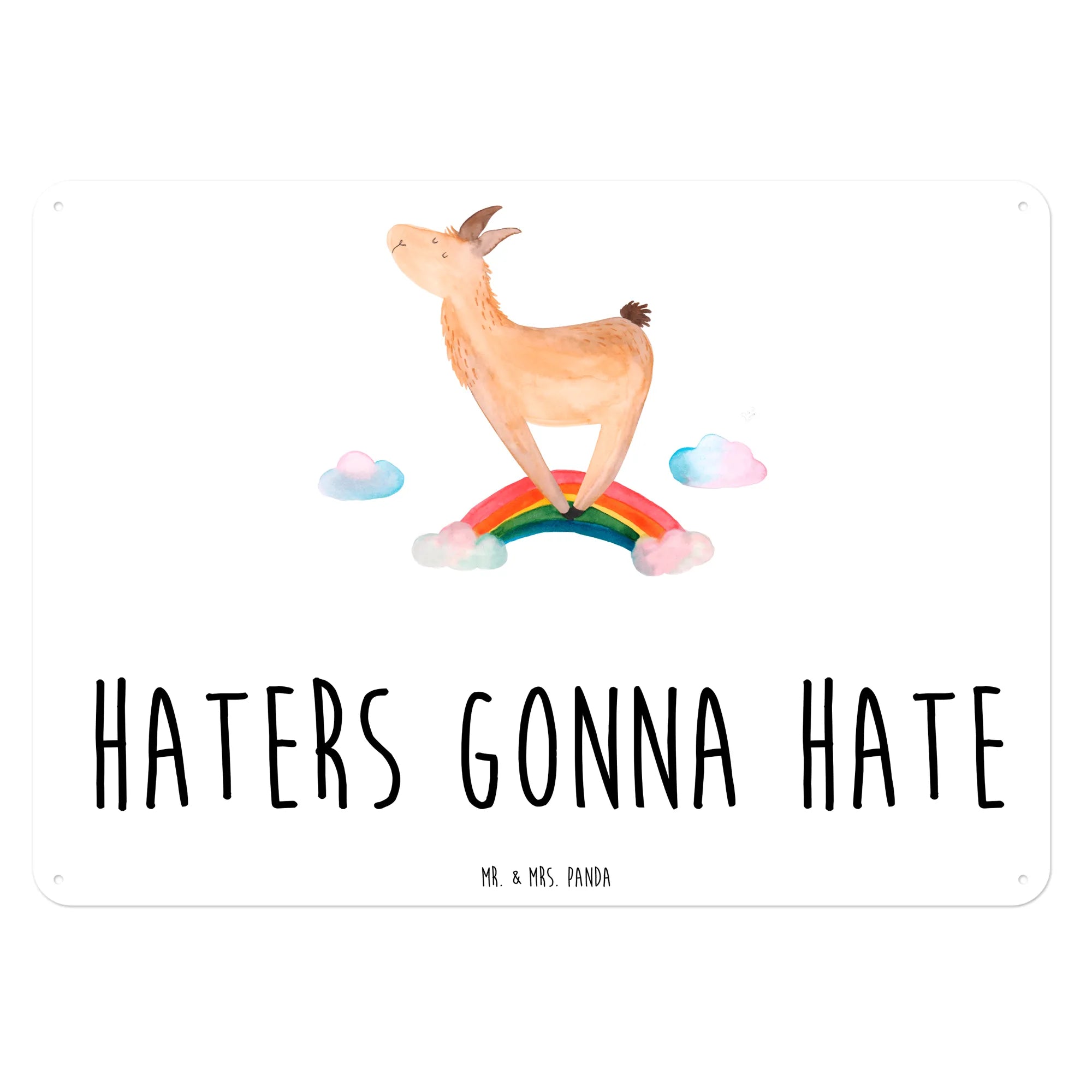 Das wunderschöne Blechschild "Lama Regenbogen" aus der Lama-Kollektion von Mr. & Mrs. Panda ist das perfekte Geschenk für alle Lama-Fans und Liebhaber von einzigartiger Wanddekoration. Mit seinem charmanten Design und dem witzigen Slogan "Haters gonna hate" bringt es Fröhlichkeit und Lebensfreude in jeden Raum. Ob in Deinem Wohnzimmer, in der Küche oder im Flur, das Schild ist ein echter Blickfang und zaubert nicht nur Dir, sondern auch Deinen Gästen ein Lächeln ins Gesicht.