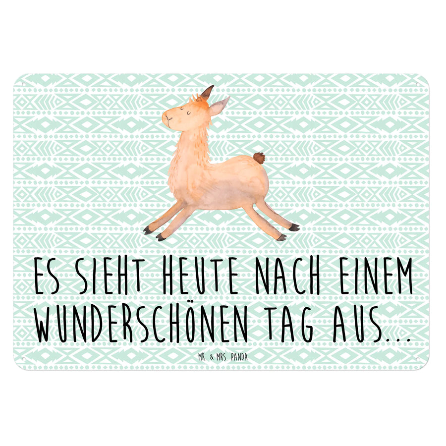 Das Blechschild mit dem springenden Lama von Mr. & Mrs. Panda ist nicht nur ein echter Blickfang für jede Wand, sondern auch das perfekte Geschenk für alle Lama-Liebhaber! Dieses liebevoll gestaltete Schild ist mit dem fröhlichen Spruch "Es sieht heute nach einem wunderschönen Tag aus..." verziert und zaubert jedem Betrachter ein Lächeln ins Gesicht.