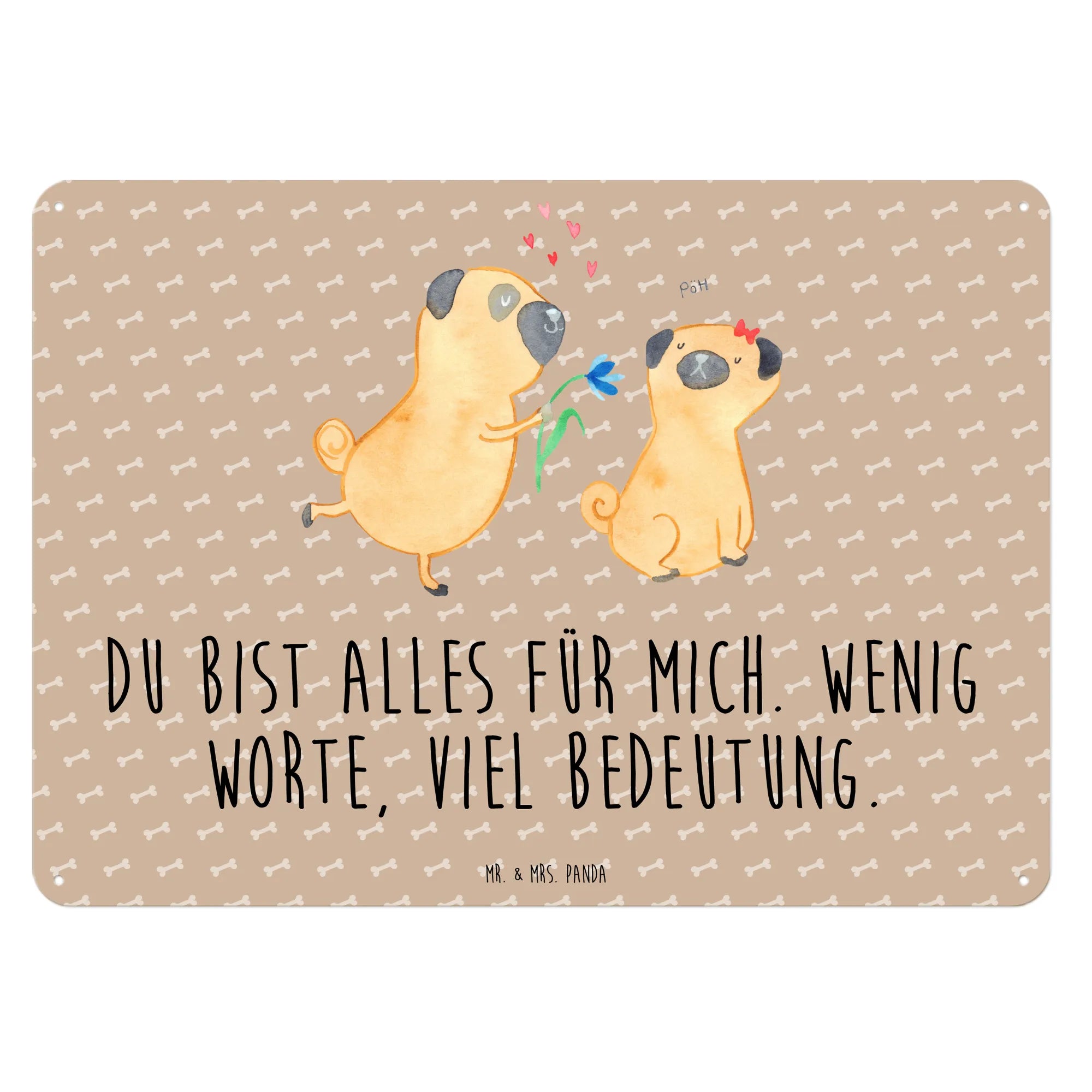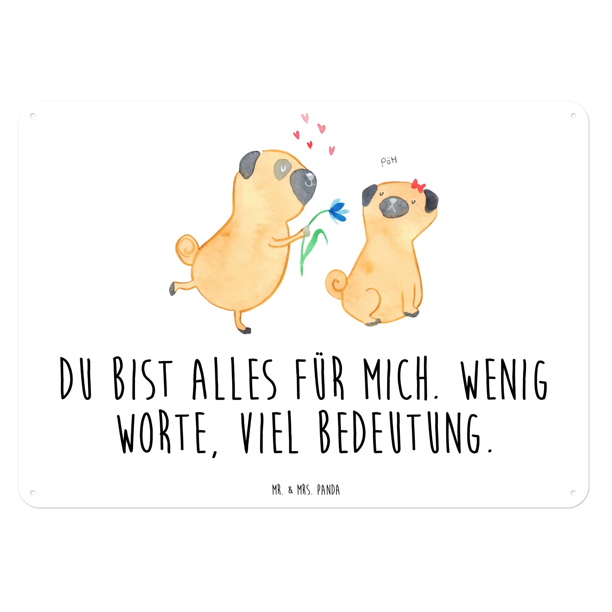 Das wunderschöne und edle Blechschild mit dem Motiv "Mops verliebt" von Mr. & Mrs. Panda ist das perfekte Geschenk für all die Hundeliebhaber da draußen! 🐶❤️ Mit seinen zwei süßen Mopsen, die verliebt dast stehen und sich eine Blume schenken, bringt dieses Schild nicht nur Farbe in dein Zuhause, sondern auch eine ganz besondere Botschaft: 'Du bist alles für mich. Wenig Worte, viel Bedeutung.' Es ist ideal für die Wand oder die Tür und verwandelt jeden Raum in ein liebevolles Zuhause.