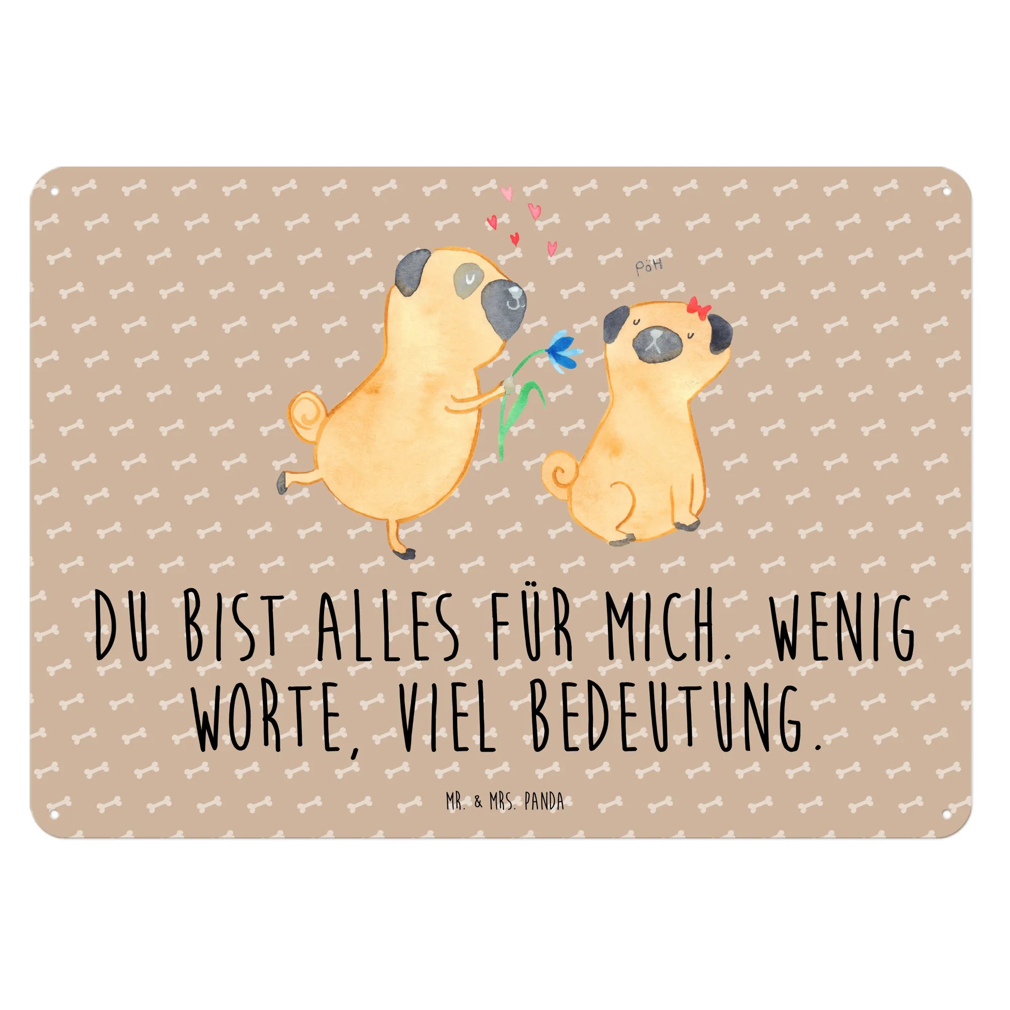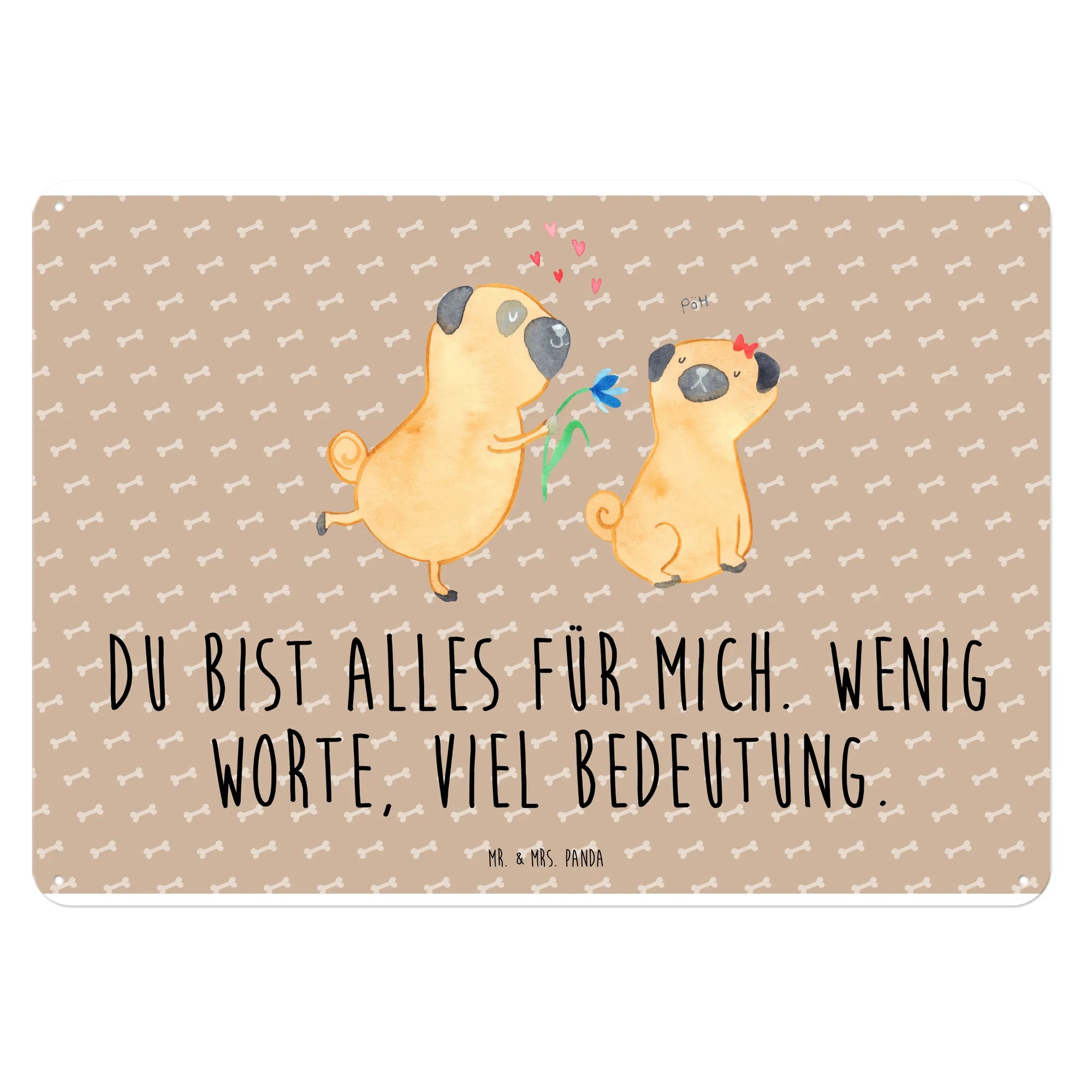 Entdecke das wunderschöne Blechschild "Mops verliebt" von Mr. & Mrs. Panda! Dieses edle Metallschild zeigt zwei süße Möpse, die verliebt beieinander stehen, während einer dem anderen eine Blume schenkt. Es ist nicht nur eine zauberhafte Dekoration für dein Zuhause, sondern auch eine ideale Geschenkidee für jeden Hundeliebhaber.
