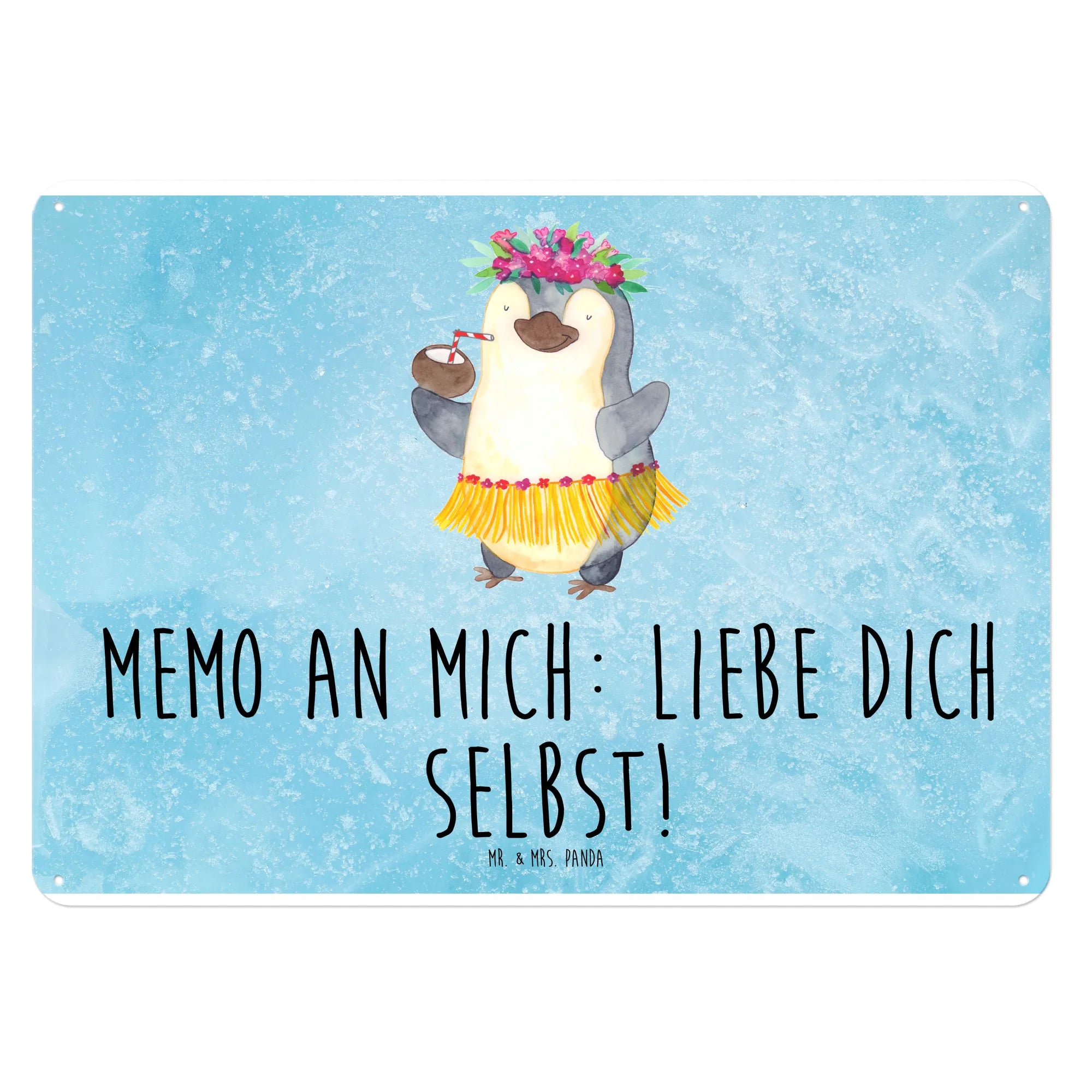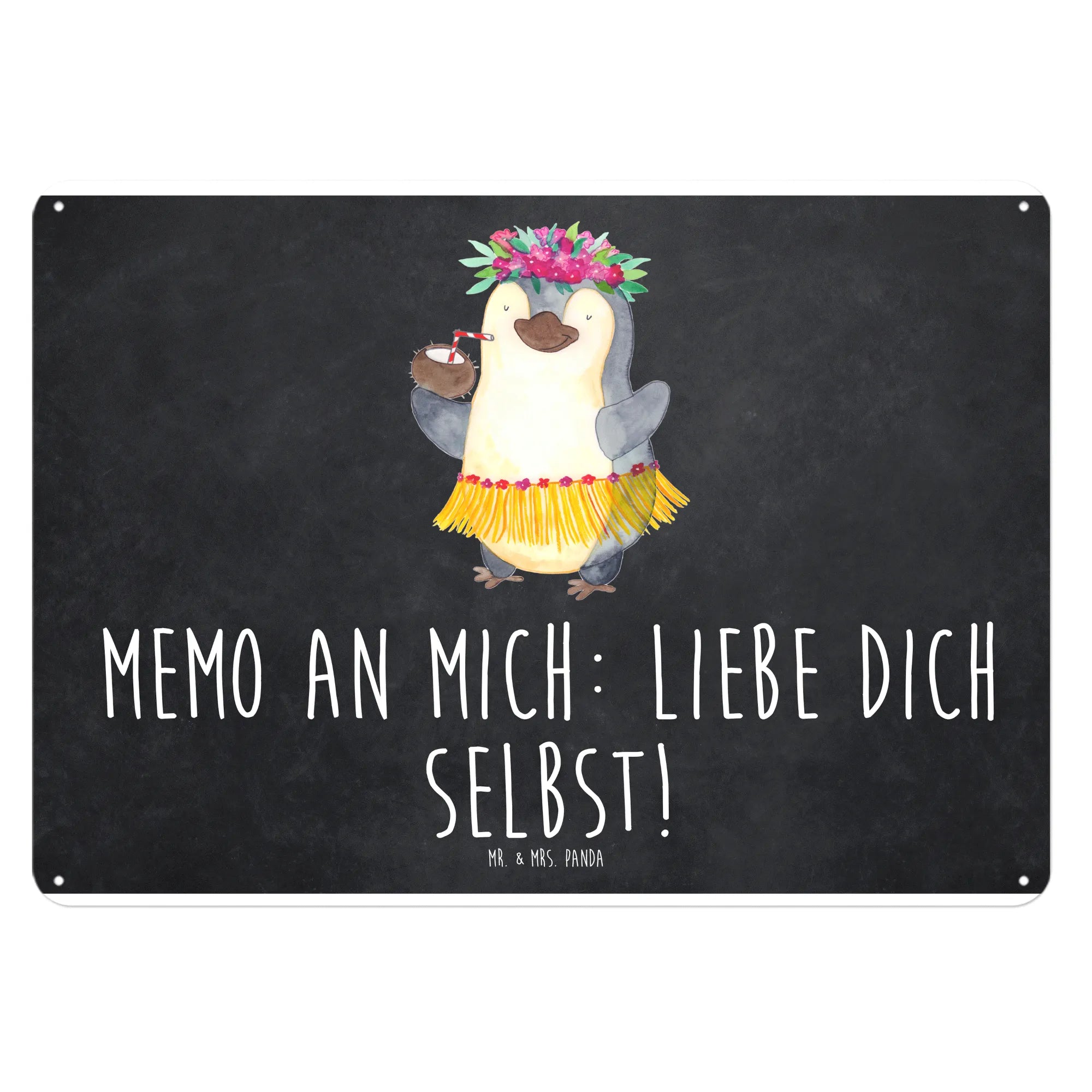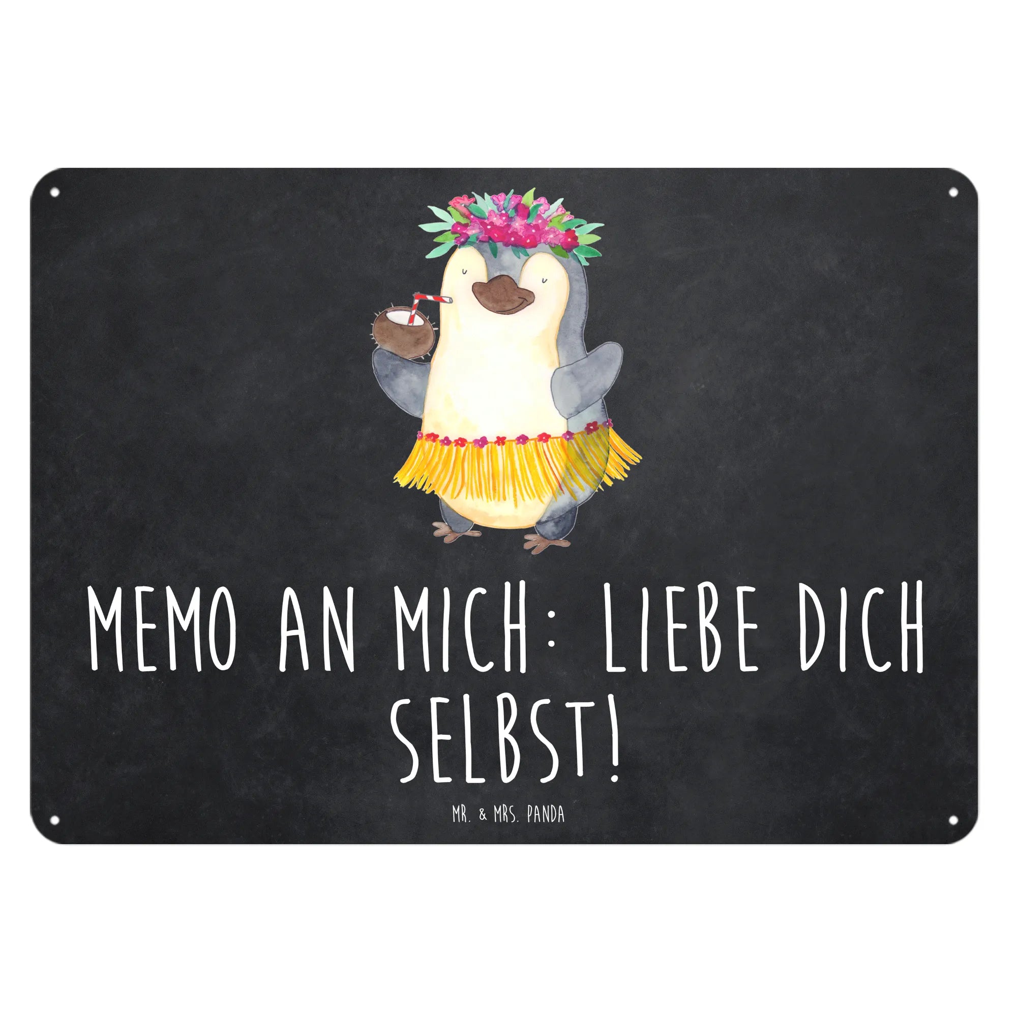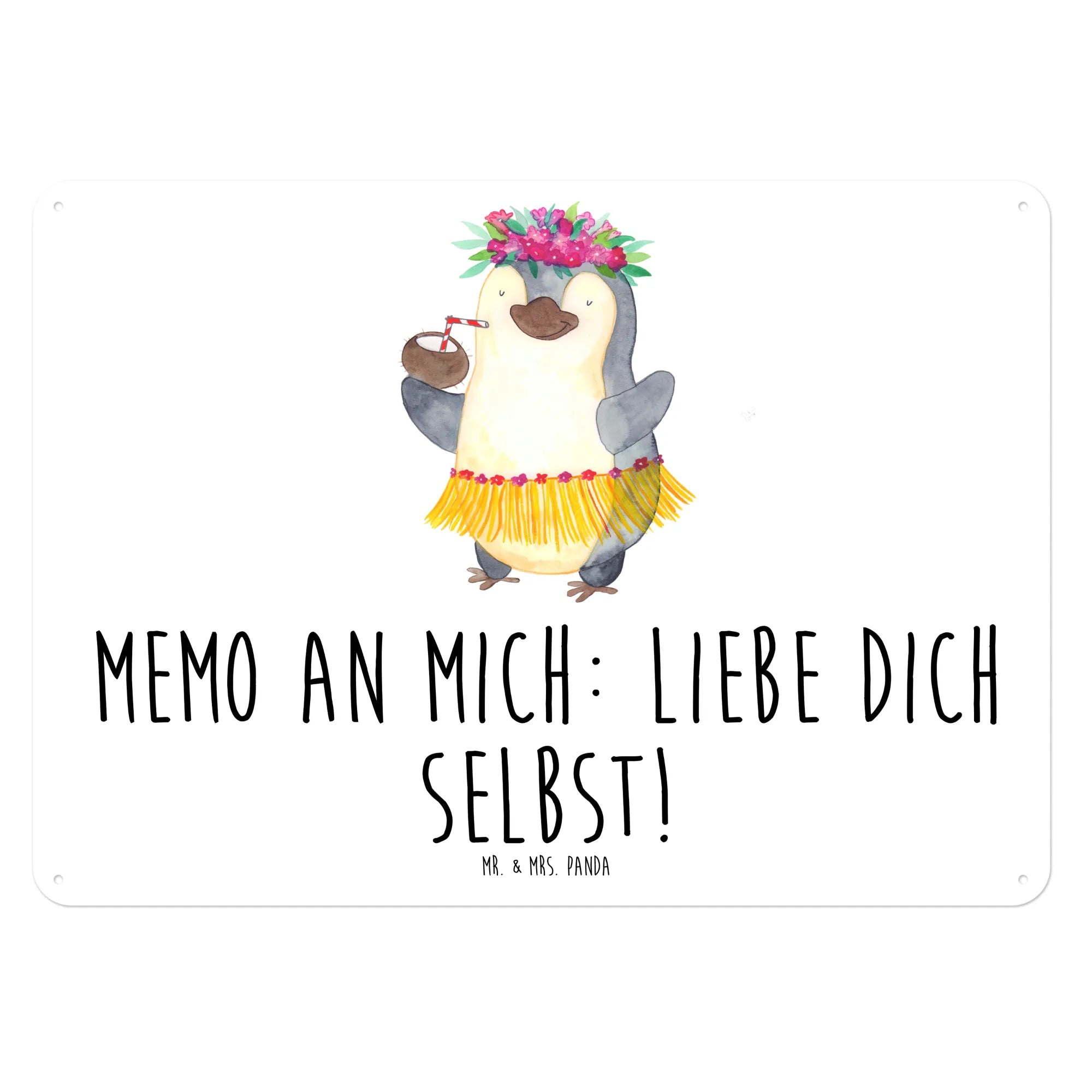 Das hübsche Blechschild mit dem süßen Pinguin Kokosnuss aus der Pinguin-Kollektion von Mr. & Mrs. Panda ist das perfekte Geschenk für alle, die Lebensfreude und fröhliche Dekoration schätzen. Mit dem charmanten Design eines Pinguins, der mit einer Kokosnuss und einem Strohhalm in der Hand fröhlich in der Sonne tanzt, bringt dieses Schild gute Laune in jedes Zuhause. Es eignet sich ideal als Wandschild, um deinen eigenen vier Wänden einen Hauch von Urlaub und tropischer Fröhlichkeit zu verleihen. Der Spruch "Memo an mich: Liebe dich selbst!" erinnert dich daran, wie wichtig es ist, sich selbst zu lieben und zu schätzen.