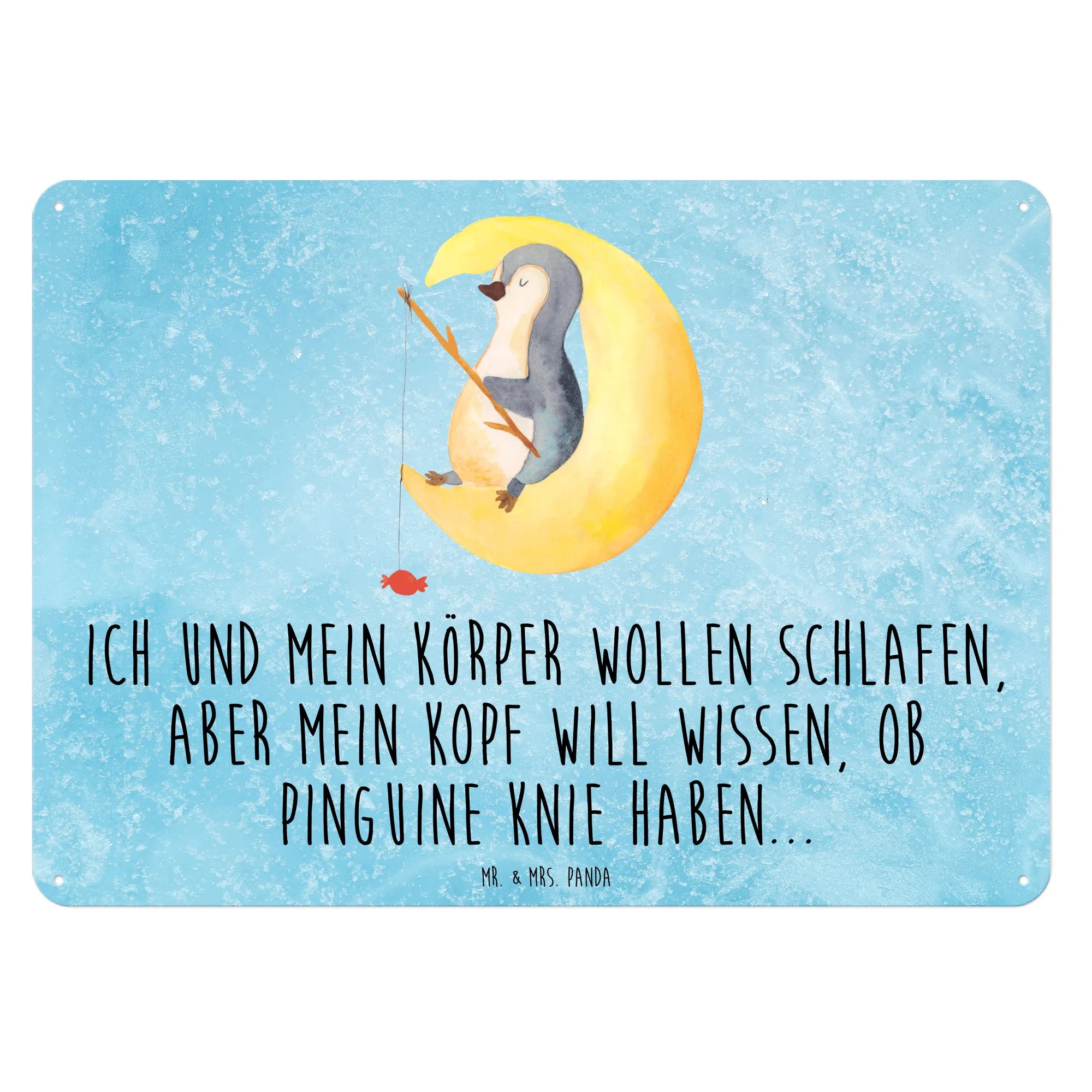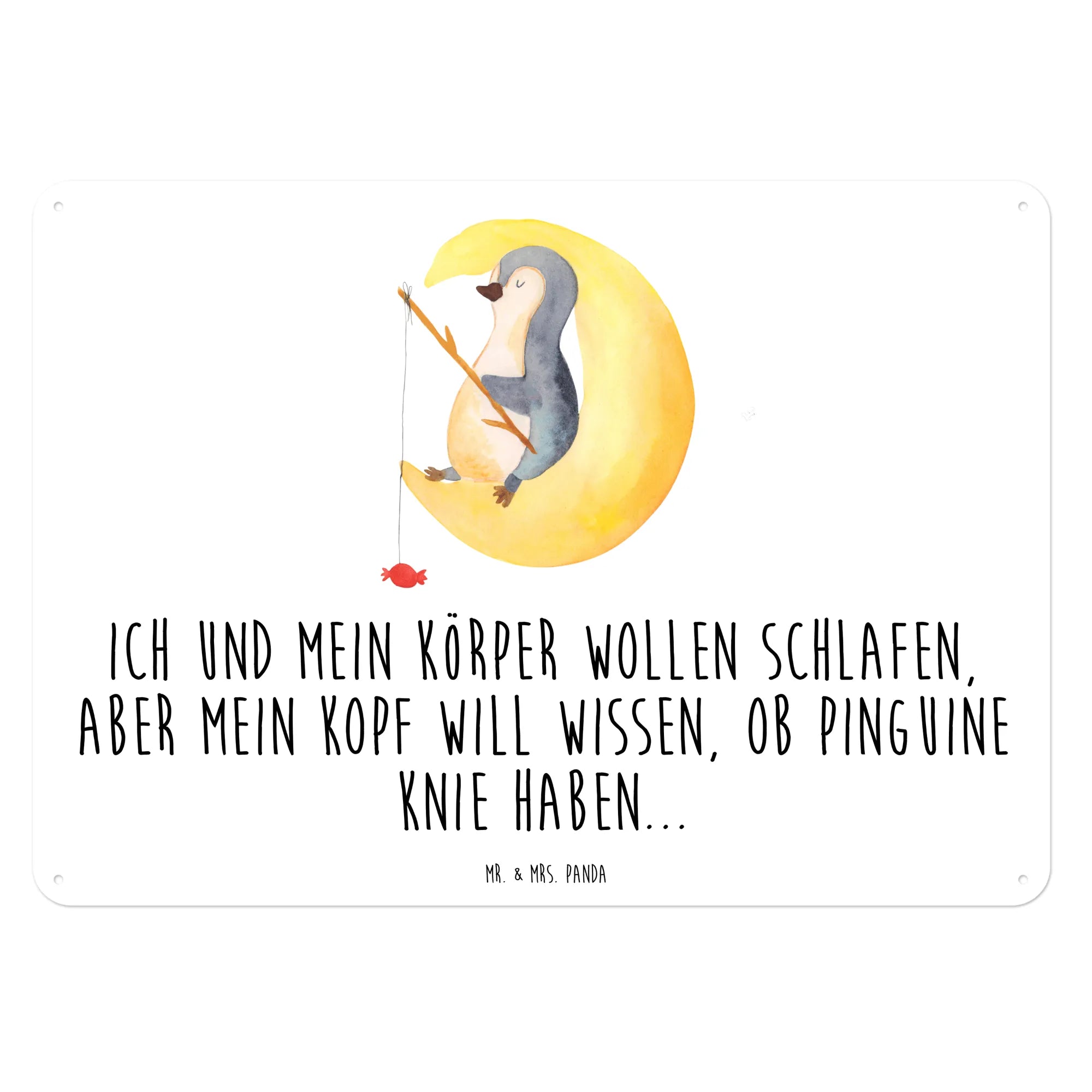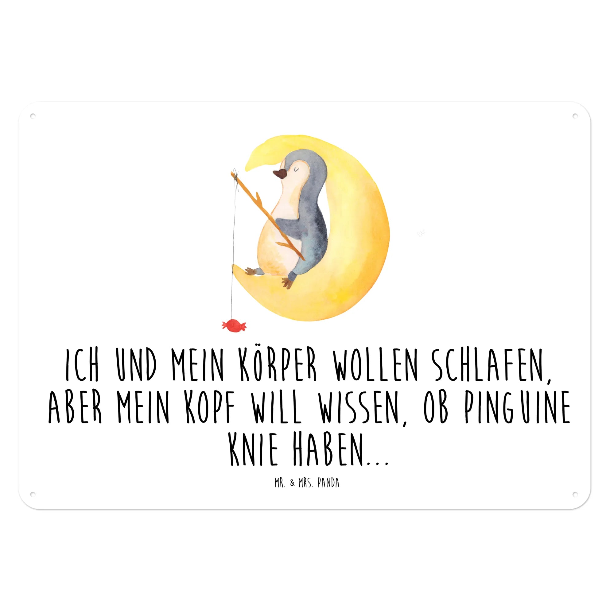 Das wunderschöne Blechschild "Pinguin Mond" aus der exklusiven Pinguin-Kollektion von Mr. & Mrs. Panda ist der perfekte Begleiter für alle, die ihr Zuhause mit einem Hauch von Humor und Stil dekorieren möchten. Das Schild zeigt einen süßen Pinguin, der gemütlich auf einer Mondsichel sitzt und mit einer Angel nach Sternen fischt – das perfekte Motiv für dein Schlafzimmer oder Gästezimmer! Mit dem Spruch "Ich und mein Körper wollen schlafen, aber mein Kopf will wissen, ob Pinguine Knie haben..." bringt es nicht nur ein Schmunzeln, sondern sorgt auch für eine entspannte Nachtruhe.