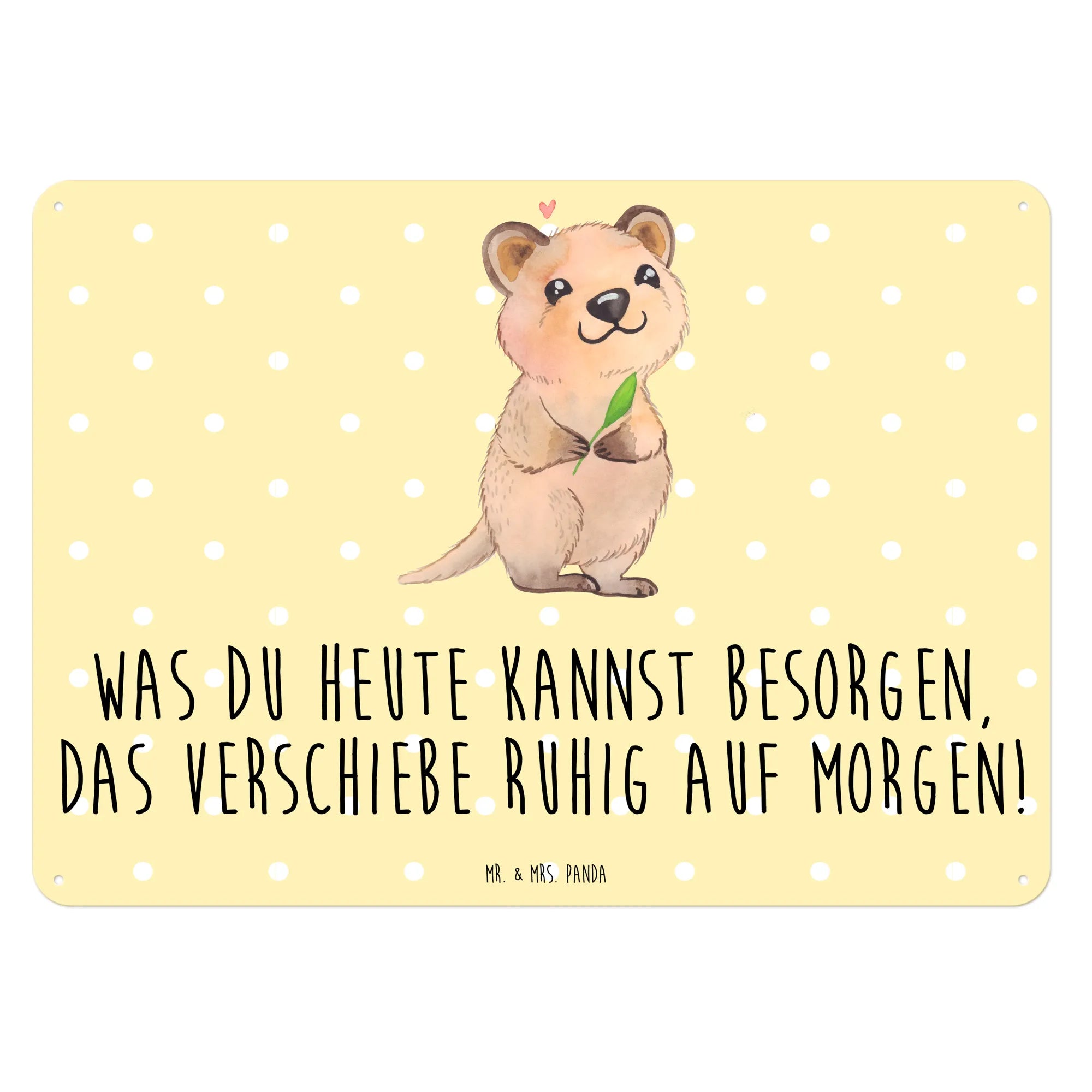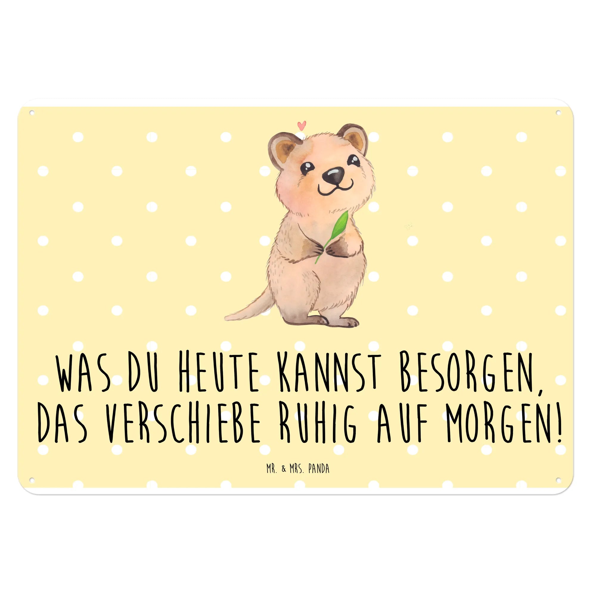 Mit seiner liebevollen Darstellung eines fröhlichen Quokkas, das auf einem gelben Hintergrund steht, ist dieses Schild nicht nur ein Blickfang, sondern auch eine Erinnerung daran, das Leben ein wenig leichter zu nehmen. Der witzige Spruch 'Was du heute kannst besorgen, das verschiebe ruhig auf morgen!' sorgt für ein Schmunzeln und motiviert gleichzeitig dazu, es sich nicht zu schwer zu machen.