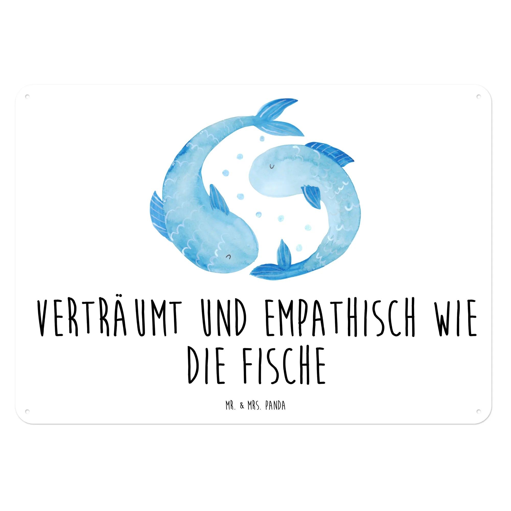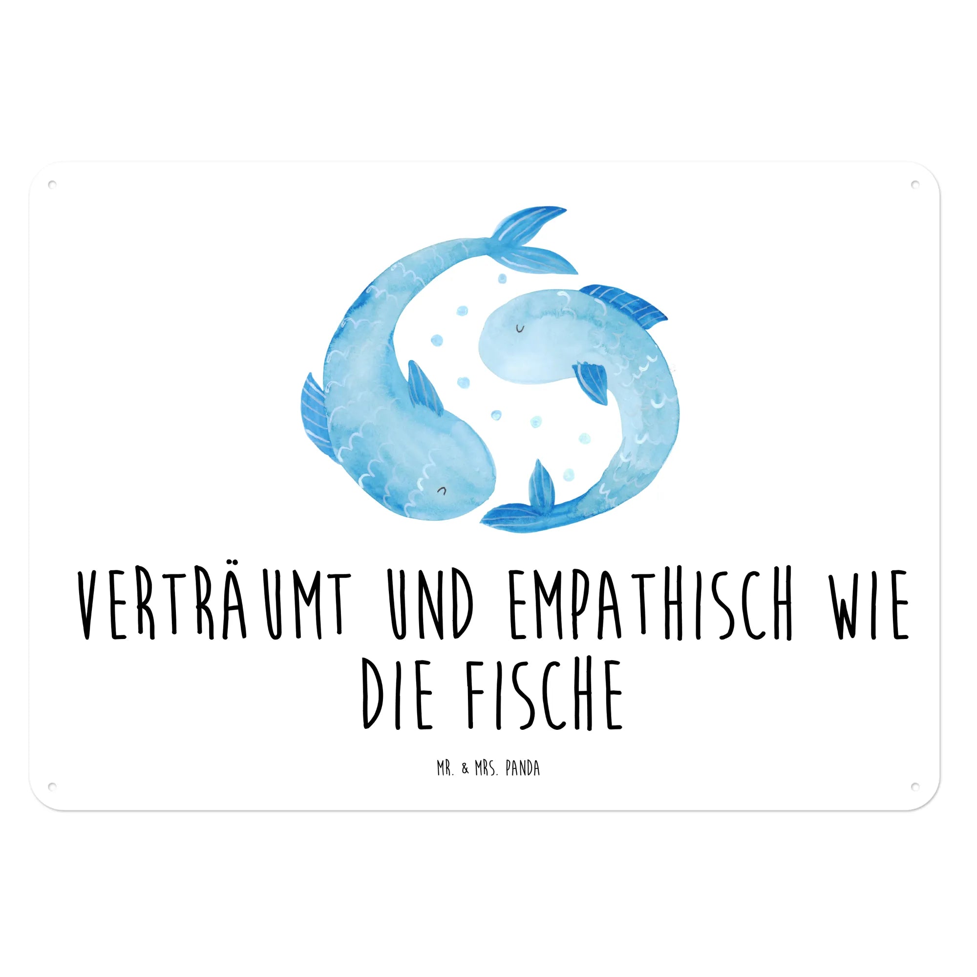 Entdecke das bezaubernde Blechschild mit dem Motiv des Sternzeichens Fische von Mr. & Mrs. Panda! Dieses hochwertige Metallschild bringt eine süße und liebevolle Note in dein Zuhause. Mit dem Slogan "Verträumt und empathisch wie die Fische" und der liebevoll handgezeichneten Darstellung von zwei Fischen, die im Wasser schwimmen, ist es der perfekte Begleiter für jeden Fische-Geburtstag.