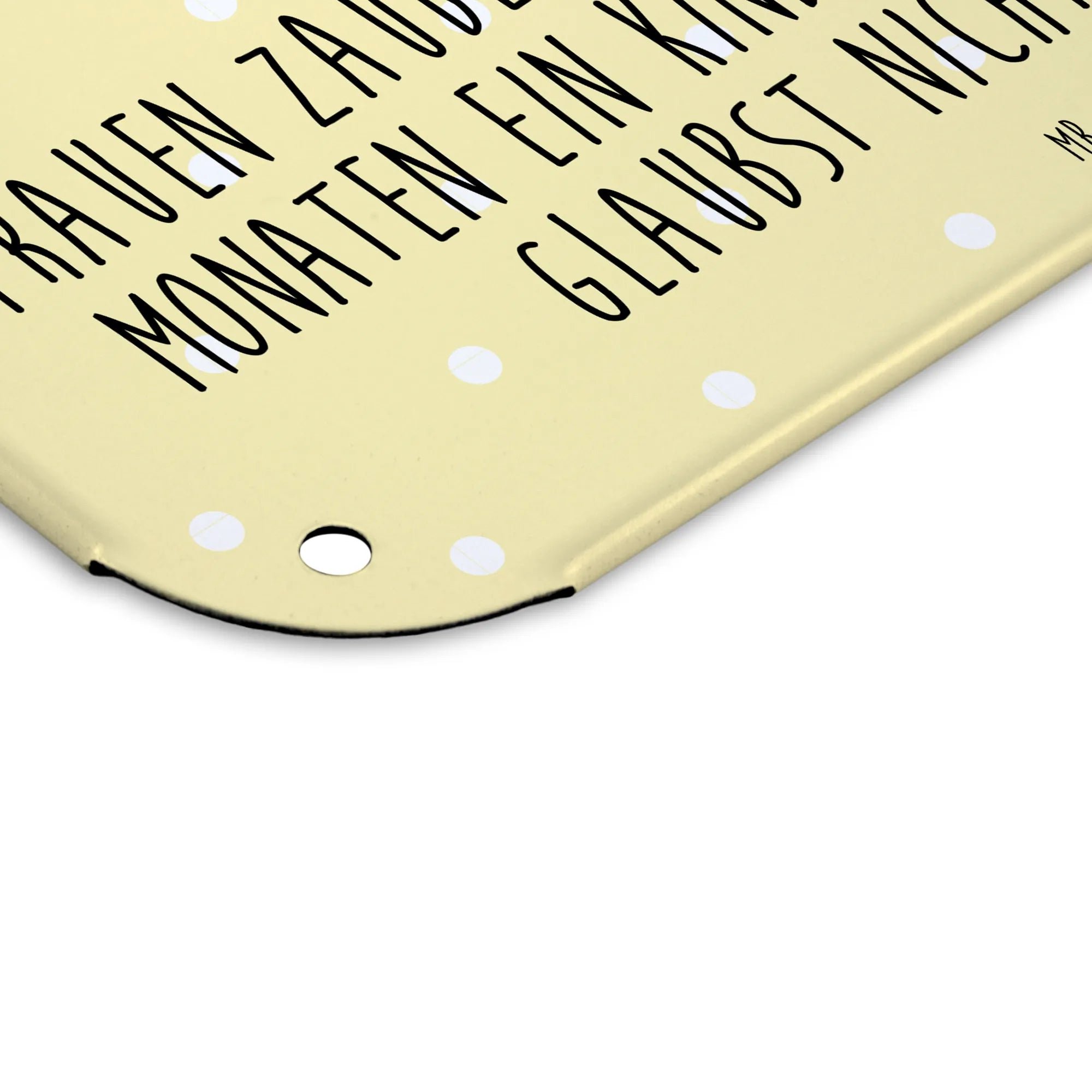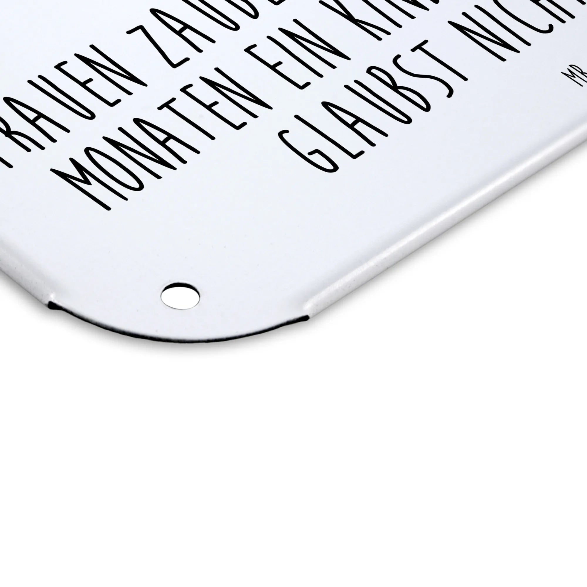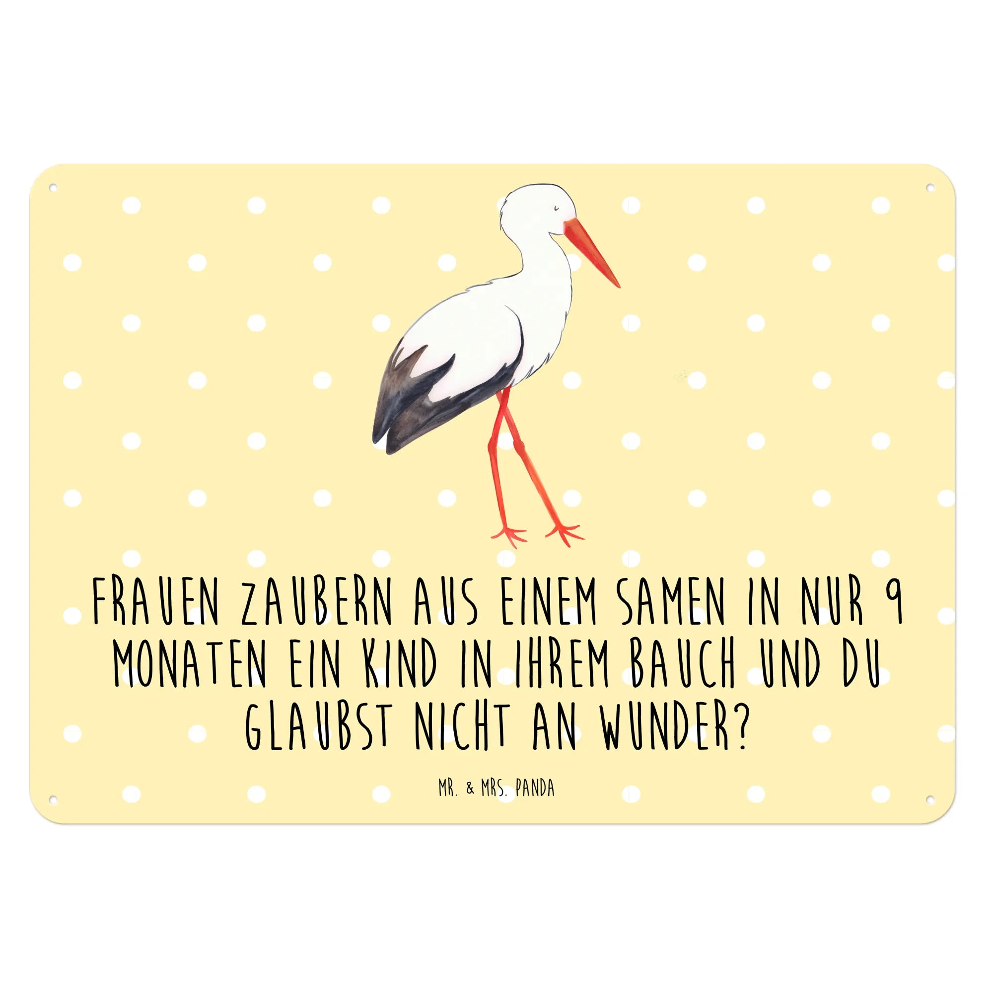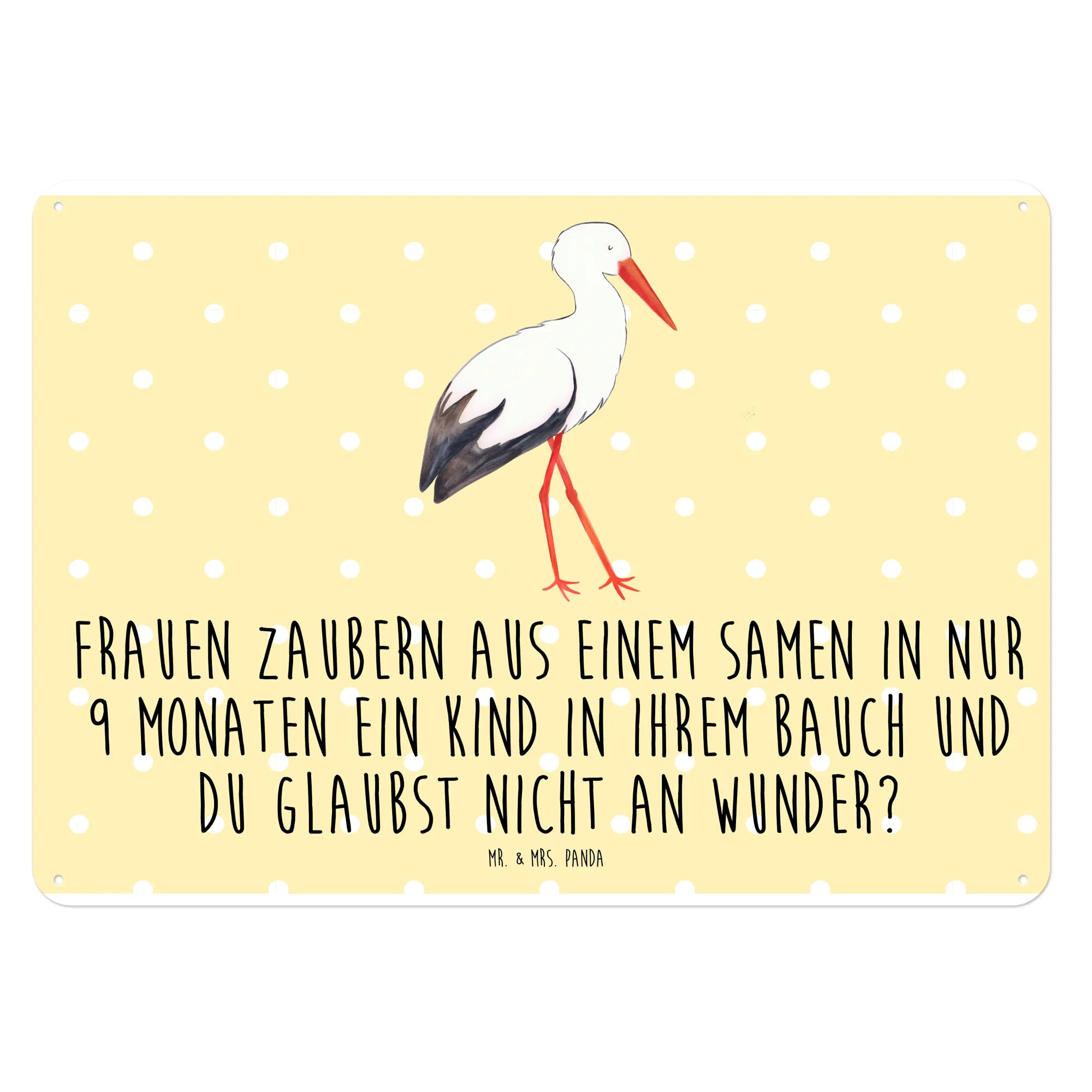 Das Blechschild mit dem niedlichen Motiv eines Storches von Mr. & Mrs. Panda ist das perfekte Geschenk für werdende Mütter, frischgebackene Eltern oder als Deko-Element zur Ankündigung einer Schwangerschaft. Es zeigt einen süßen Storch, der ein Baby in einem Tuch trägt, und darunter steht der liebevolle Spruch: "Frauen zaubern aus einem Samen in nur 9 Monaten ein Kind in ihrem Bauch und du glaubst nicht an Wunder?" Dieses Schild ist ideal, um Freude und Gute Laune zu verbreiten.