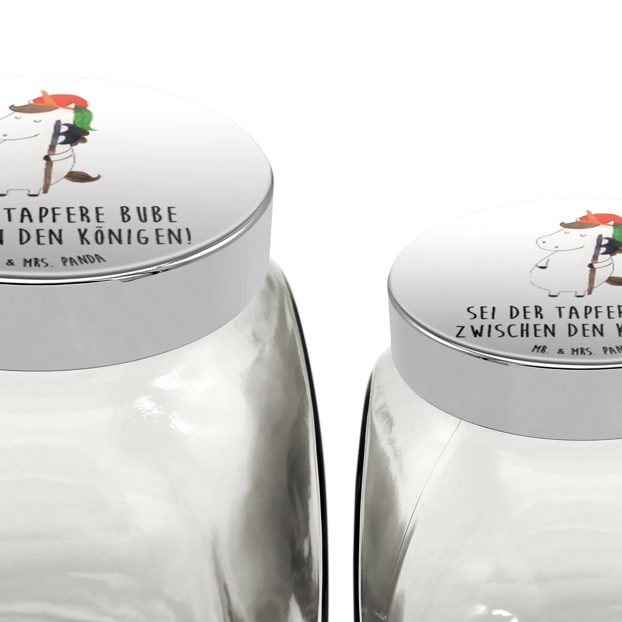 Das Einhorn Bube hat einen freundlichen Ausdruck und trägt einen Helm, wodurch es seinem kindlich-charmanten Charakter einen zusätzlichen Schliff verleiht. Der dazugehörige Slogan 'Sei der tapfere Bube zwischen den Königen!' macht das Bonbonglas zu einem besonderen Geschenk für Kinder und Junggebliebene.